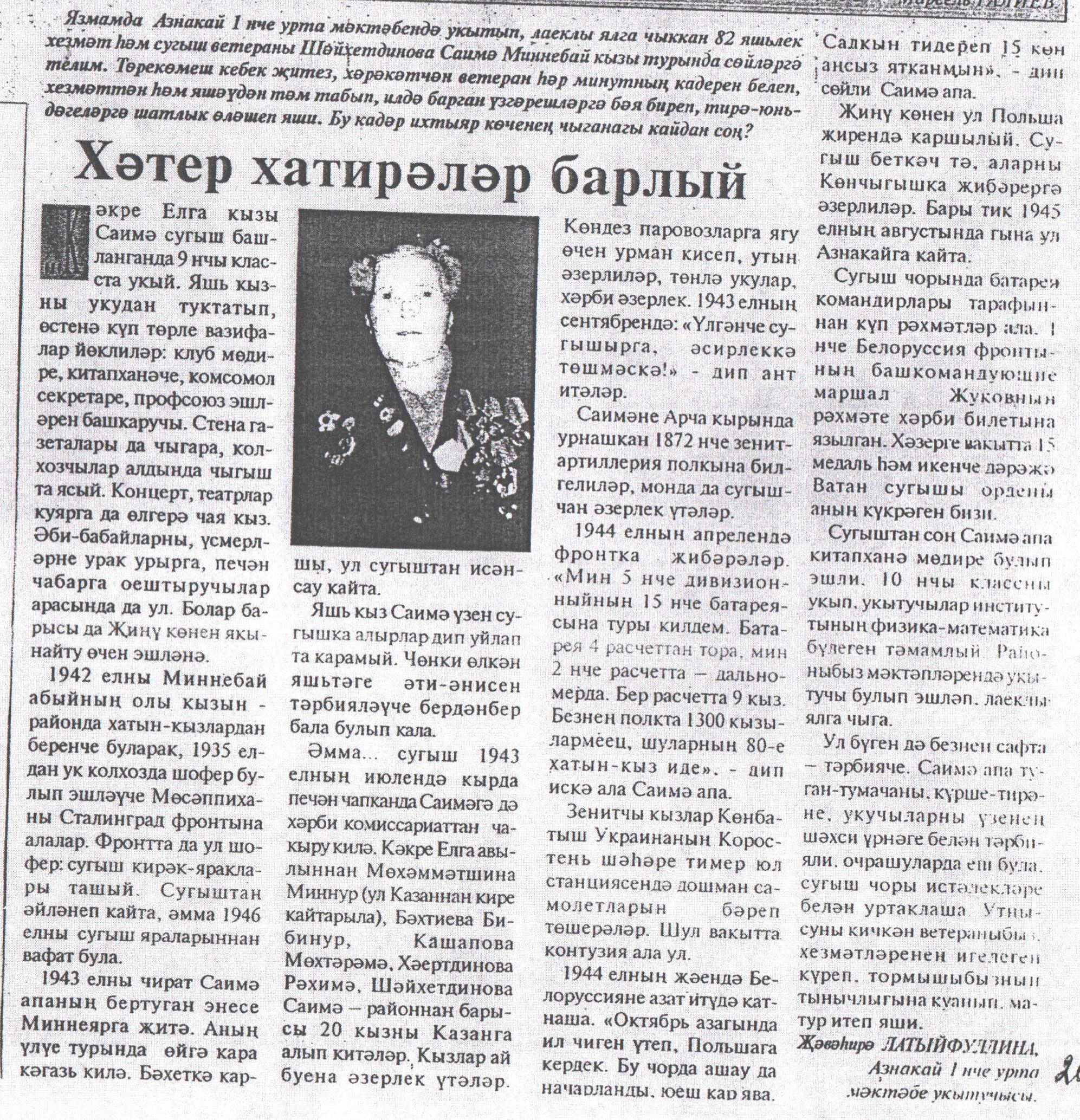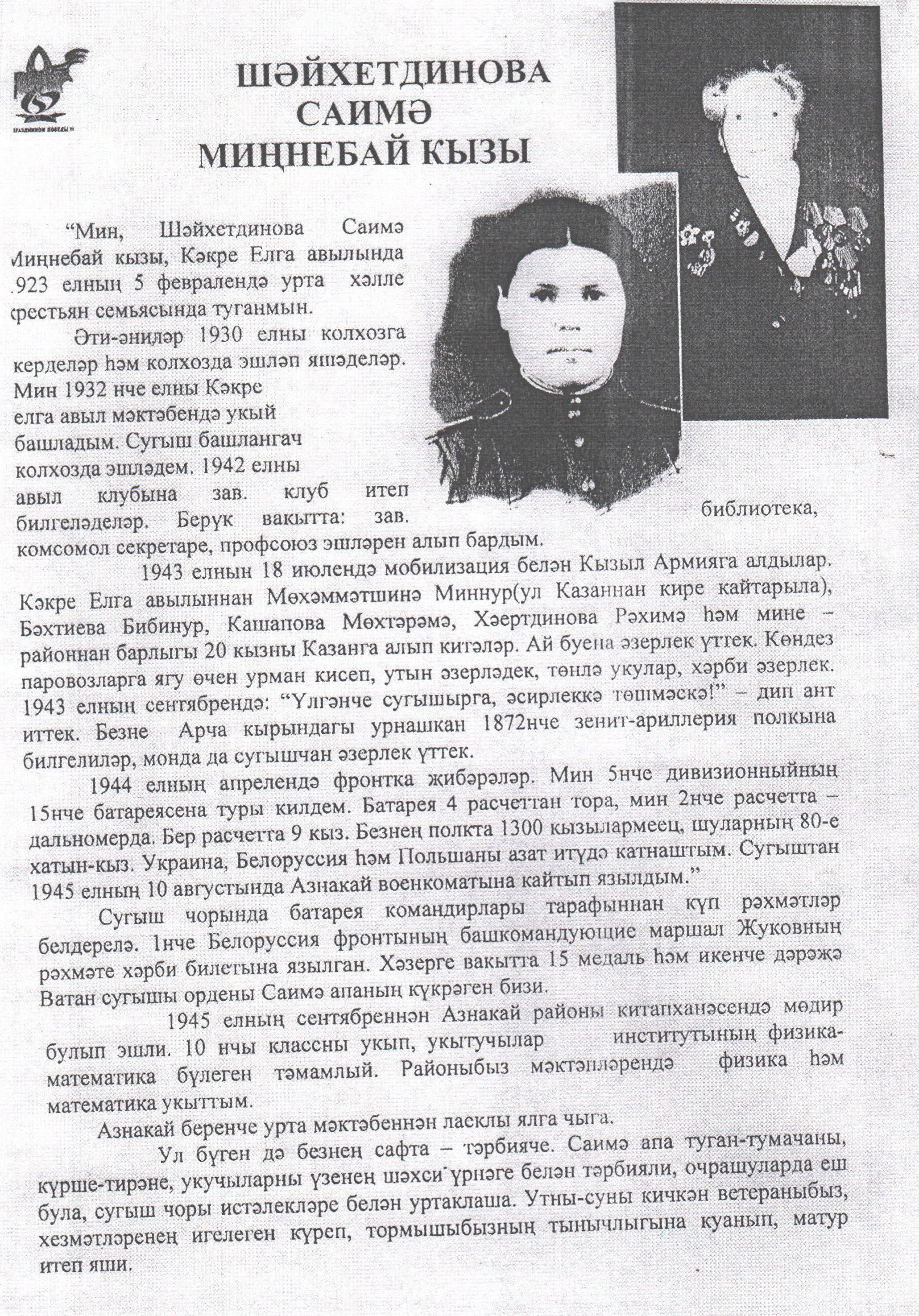 Шайхутдинова Саима Миннебаевна родилась в Азнакаевском районе в деревне Какре Елга. В армию призвана в 1943 году. С 1943 по 1945 гг. служила в рядах Советской Армии. Служила также в зенитно-артиллерийском полку. Имеет пять медалей. В 1944 году участвовала в освобождении Украины, Белоруссии, Польши. Имеет благодарность от Г. Жукова, который руководил 1-м белорусским фронтом. Награждена 15-ю медалями и орденом Отечественной войны 2 степени. В 1953 году окончила педагогический институт. После войны работала учителем математики, воспитателем в средней школе № 1.