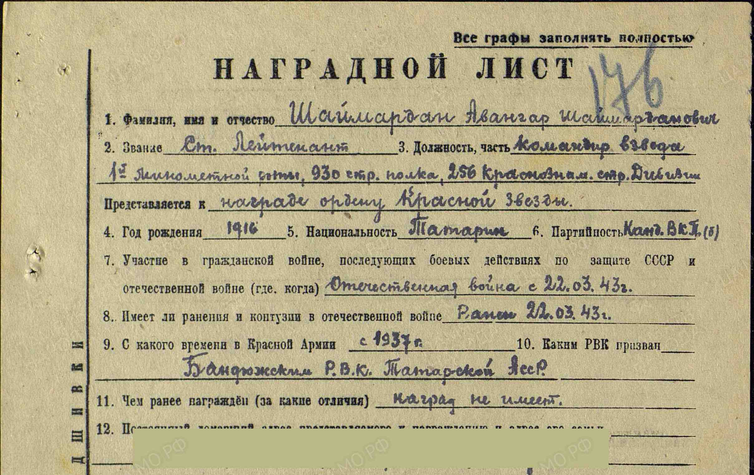 Награжден орденом Красной Звезды 16.08.1943 г.