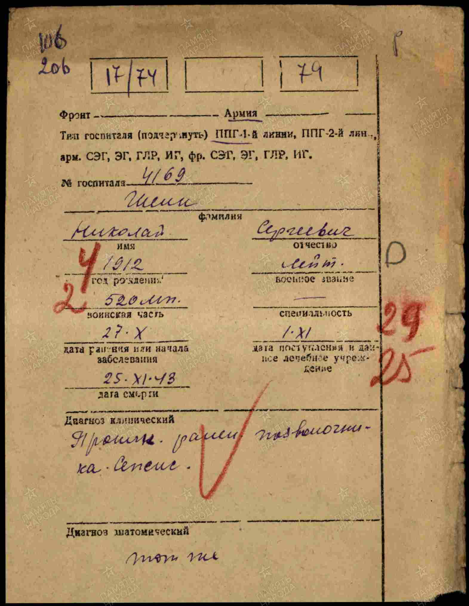 ШЕИН Николай Сергеевич, 1913, с. Левашёво. Мобилизован 28 июля 1941 Алексеевским РВК, сержант. На фронте с 1 дек. 1941. Пом. ком. взвода, 1122 СП 334 СД 4 УдА Северо-Западного/ Калининского фронта. Повышен в звании до офицера, мл. лейтенант, ком. взвода. В боях перенёс два ранения: 19 нояб. 1942, 27 фев. 1943. Проходил лечение в ЭГ 3443, г. Торжок, ЭГ 1075, п. Малаховка, Московская обл. Награждён орденом Красной Звезды. В 1943 – лейтенант, ком. взвода 525 МинП 1 гв. А Юго-Западного фронта. Участвовал в боях за Днепр. Тяжело ранен в грудь с повреждением позвоночника 27 окт. 1943. 1 нояб. 1943 поступил в ХППГ 4169, п. Михайловка, Михайловский р-н, Запорожская обл., УкрССР. Умер 25 нояб. 1943 от сепсиса.