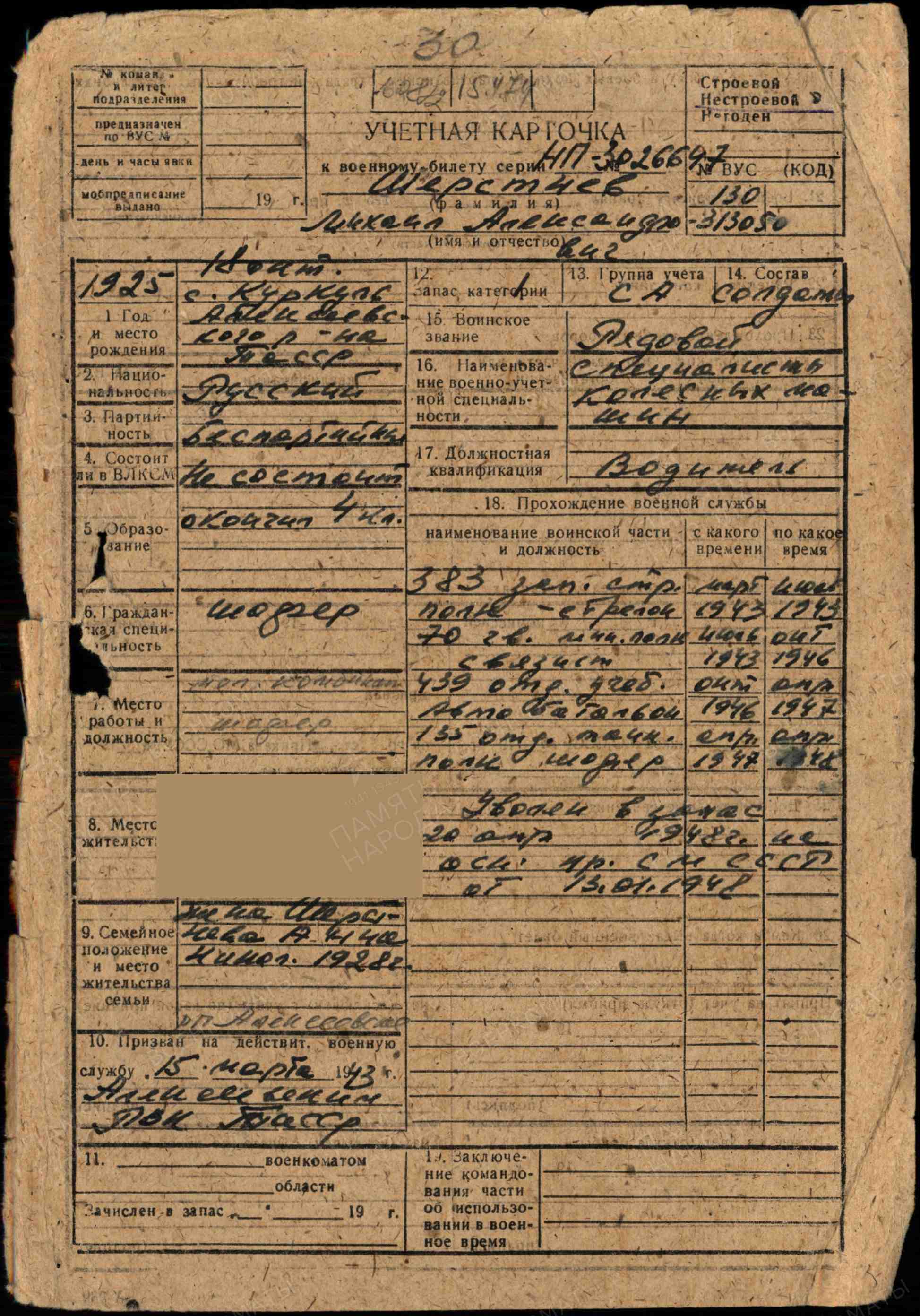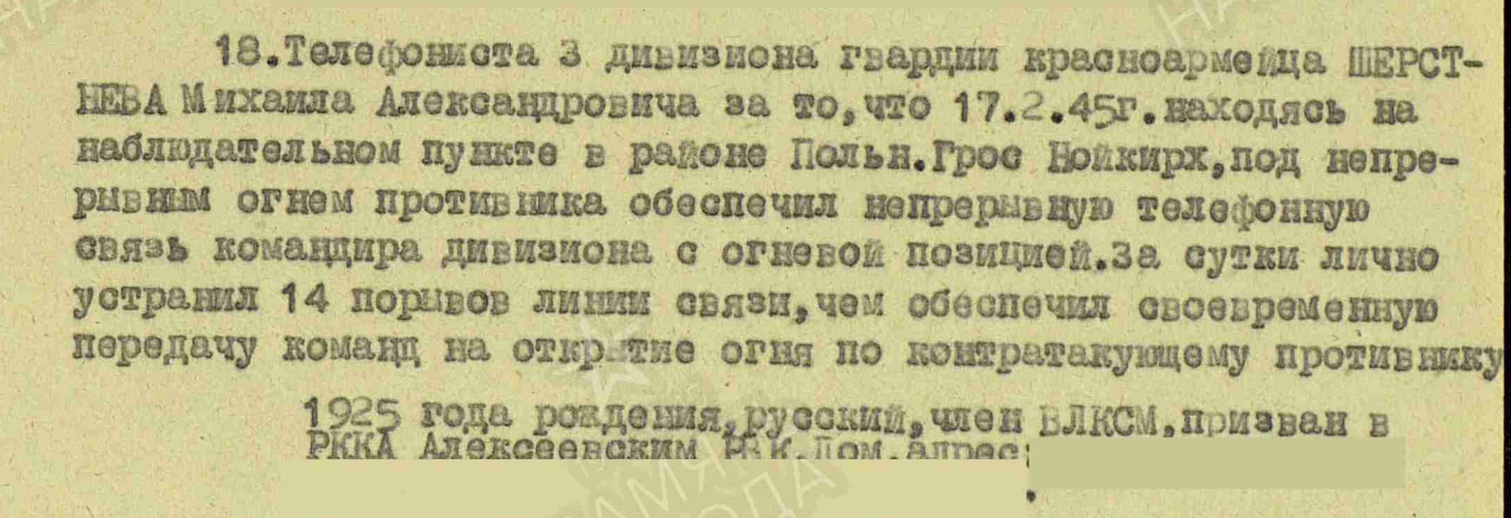 ШЕРСТНЁВ Михаил Александрович, 1925, с. Куркуль. До призыва в армию работал в к-зе "Ясная поляна". Член ВЛКСМ. Мобилизован Алексеевским РВК 15 марта 1943. С мая 1944 воевал на Ленинградском и 1 Украинском фронте в составе 23 А/ 59 А. Гв. красноармеец, телефонист дивизиона 70 гв. МинП. Участник боёв на Карельском перешейке, освобождения Польши. Под огнём противника многократно исправлял повреждённую обстрелом проводную связь, исправляя многочисленные порывы. Демобилизован 20 апр. 1948. Работал шофёром на Алексеевском молочном комбинате. Награждён двумя медалями "За боевые заслуги" (1944, 1945), орденом Отечественной войны 2 ст. (1985). Умер в 1994.