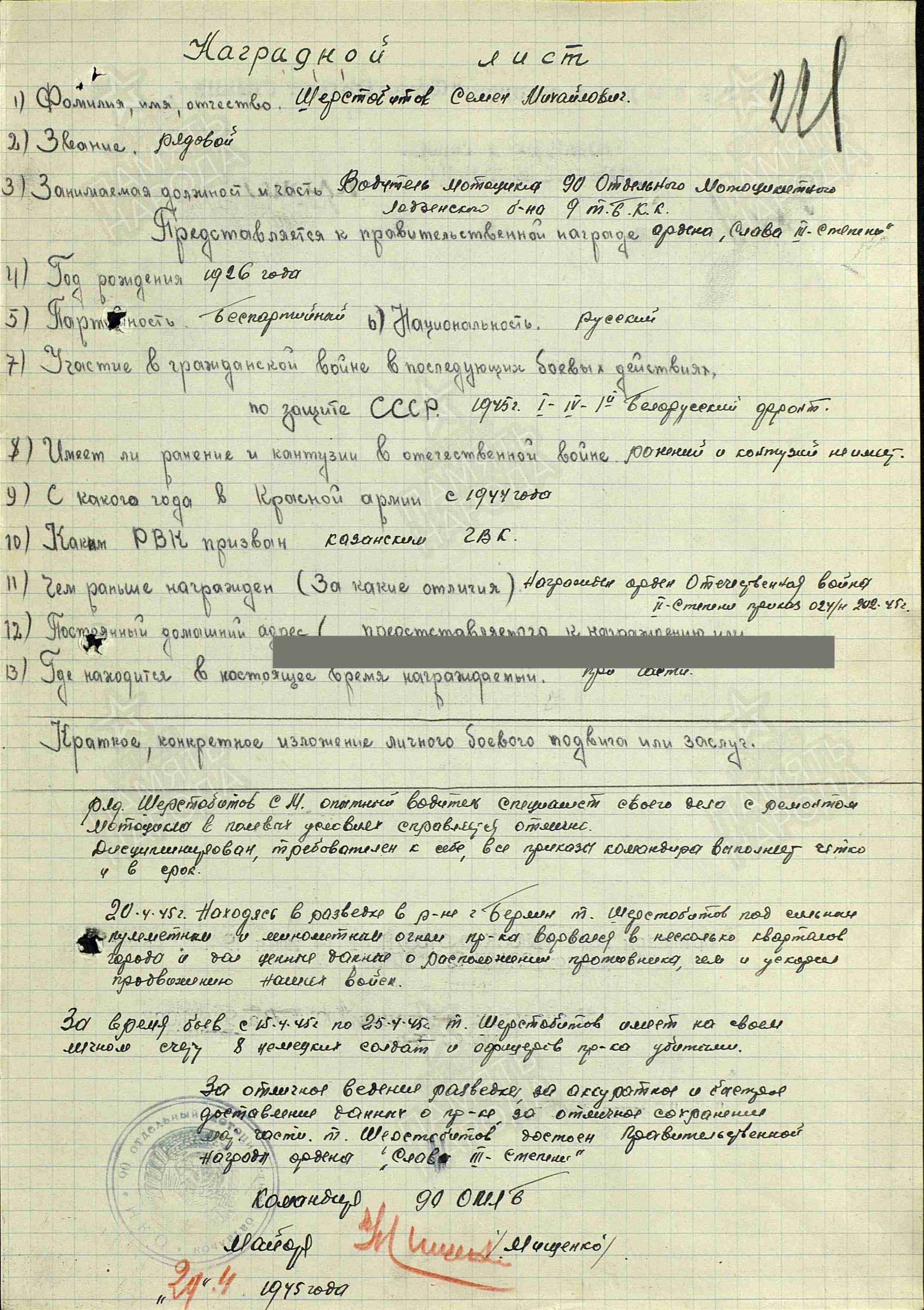 ШЕРСТОБИТОВ Семён Михайлович, 1926, с. Билярск. Мобилизован Ленинским РВК г. Казань 5 нояб. 1943. Красноармеец. На фронте с янв. 1945. Водитель мотоцикла 90 отд. мотоциклетного батальона 9 ТК 1 БелФ. 24 янв. 1945, в р-не г. Радом, находясь вместе с экипажем в разведке и внезапно столкнувшись с вражеской колонной, завязал бой, заменил выбывшего пулемётчика, огнём пулемёта вывел из строя до 50 немецких солдат, захватил в плен одного офицера, доставил в штаб ценные сведения о противнике. 25 янв. 1945, во время разведки переправы у г. Опатувек, огнём автомата рассеял группу немцев, семерых взял в плен. В этом бою был легко ранен. 20 апр. 1945, на улицах Берлина, под сильным пулемётным и миномётным огнём врага, провёл разведку сил противника в нескольких городских кварталах и доставил ценные данные о его расположении, чем ускорил продвижение наших войск. Награждён орденами Отечественной войны 2 ст. (1945), Славы 3 ст, медалями «За освобождение Варшавы», «За взятие Берлина».