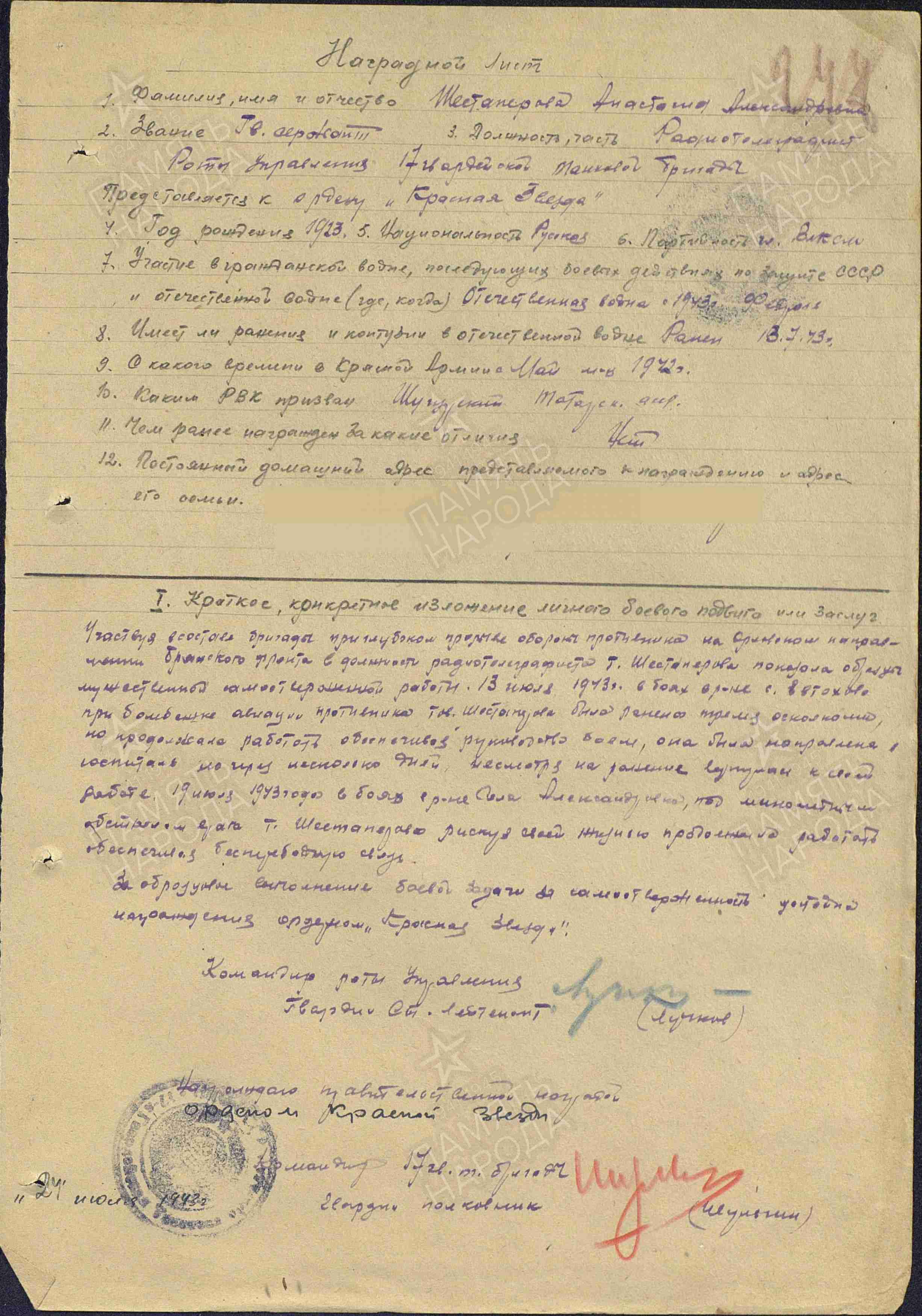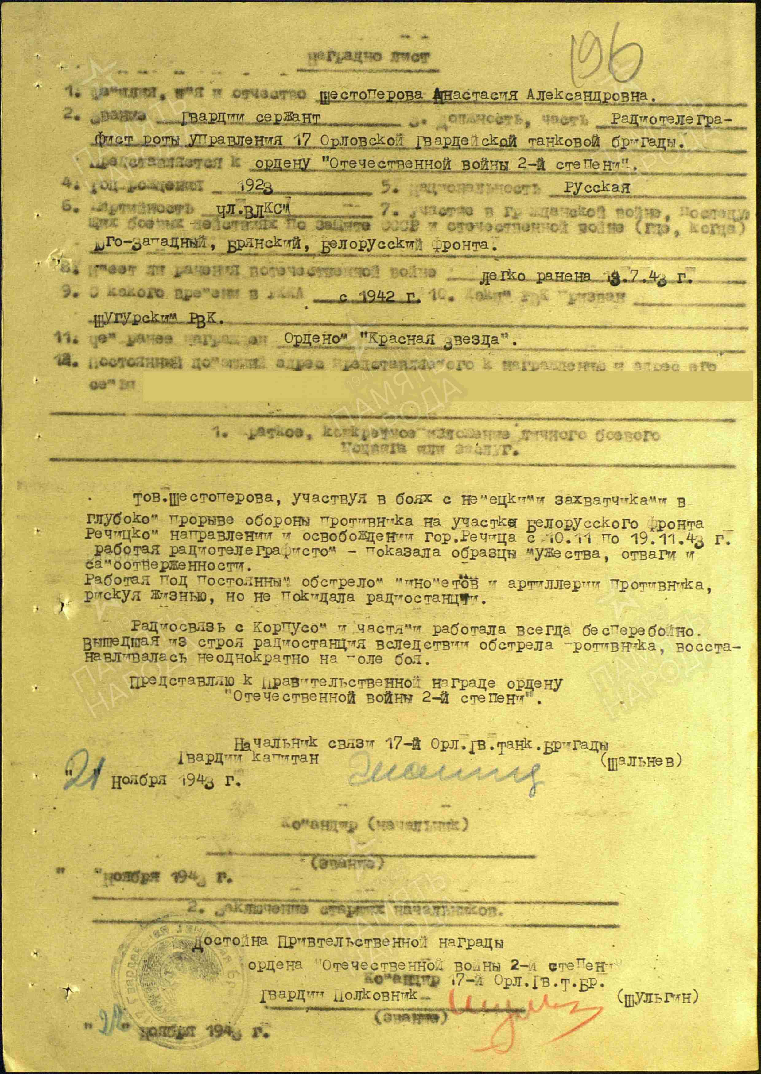 ШЕСТОПЁРОВА Анастасия Александровна, 1923, с. Билярск. Член ВЛКСМ. Мобилизована Шугуровским РВК в мае 1942. На фронте с фев. 1943 (Юго-Западный, Брянский, Белорусский). Гв. сержант, радиотелеграфист роты управления 17 гв. ТБр 1 гв. ТК. Участница битвы на Курской дуге, освобождения Белоруссии. Дважды ранена. В 1944 находилась на излечении в ЭГ 5872, г. Казань. Демобилизована 15 мая 1944. Награждена орденами Красной Звезды (1943), Отечественной войны 2 ст. (1943), Отечественной войны 1 ст. (1985). Скончалась в 2001.