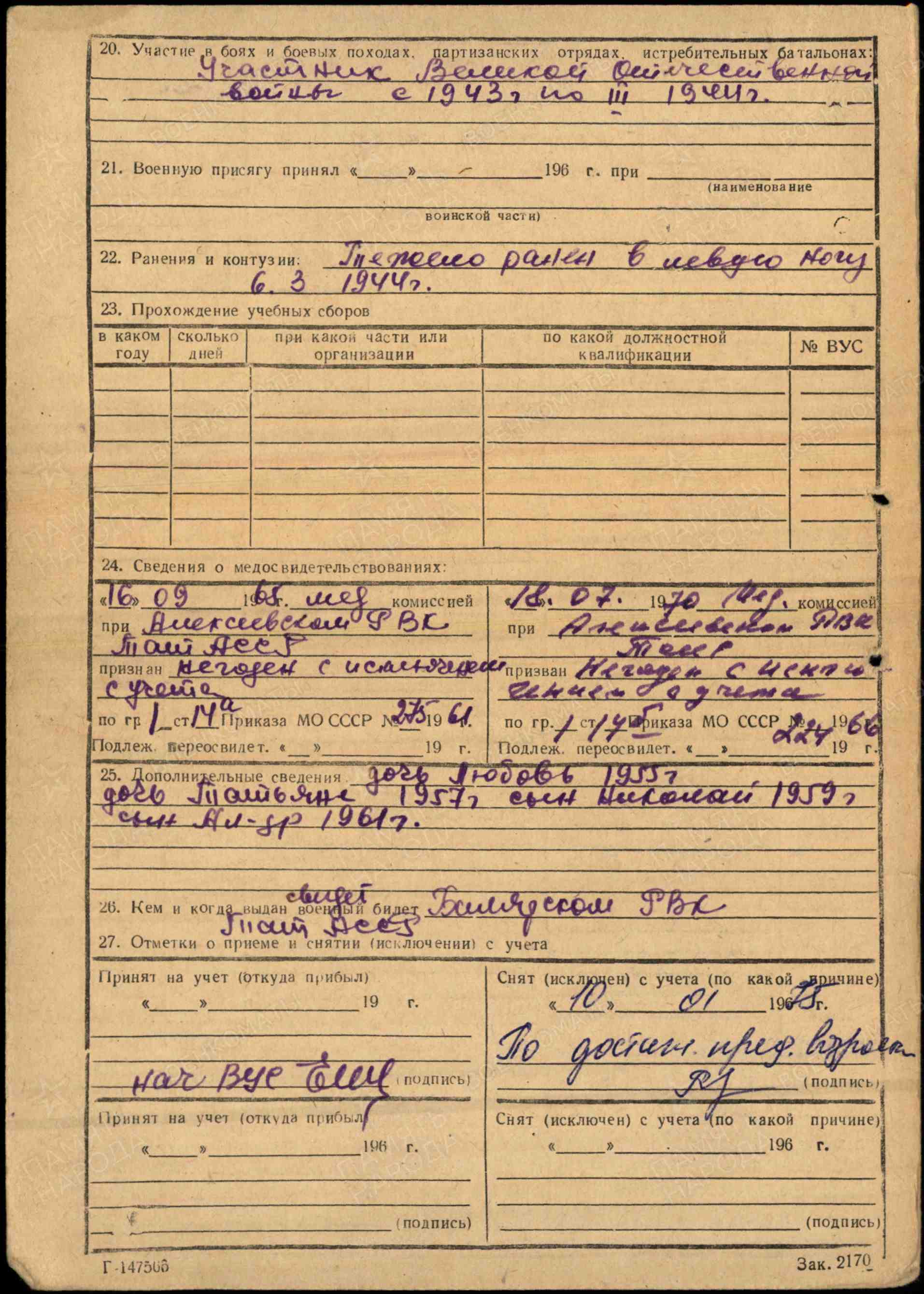 ШЕВЕЛЁВ Василий Маркелович, 1924, с. Билярск. Жил в д. Николаевский Баран. До призыва в армию работал в к-зе «Волна революции». Мобилизован 20 авг. 1942 Билярским РВК. Красноармеец, пулемётчик 380 отд. пулемётно-артиллерийского батальона 152 УР 20 А/ 10 гв. А/ 31 А Западного фронта. Тяжело ранен в левую ногу 6 марта 1944 в боях по освобождению Белоруссии. После лечения в госпитале уволен 10 окт. 1944 по ранению. Работал в сельском хозяйстве трактористом и комбайнером. Награждён орденом Отечественной войны 2 ст. (1985).