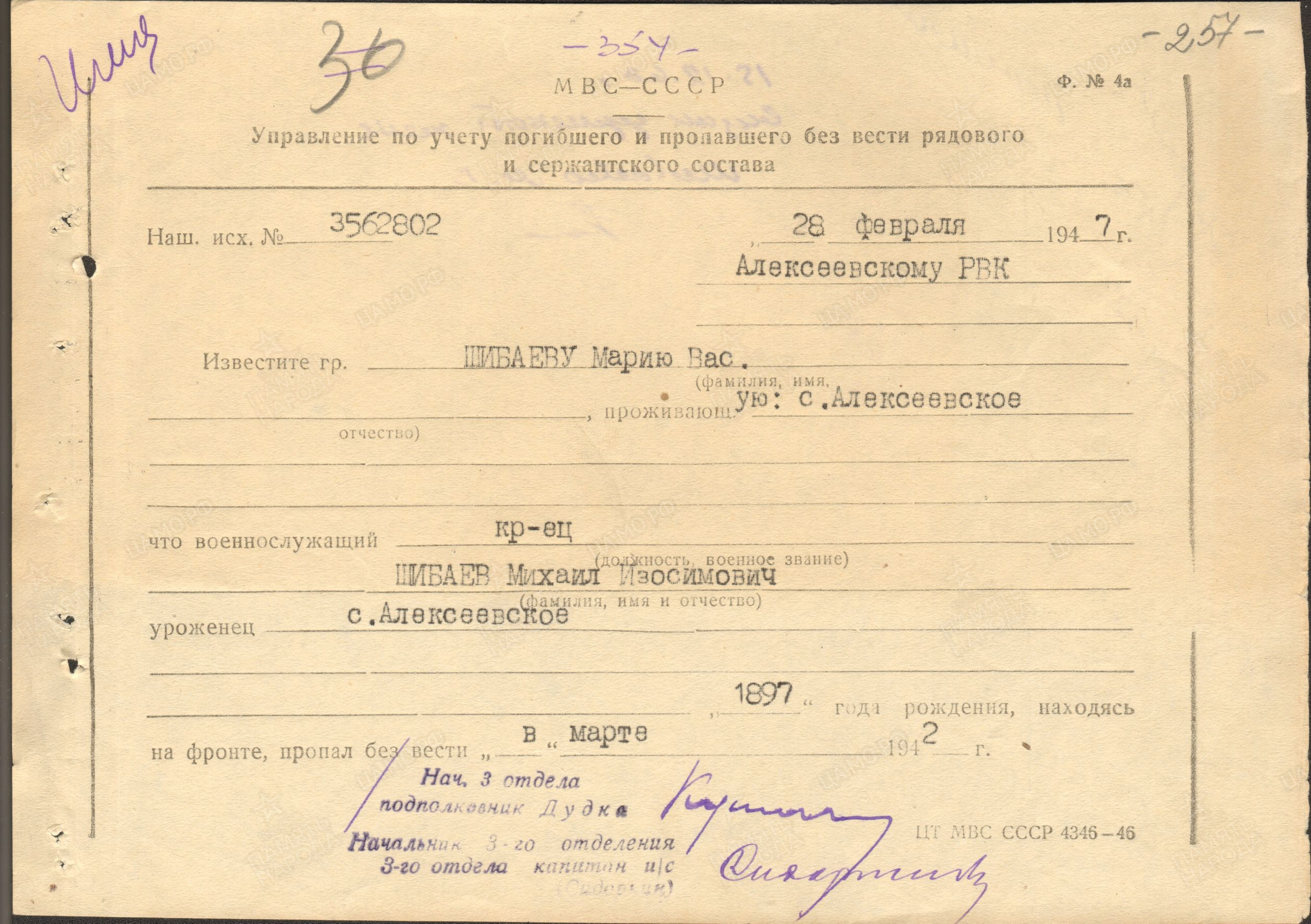 ШИБАЕВ Михаил Изосимович, 1897(1899), с. Алексеевское. Мобилизован Алексеевским РВК в 1941. Находясь на фронте пропал без вести в 1942г.