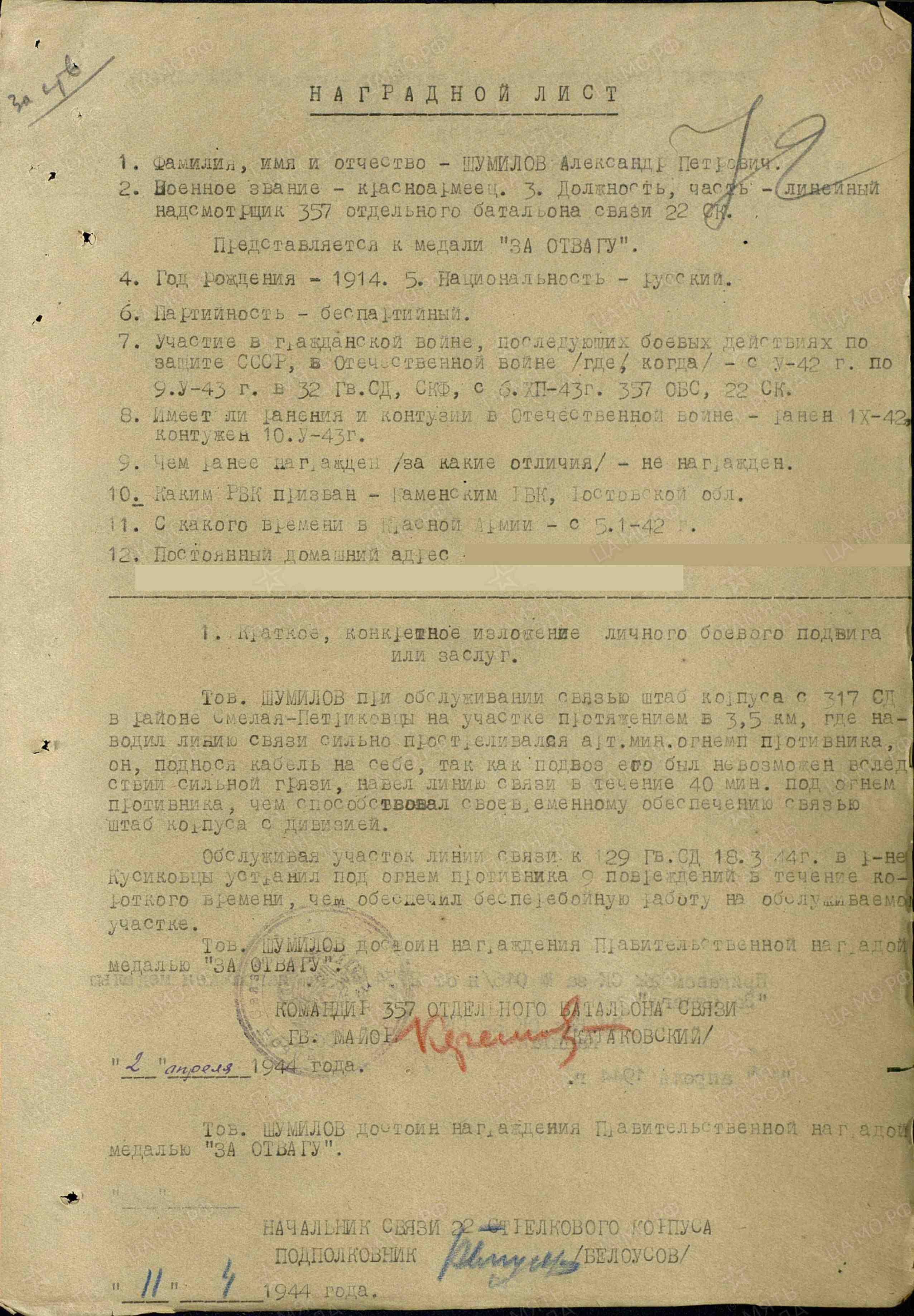 Александр Петрович Шумилов родился в 1914 г.р. в г.Чистополе, ТАССР. В 1942 г. призван в ряды Красной Армии Каменским районным военным комиссариатом Ростовской области. Служил в должности линейного надсмотрщика 357 отдельного батальона связи 22 СК. В боях был ранен в 1942 г., контужен 1943 г. Награжден медалью «За отвагу» (27.04.1944), орденом Красной Звезды (18.05.1945).