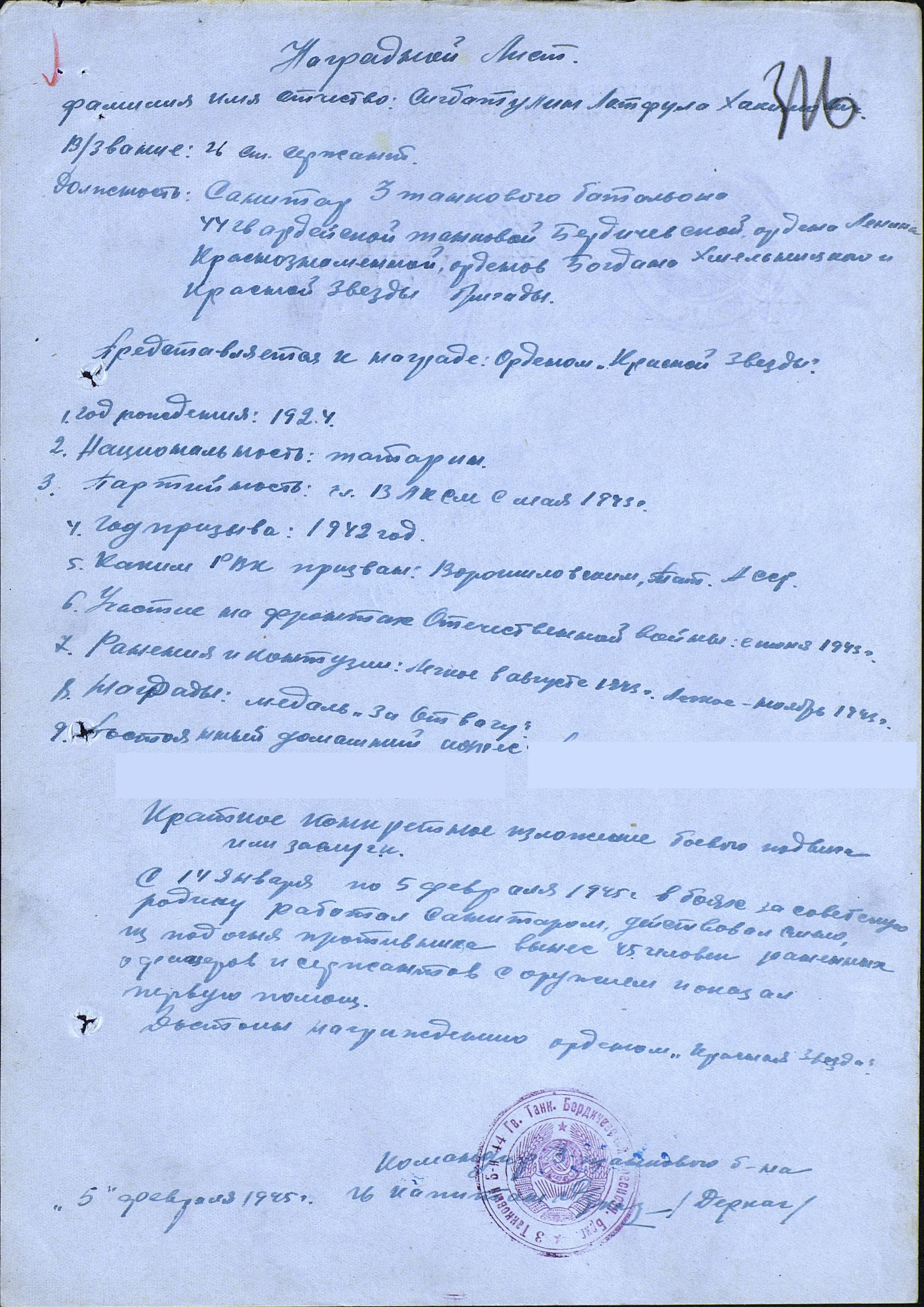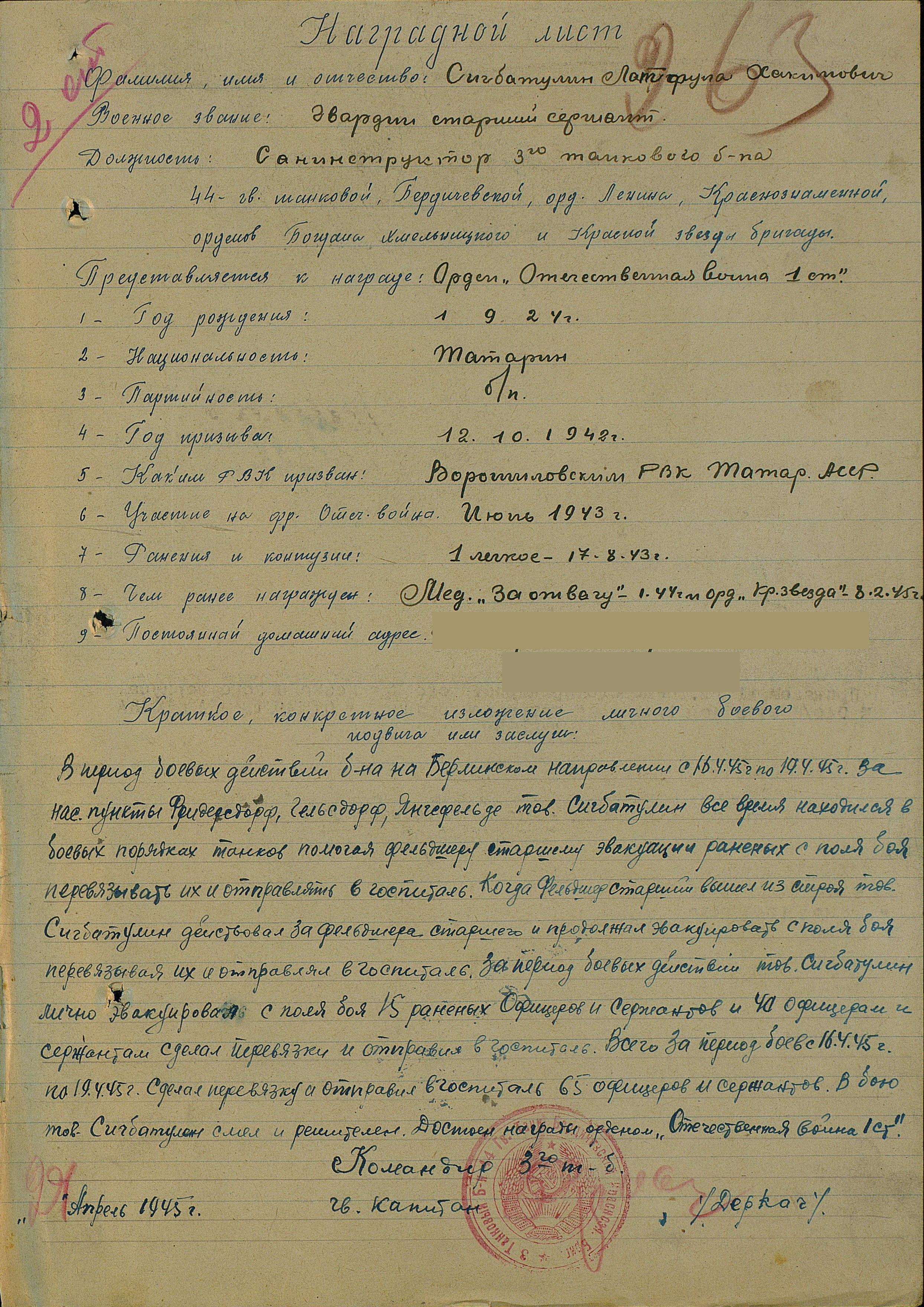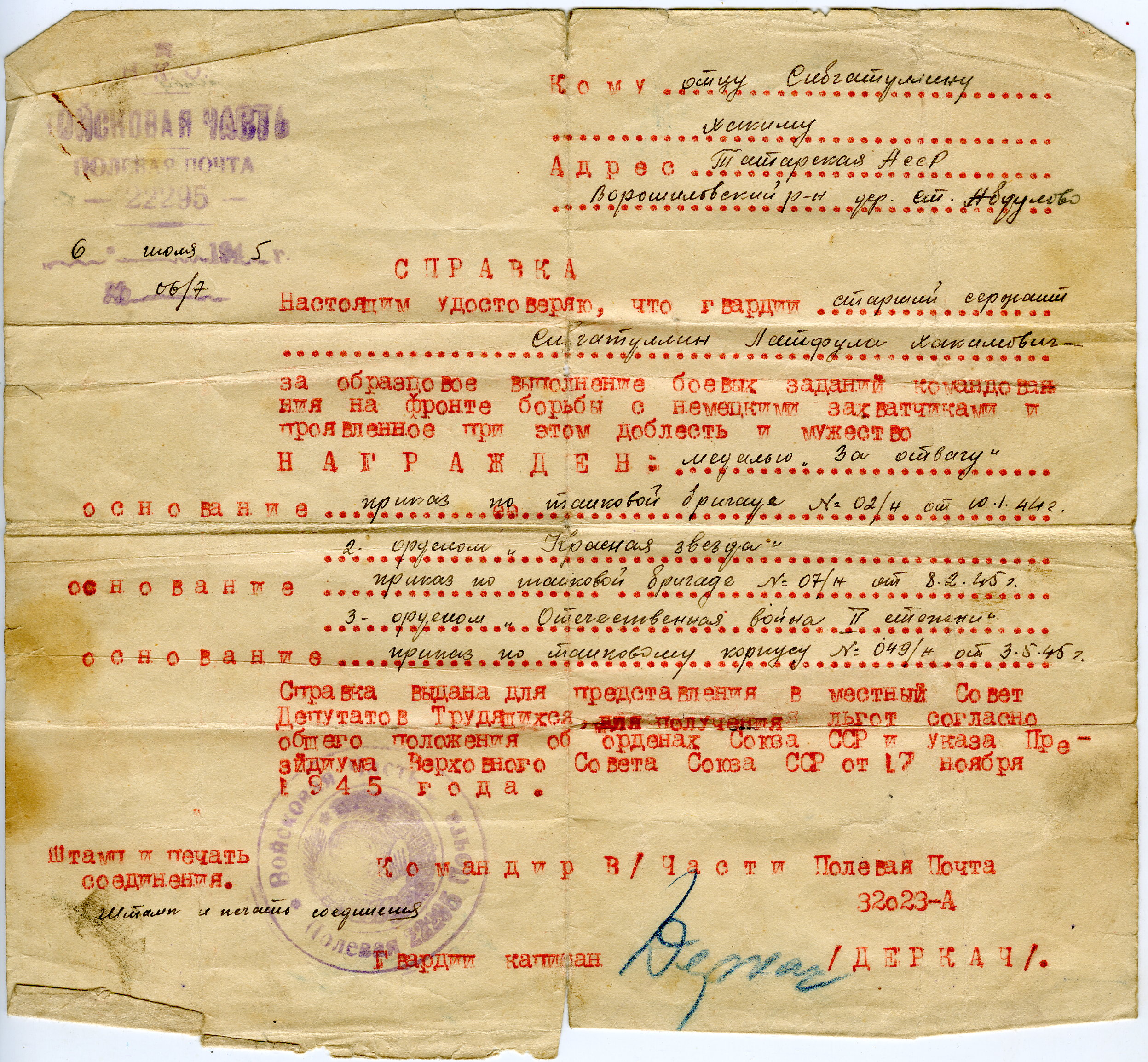 Родился в 1924 г., д. Абдулово. Мобилизован 12 окт. 1942 г. Ворошиловским РВК. Последнее звание - гвардии старший сержант, санинструктор, санитар 3 танк. бат. 44 гв. Бердичевской ордена Ленина Краснознамённой орденов Б. Хмельницкого и Красной Звезды бригады 11 гв. танкового корпуса. На фронте с июля 1943 г. Дважды легко ранен в 1943 г. Медаль "За отвагу" - январь 1944г., орден Кр. Звезда - февраль 1945, орден Отеч. войны 2 ст. (представлялся к 1 ст.) - май 1945 (за Берлинскую операцию). Также награждён знаком "Отличный санитар". Примечание: в наградных листах проходит по фамилией СИГБАТУЛИН.
