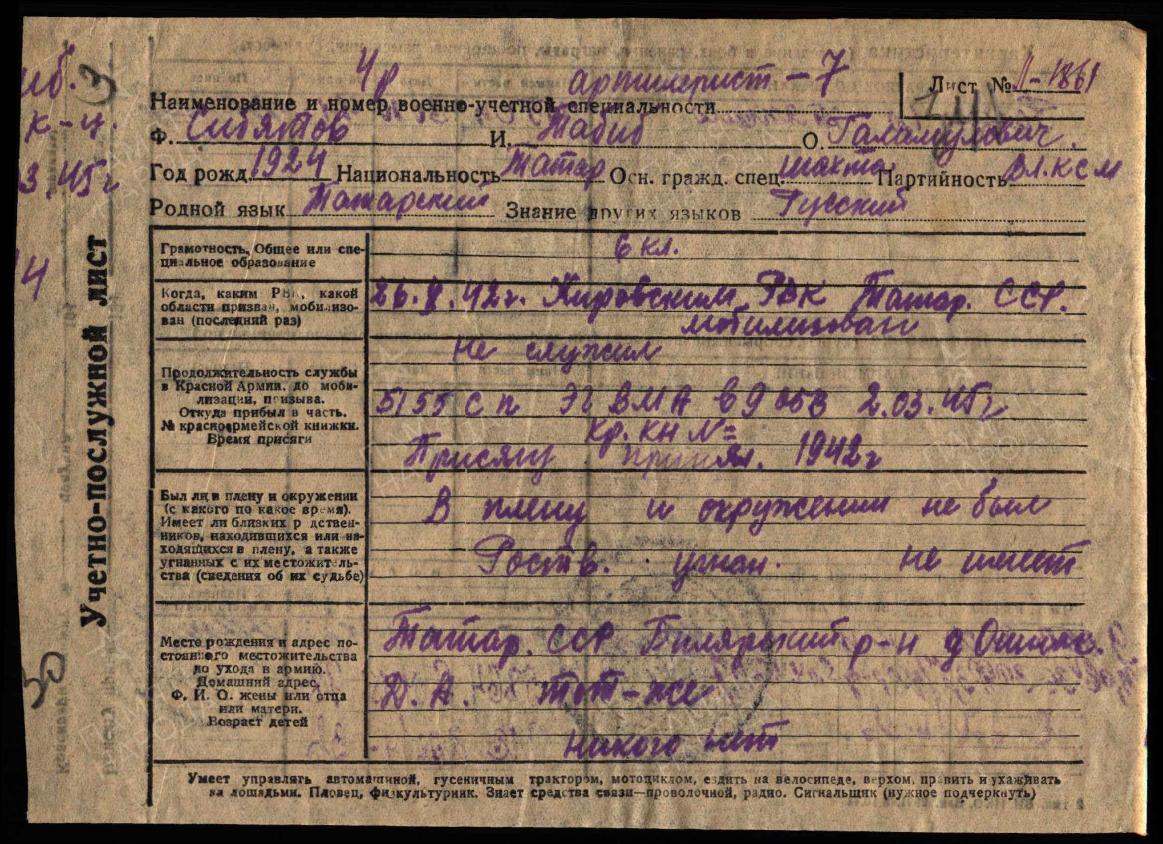 СИБЯТОВ Талиб (Табиб) Галимуллович (Калимуллович), 1924, д. Ошняк. Член ВЛКСМ. Мобилизован Кировским РВК г. Казань 26 авг. 1942. Красноармеец. С 1943 воевал в составе 1486 армейского ПАП 42 А/ 67 А Ленинградского фронта, 155 СП 14 СД 14 А Карельского фронта. Награждён медалью «За оборону Ленинграда». Тяжело ранен 30 окт. 1944. Находился на излечении в ЭГ ВМА, г. Ленинград. В апр. 1945 направлен в 127 отд. отряд разминирования, минёр. 12 июня 1945 поступил в ЭГ 1170, г. Ленинград, с минно-осколочным ранением голени и закрытым переломом правого бедра. Умер от сепсиса 11 июля 1945. Похоронен на Пискарёвском кладбище.