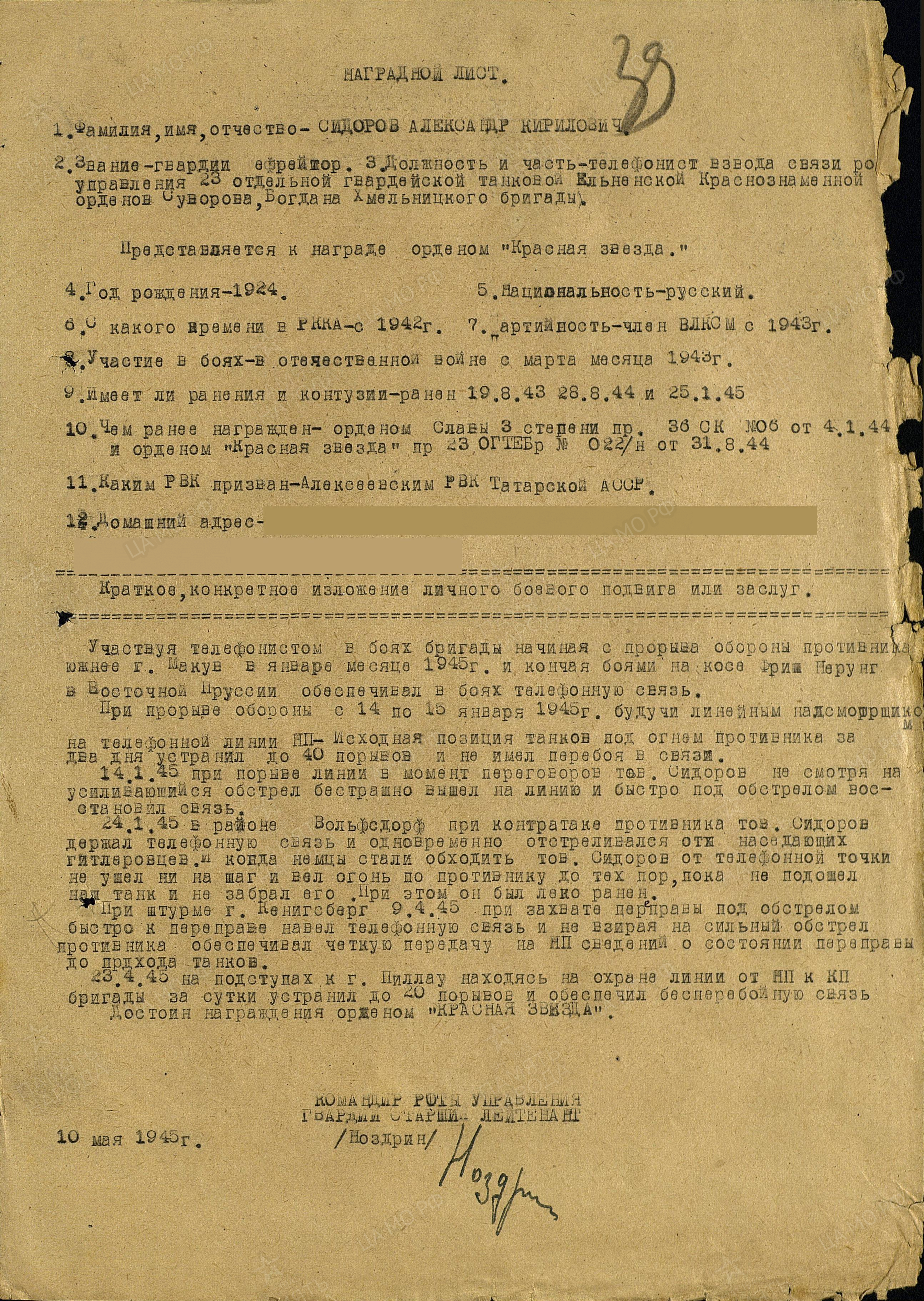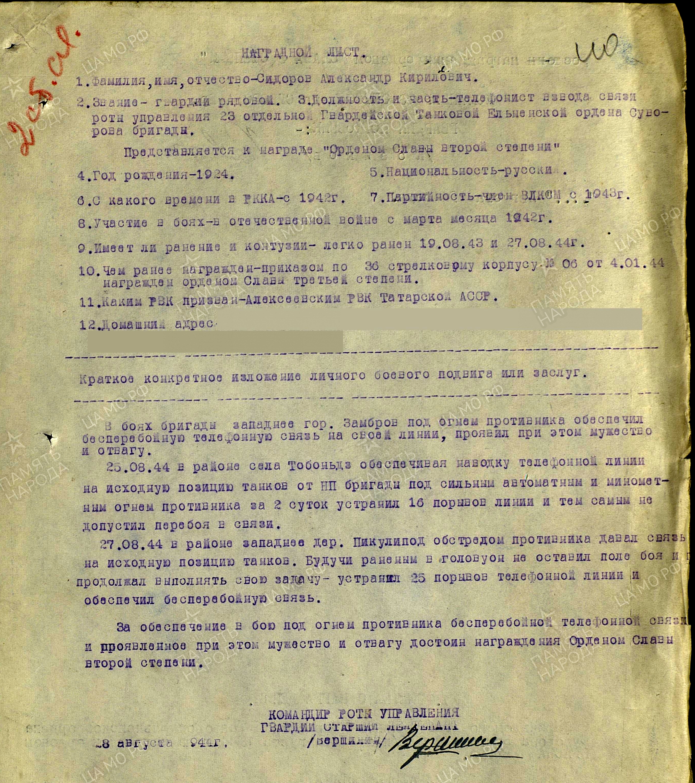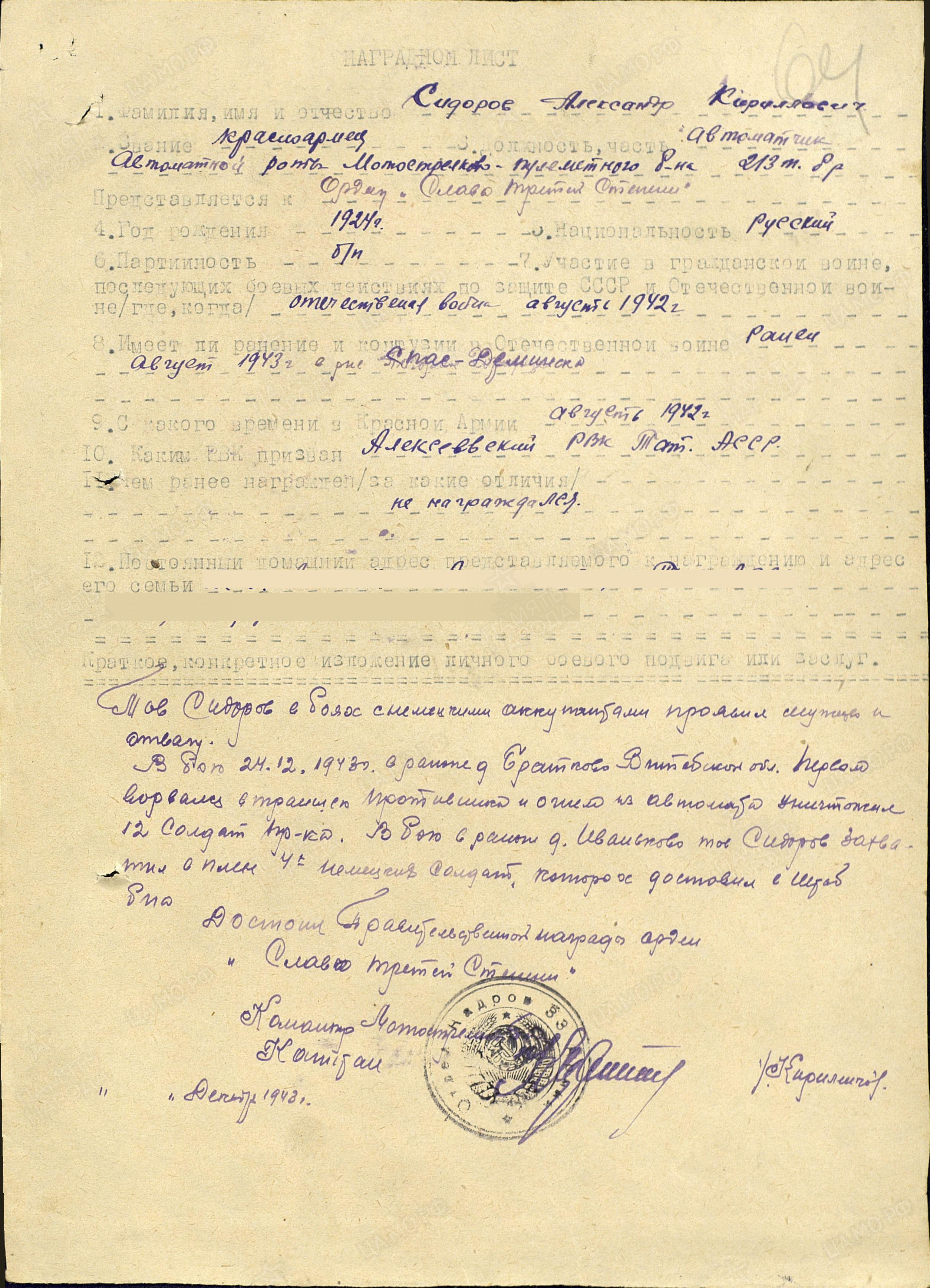 СИДОРОВ Александр Кириллович, 1924, с. Алексеевское. Мобилизован в авг. 1942 Чистопольским РВК. Член ВЛКСМ. Воевал с 1943 разведчиком в составе 62 СД 21 А ЗапФ. Ранен 19 авг. 1943 под Спас-Деменском. Проходил лечение в ГЛР 3335. 19 окт. 1943 направлен в роту автоматчиков мотострелково-пулемётного батальона 213 ТБр 2 БелФ. В боях на подступах к г. Витебск 24 дек. 1943 первым ворвался во вражеские траншеи, огнём из автомата уничтожил 12 солдат противника, четырёх захватил в плен и доставил в штаб батальона. Награждён орденом Славы 3 ст. В 1944 – гв. ефрейтор, телефонист взвода связи роты управления 23 отд. гв. ТБр. Участвовал в освобождении Польши и боях за Кёнигсберг. Был ранен 27 авг. 1944 и 25 янв. 1945. Устранял многочисленные порыва линии связи под обстрелом противника. Награждён двумя орденами Красной Звезды, медалью «За взятие Кёнигсберга», орденом Отечественной войны 1 ст. (1985).
