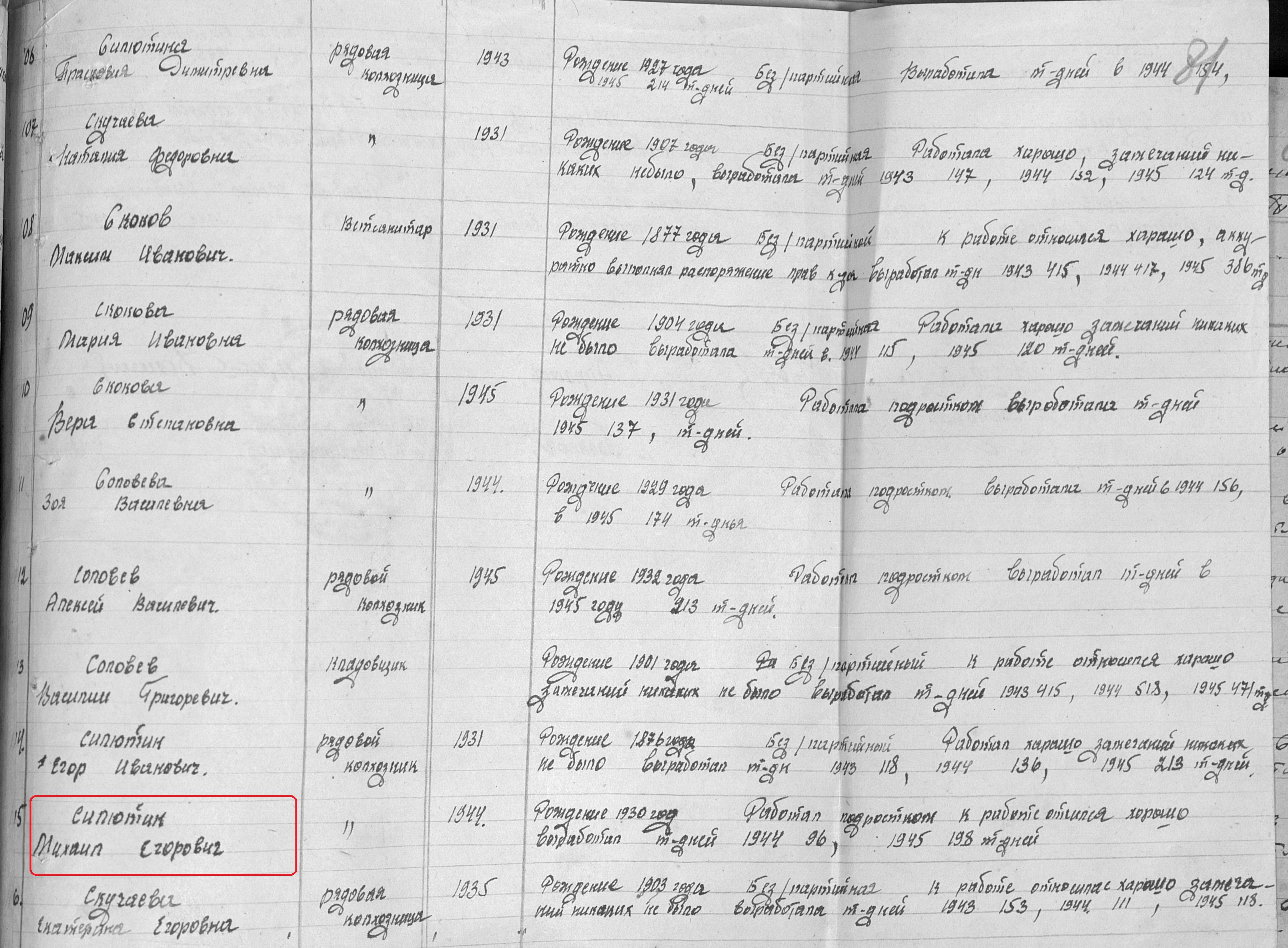 Силютин Михаил Егорович родился в 1929 году. Место жительства: с.Сл.Петропавловская Ново-Шешминский район ТАССР. В годы Великой Отечественной войны работал в колхозе «Победа» рядовым колхозником. Награжден медалью "За доблестный труд в Великой Отечественной войне 1941–1945 гг." (Акт от 01. 1946г.фонд 3610, опись 2, дело №174, лист 78). Умер в 1978 году, похоронен на сельском кладбище с.Сл.Петропавловская.