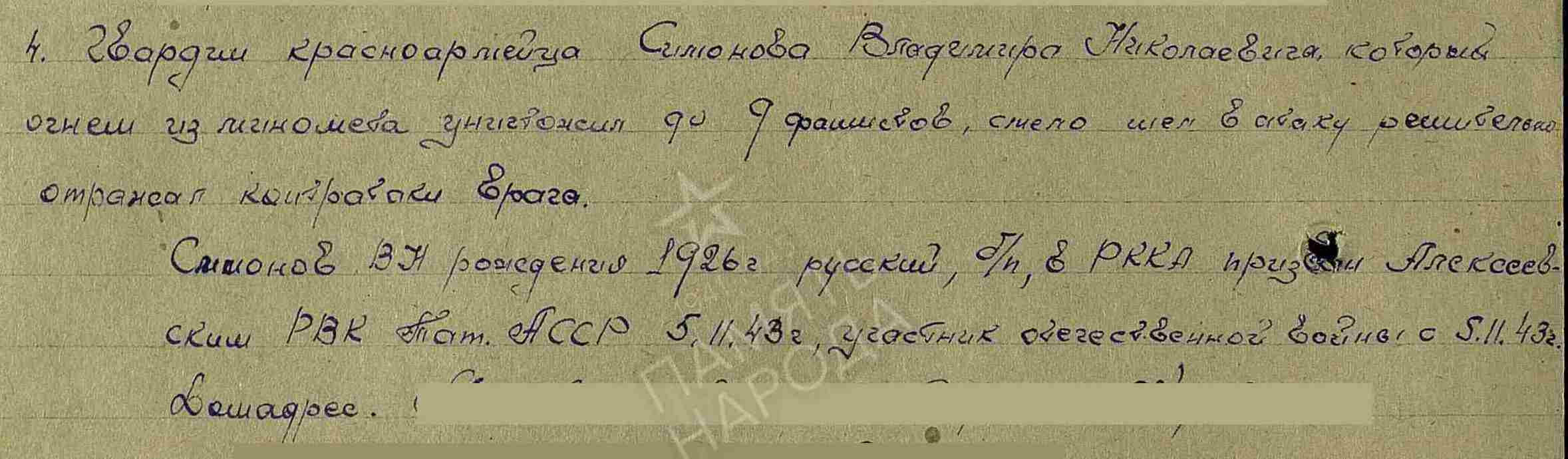 СИМОНОВ (СИМАНОВ) Владимир Николаевич, 1926, с. Караваево. До призыва в армию работал в к-зе им. Красной Армии. Мобилизован Алексеевским РВК 5/9 нояб. 1943. Воевал на 3 Белорусском и 1 Прибалтийском фронте в составе 39 А. Гв. красноармеец, миномётчик 56 гв. СП 19 гв. СД. Участник освобождения Белоруссии. Награждён медалью «За отвагу». 19 июля 1944 выбыл из в/части по ранению. Дальнейшая судьба не установлена. Учтён пропавшим без вести.