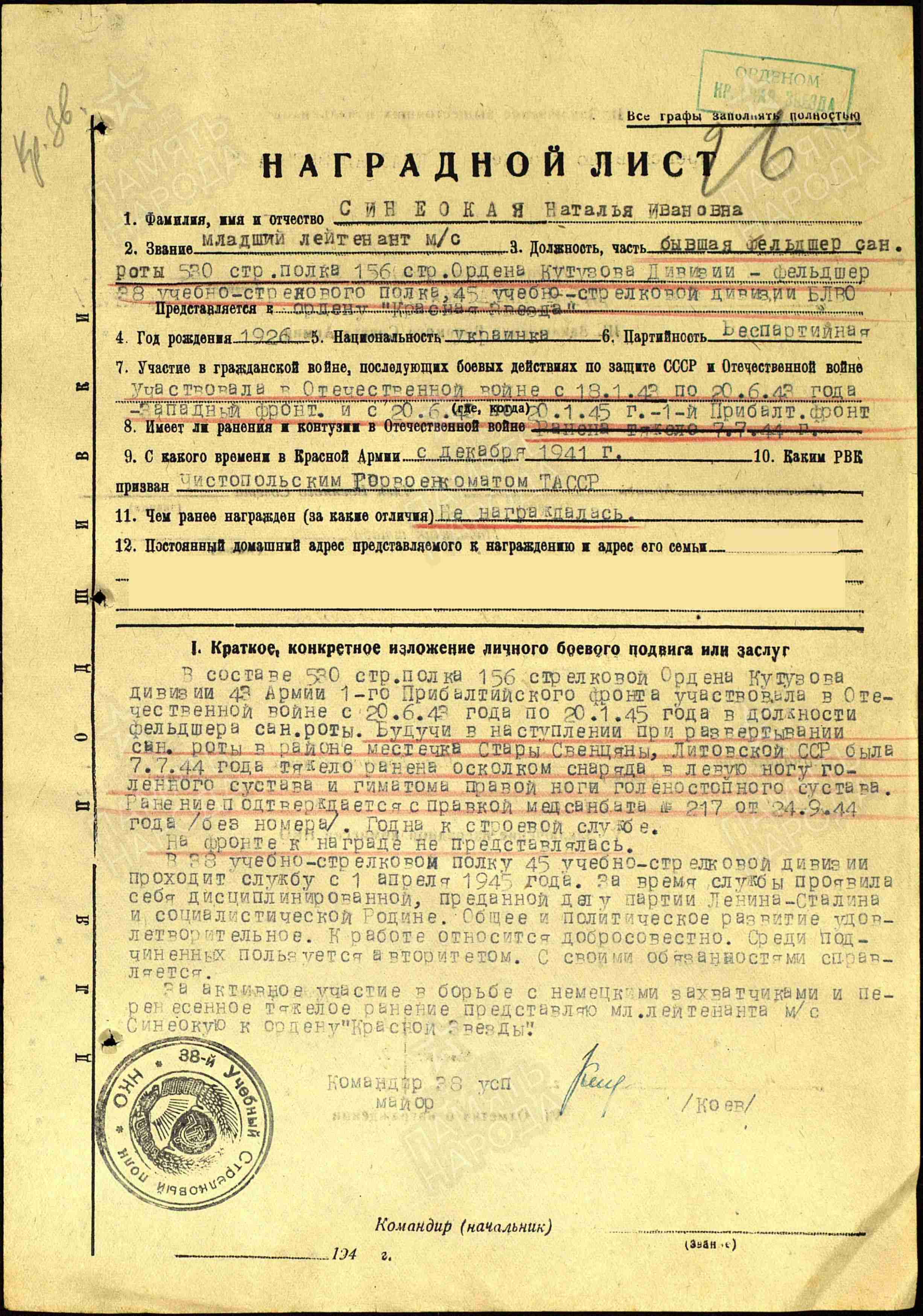 Наталья Ивановна родилась в 1926 году. В 1941 году была призвана Чистопольским ГВК в ряды Красной Армии, с 18.01.1943 года участвовала в Отечественной войне на Западном фронте, с 20.06.1943 г. – Прибалтийского фронта. Служила в звании младший лейтенант в должности бывшая фельдшер сан. Роты 530 стр.полка 156 стр. Ордена Кутузова Дивизии – фельдшер 38 учебно-стрелкового полка, 45 учебно-стрелковой дивизии БЛВО. Была награждена Орденом Красной Звезды 06.11.1945 г.