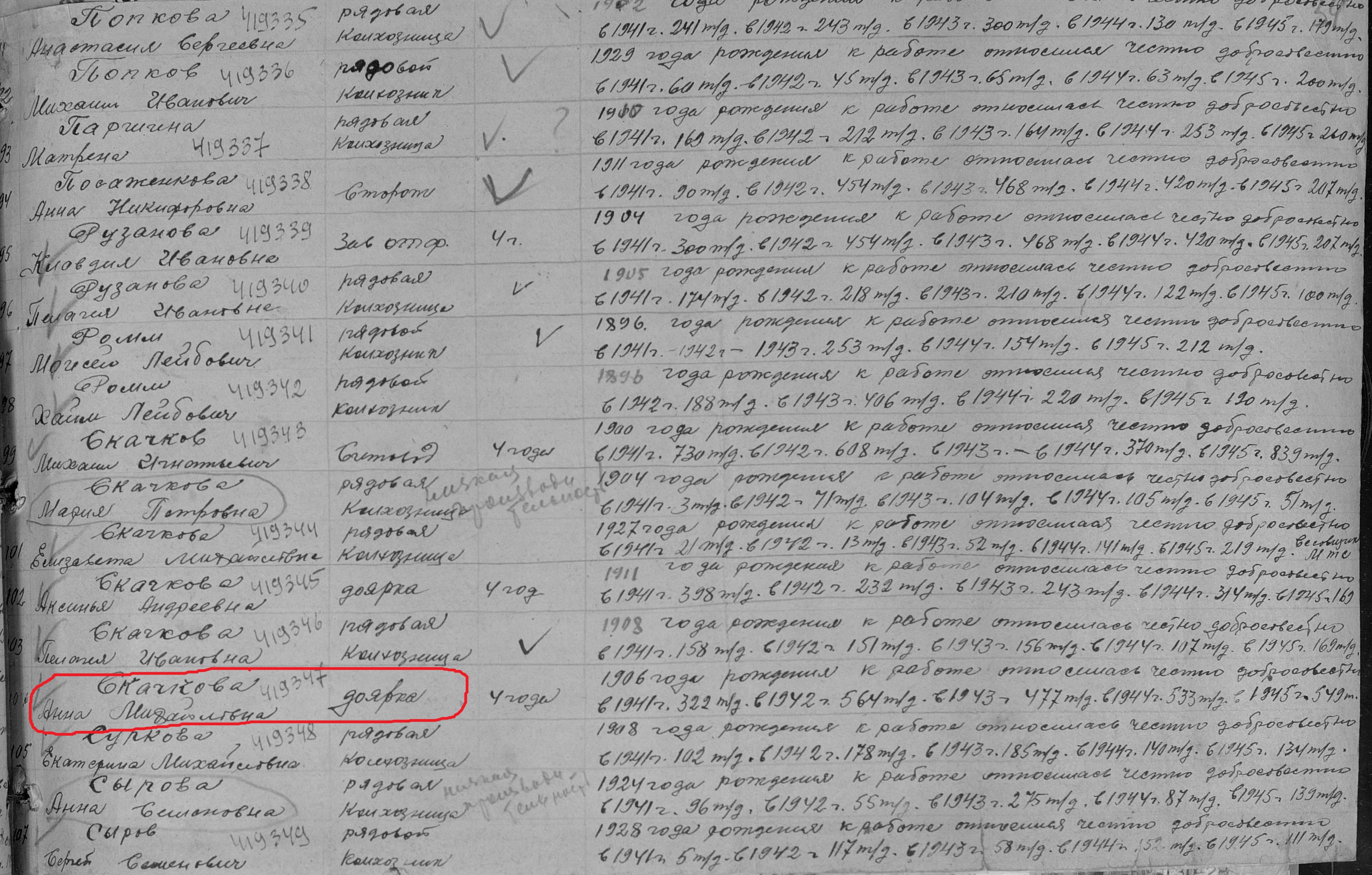 Скочкова Анна Михайловна родилась 16.09.1906 года в с.Новошешминск Казанской губернии Чистопольского уезда Новошешминской волости. В годы Великой Отечественной войны работала в колхозе «Красный Октябрь» дояркой. Награждена медалью "За доблестный труд в Великой Отечественной войне 1941–1945 гг." (Акт от 28 апреля 1947 г, фонд 3610, опись 2, дело № 325, лист 34, № 419347). Умерла 02.05.1993 года, похоронена на сельском кладбище с.Новошешминск.