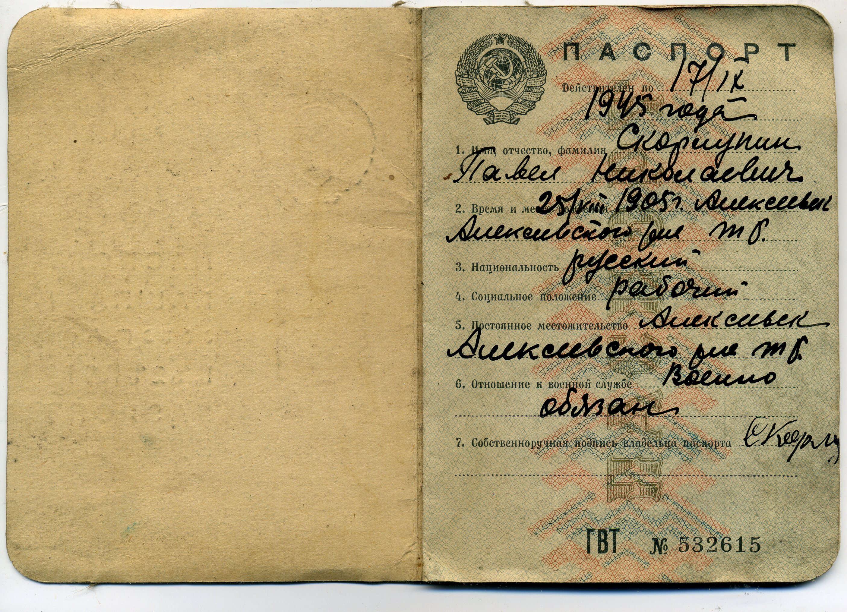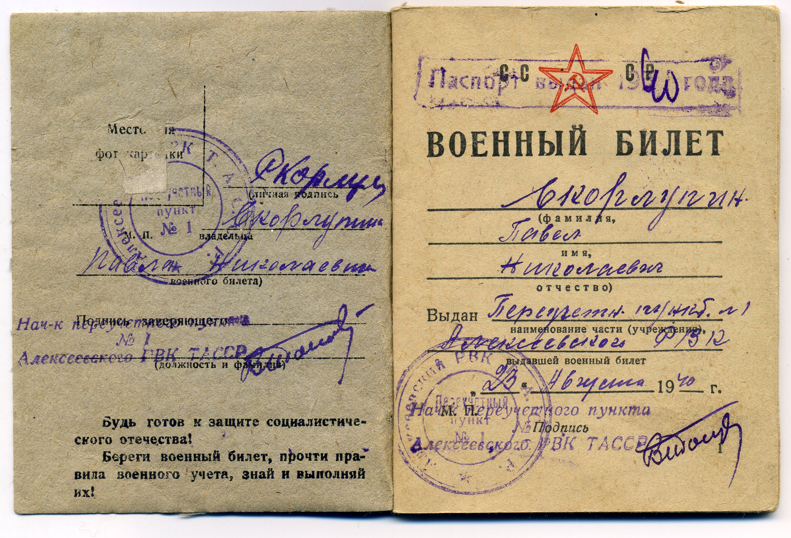 СКОРЛУПИН Павел Николаевич, 1905, с. Алексеевское. Срочную военную службу проходил с 1927 по 1929 гг. в составе 12 стрелкового полка. Уволен в запас в звании командира отделения. С 1930 по 1939 гг., будучи запасником первой категории, неоднократно принимал участие в военных сборах. В 1939-1940 гг. участвовал в Советско-финской кампании. Перед войной попал в заключение и был отправлен на фронт из исправительного заведения. Пропал без вести. Данных в ОБД-мемориал не найдено.