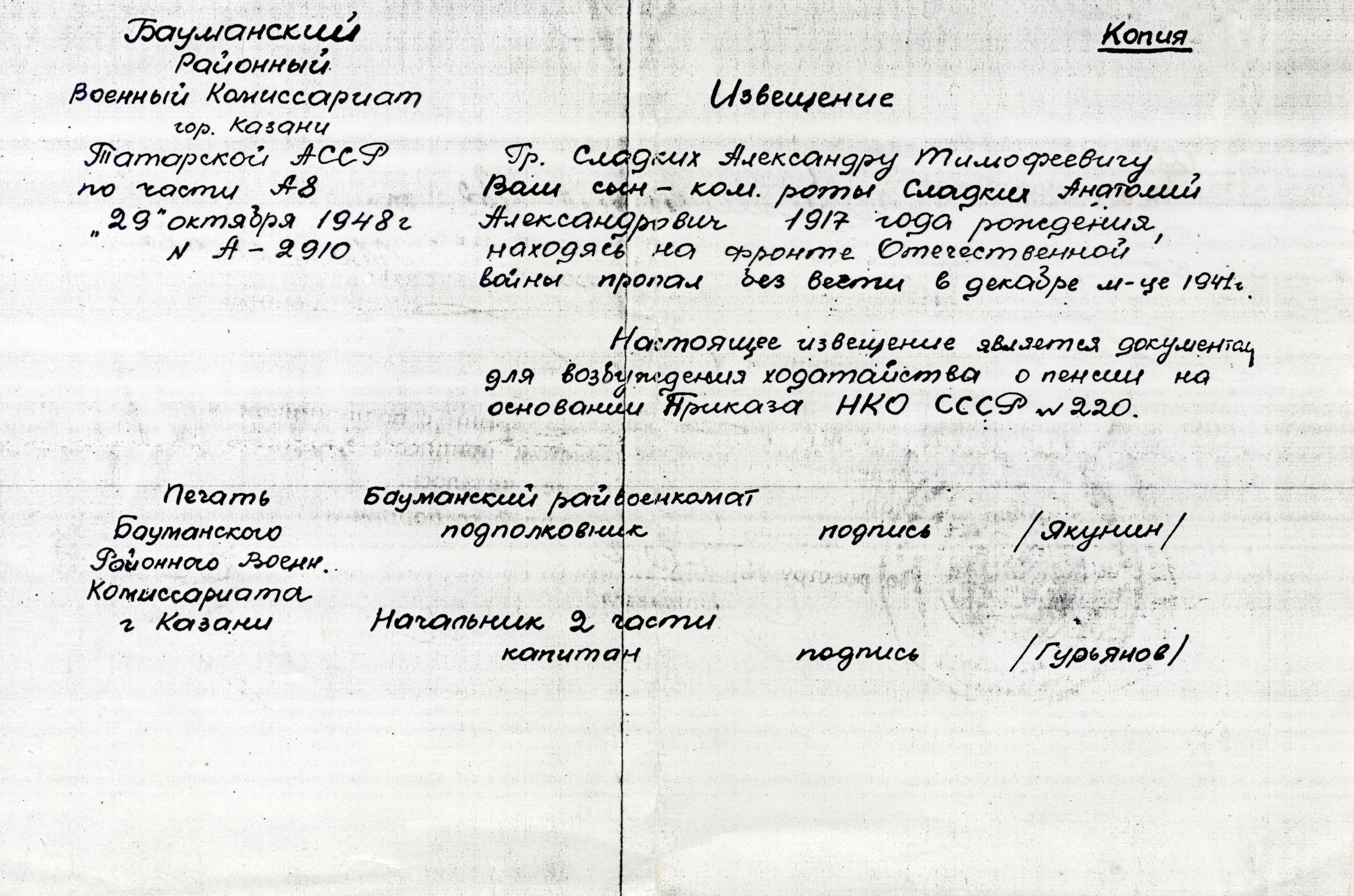 Папа без вести пропал под Москвой в декабре 1941 года, дядя Валентин – под Ленинградом, дедушка после контузии вернулся домой. Бабушка до конца жизни надеялась получить весточку от сына Анатолия.