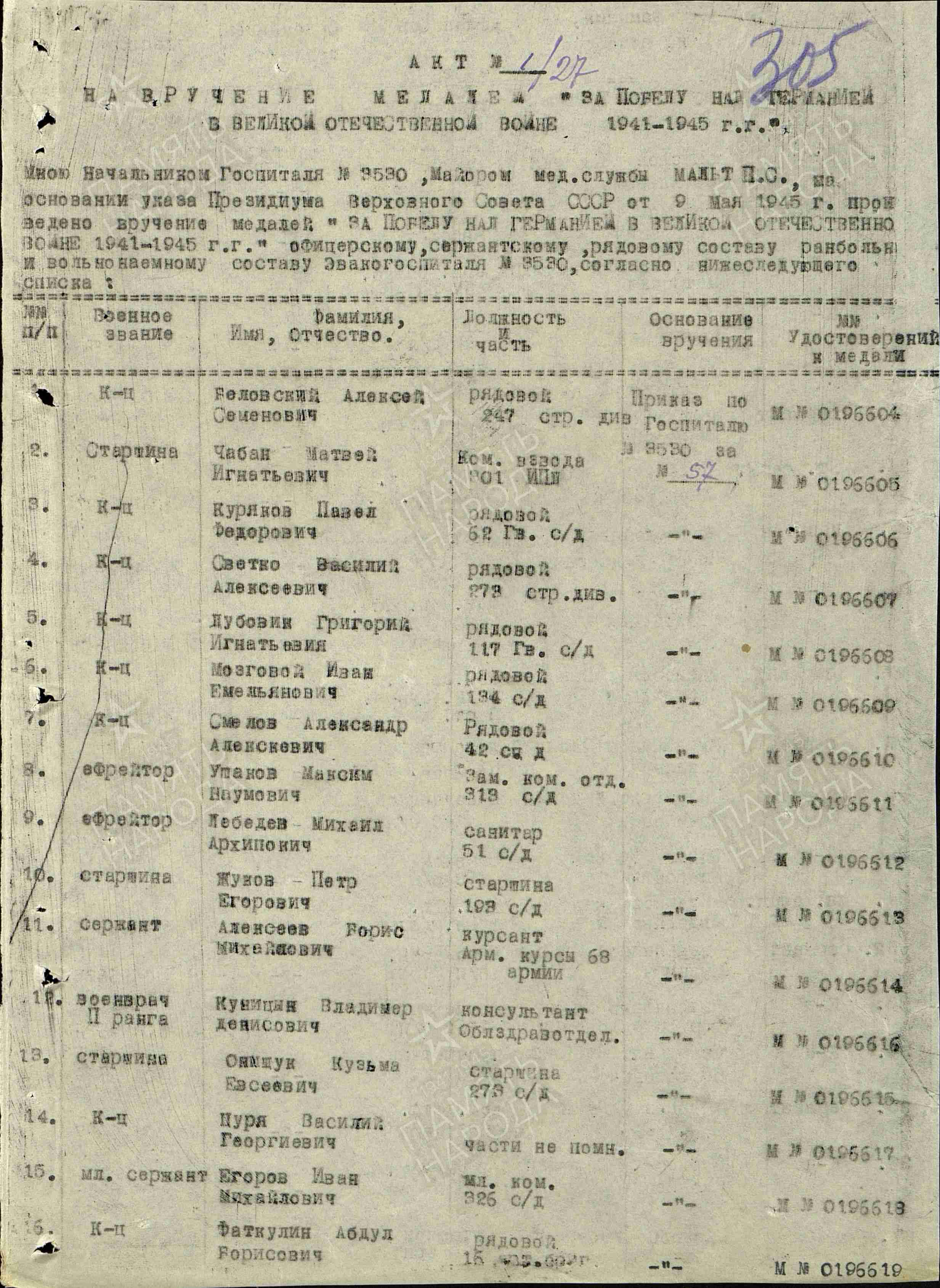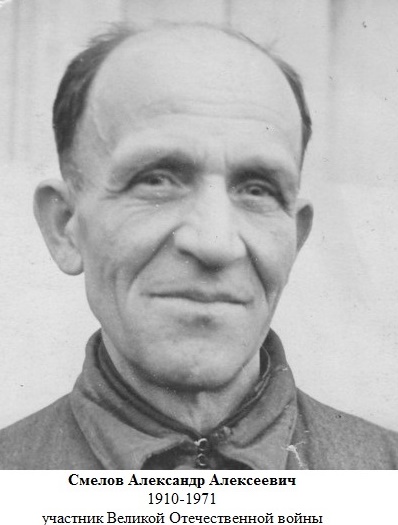 СМЕЛОВ Александр Алексеевич, 1910, с. Алексеевское. Мобилизован Алексеевским РВК в 1941. Младший нач. состав, заряжающий орудия 395 СП 127 СД (2 гв. СД) 13 А Брянского фронта. Попал в плен. Освобождён в 1945. Воевал в составе 42 СД 49 А 2 Белорусского фронта, красноармеец. Ранен, проходил лечение в ЭГ 3530, г. Пенза. Скончался в 1971.