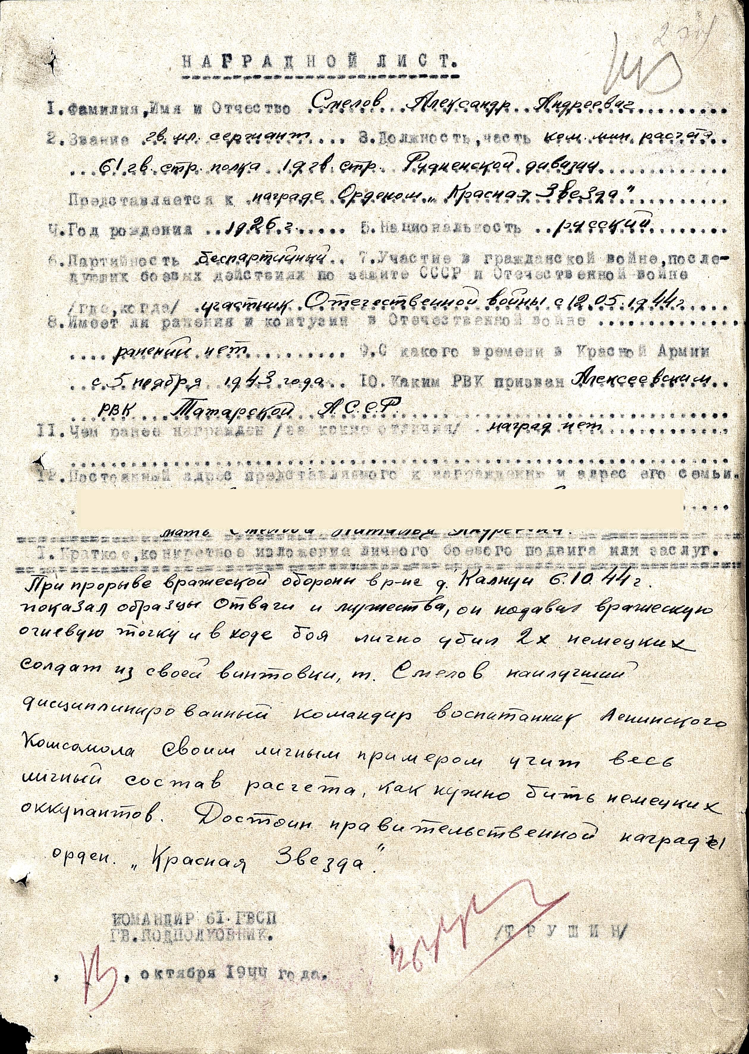 СМЕЛОВ Александр Андреевич, 1926, с. Алексеевское. Гв. мл. сержант. Призван в 1943 г. Обучался на минометчика в Моск. области. На фронте с июня 1944 г. в составе 61 Гв.СП 19 Гв.СД 39 А. Воевал под Витебском, Шауляем наводчиком 82-мм миномета. Под Кёнигсбергом был ранен осколком мины. После госпиталя служил шофёром в ВВС. Награждён двумя орденами Красной Звезды (второй орден вручен не был), Отечественной войны 2 ст. (1985), медалью «За победу над Германией».