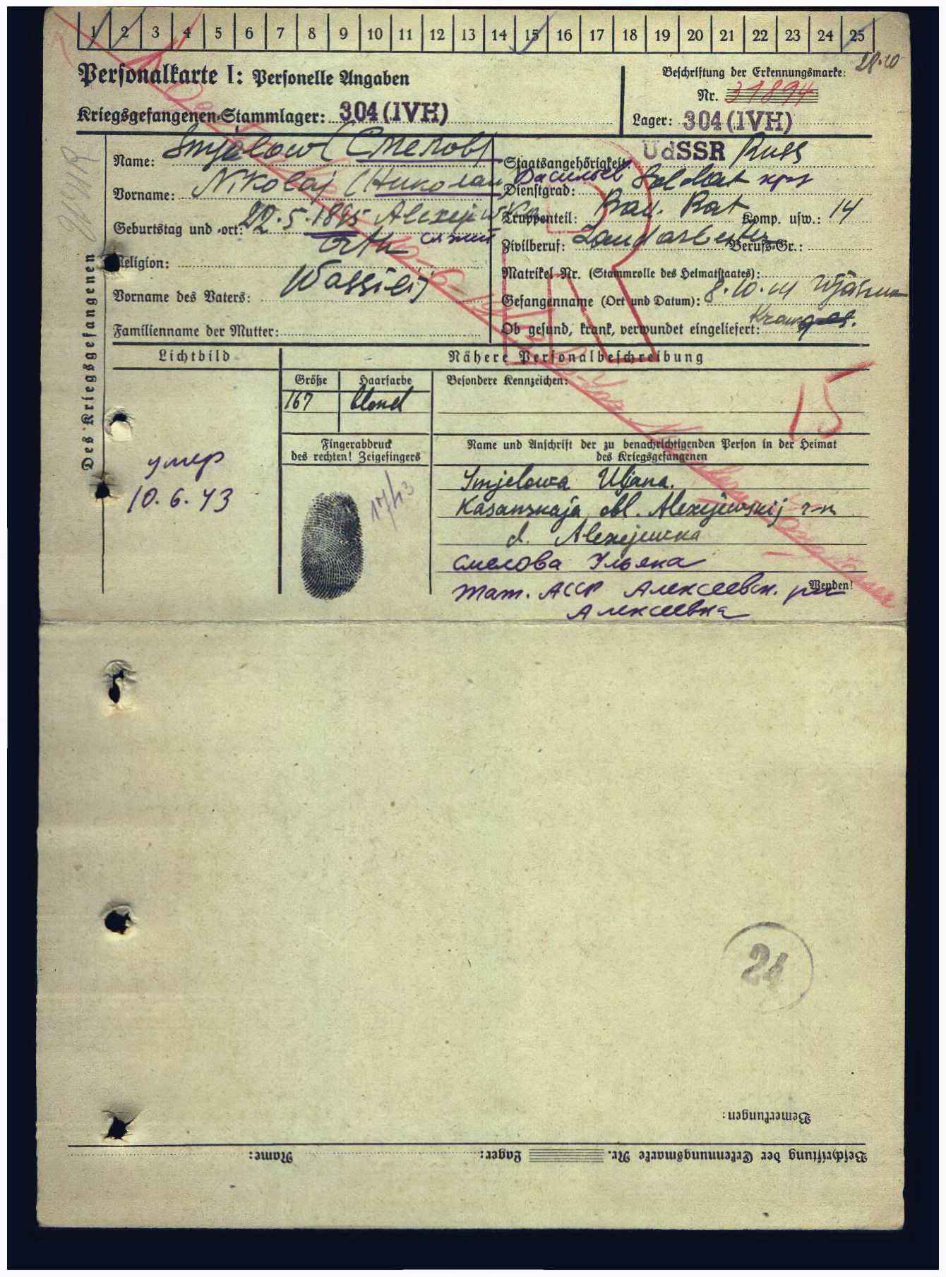 СМЕЛОВ Николай Васильевич (1895г.р., с. Алексеевское). Кр-ец, 14 строит. батальон. Попал в плен 8.10. 1941 г. под Вязьмой. Умер 10.06.1943 г. в лагере № 304, IV H, г. Нюрнберг, Германия.