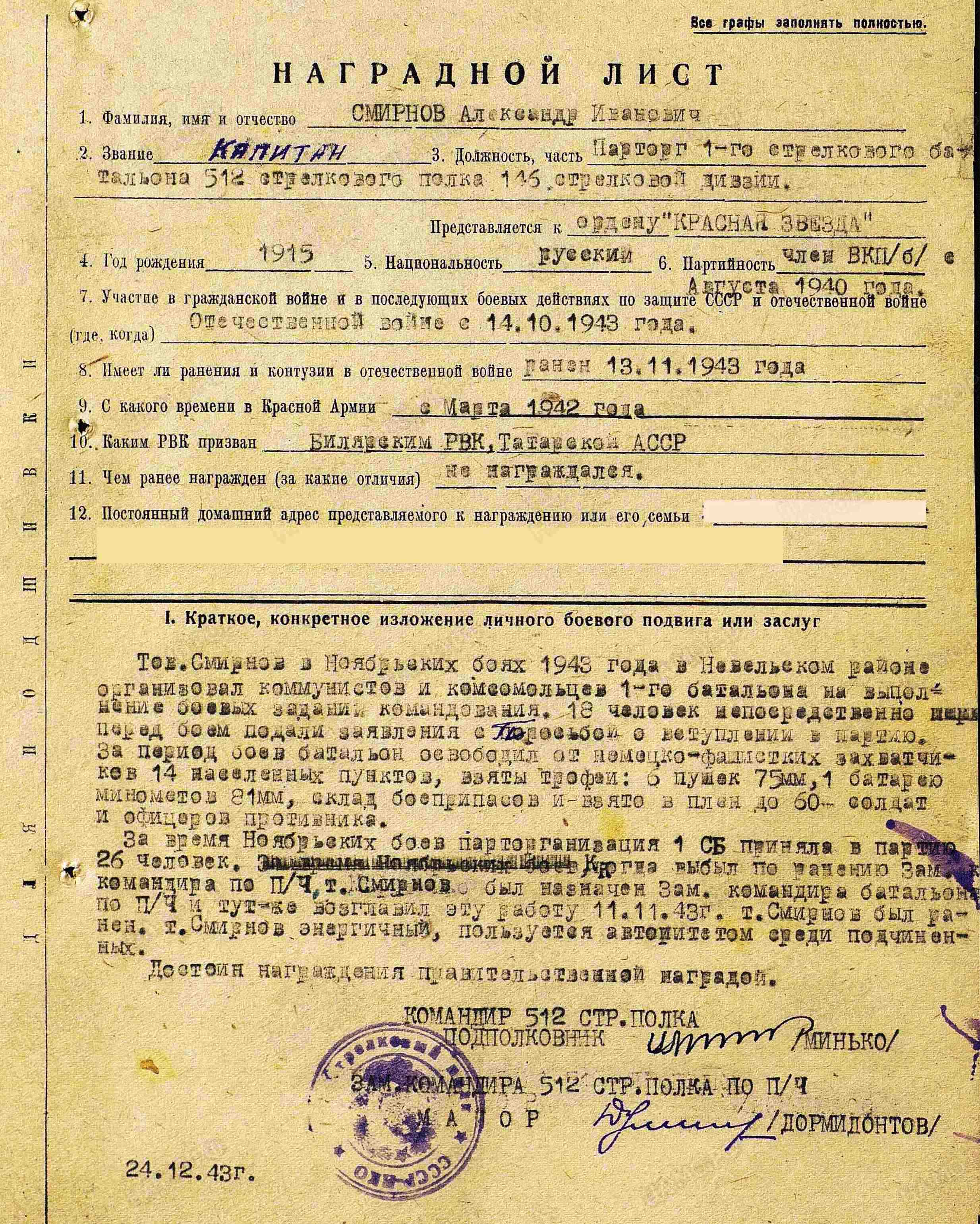 СМИРНОВ Александр Иванович, 1915, п. Красная Свобода. В 1937-1939 проходил срочную службу. С 1940 состоял в резерве командно-политического состава. Член ВКП(б). Мобилизован в марте 1942 из г. Казань. Воевал с 14 окт. 1943 на 2 Прибалтийском фронте в составе 3 УдА/ 1 УдА. Капитан, парторг батальона/ зам. ком. по политич. части 512 СП 146 СД. Награждён орденом Красной Звезды. Ранен легко 13 нояб. 1943, ранен тяжело 10 апр. 1944. Проходил лечение в ЭГ 1506, г. Торжок, Калининская обл., ЭГ 2837/ ЭГ 2820, Горьковская обл. Снят в учёта в фев. 1946.