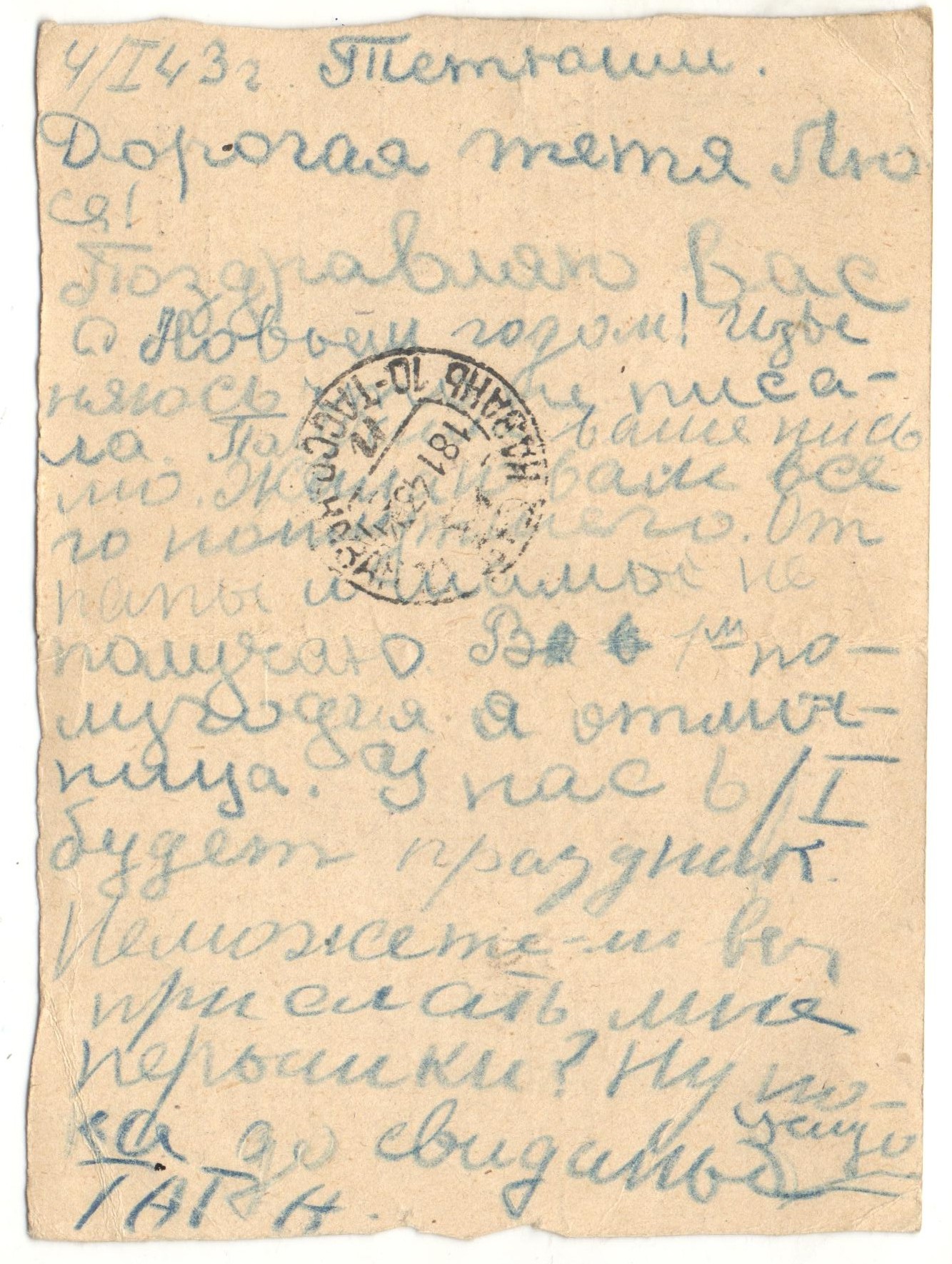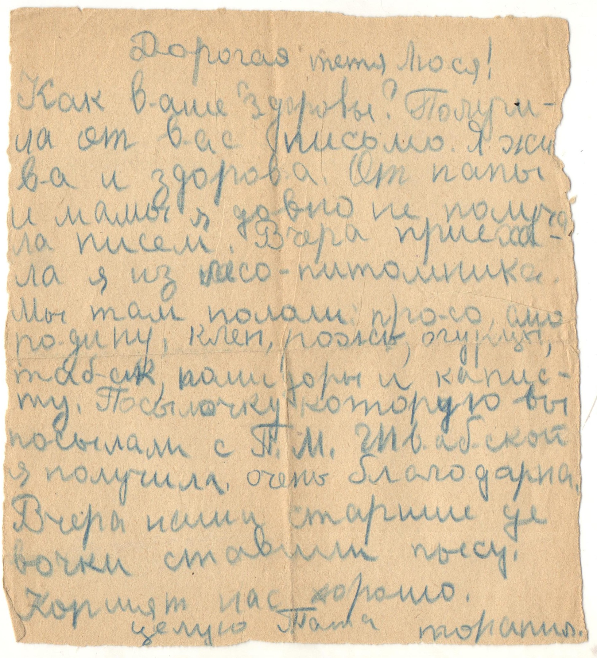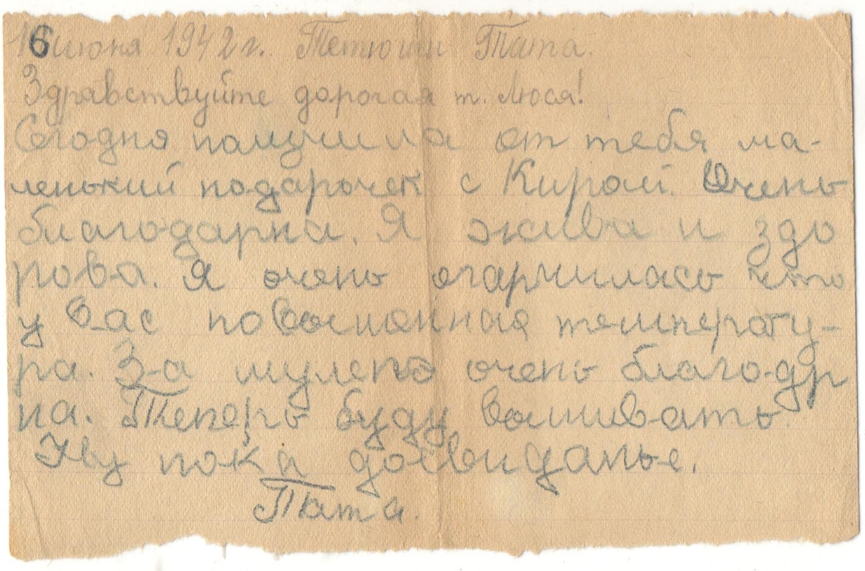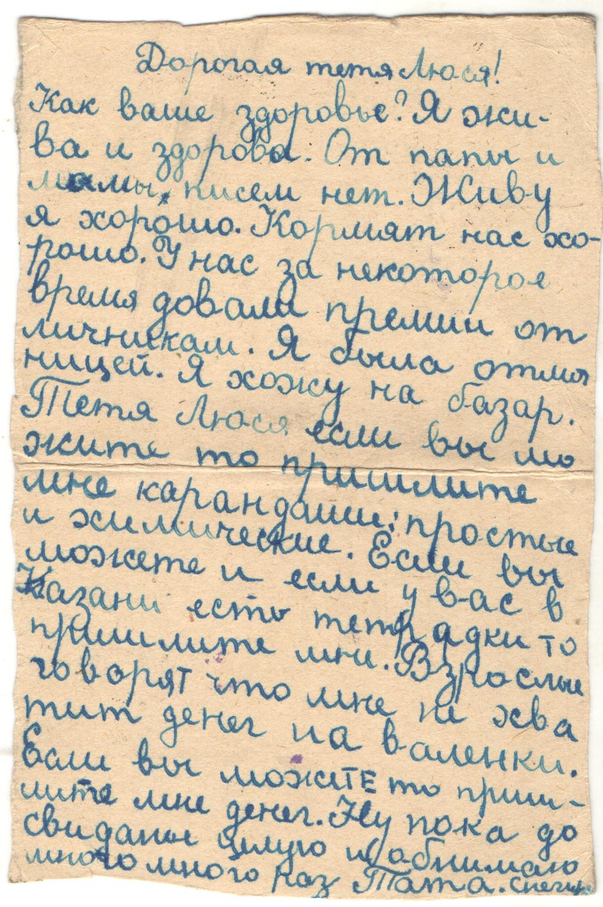 «Дорогая тетя Люся! Как ваше здоровье? Вместе с вашим письмом получила от папы открытку «В атаку». Боевой папин товарищ у меня был. Я написала с ним папе письмо. Кормят нас хорошо, три раза в день. Я ни в чем не нуждаюсь. Деньги у меня есть, я хожу на базар и покупаю там молоко, яйца, творог, огурцы. До свидания. Целую и обнимаю. Тата ».