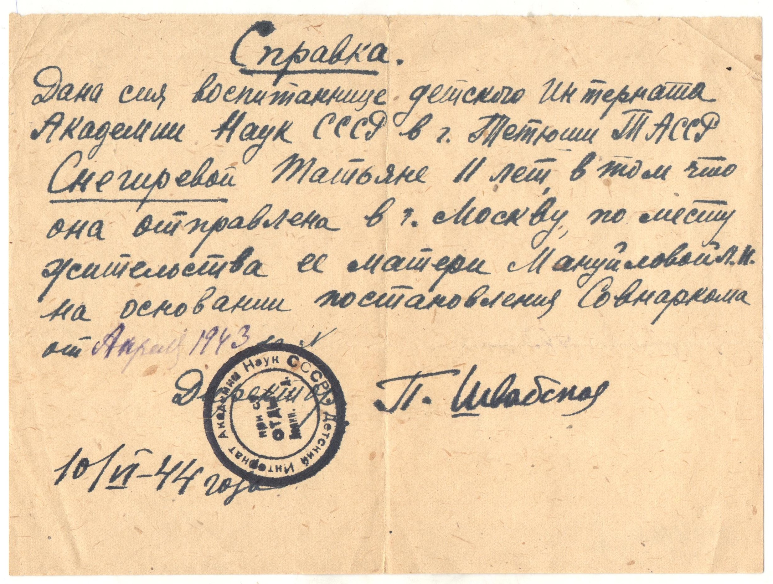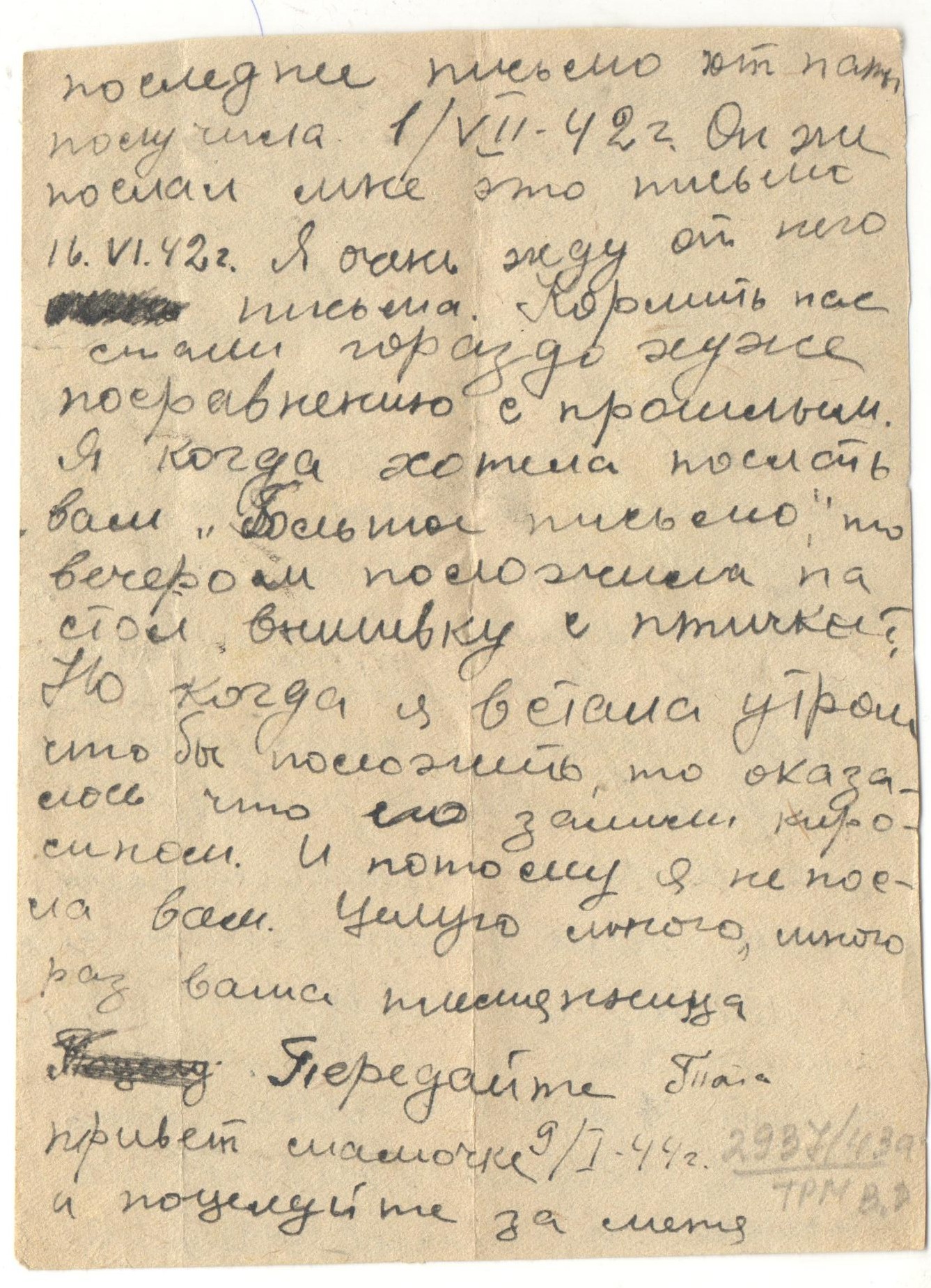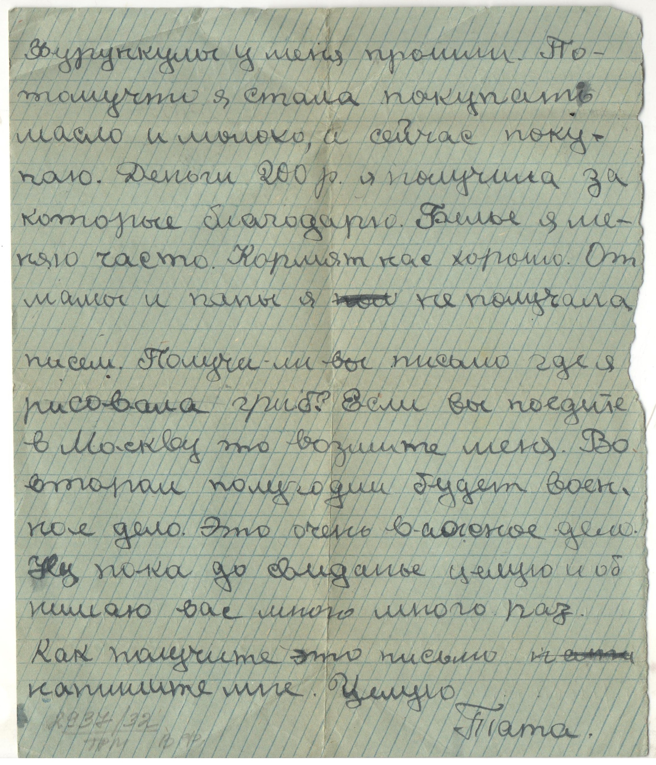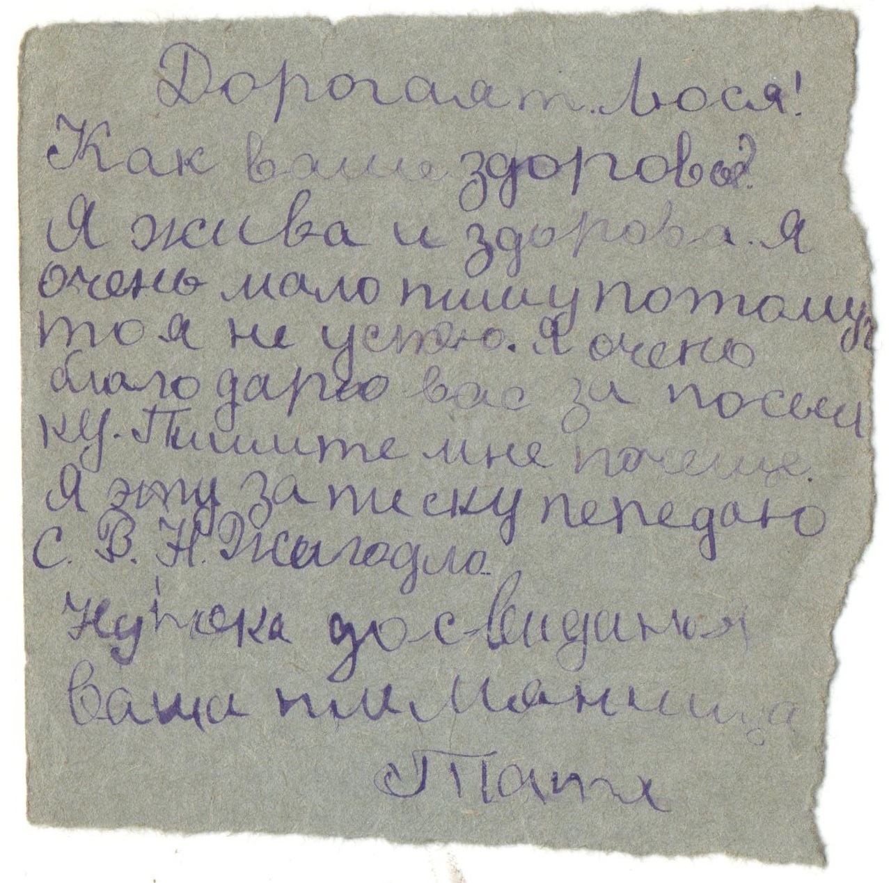 «Дорогая тетя Люся! Как ваше здоровье? Вместе с вашим письмом получила от папы открытку «В атаку». Боевой папин товарищ у меня был. Я написала с ним папе письмо. Кормят нас хорошо, три раза в день. Я ни в чем не нуждаюсь. Деньги у меня есть, я хожу на базар и покупаю там молоко, яйца, творог, огурцы. До свидания. Целую и обнимаю. Тата ».