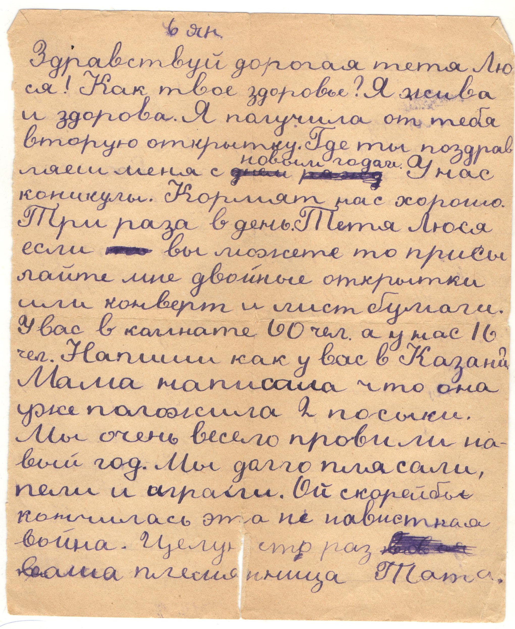 «Дорогая тетя Люся! Как ваше здоровье? Вчера получила от вас посылку, очень вам благодарна. А особенно за учебник истории, в первом полугодии я – отличница. Новогоднюю елку мы провели хорошо. Мы долго плясали, пели и играли. Ой, скорее бы кончилась эта ненавистная война. Вчера у нас было холодно, и мы не ходили в школу.
