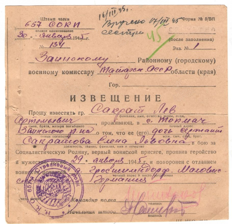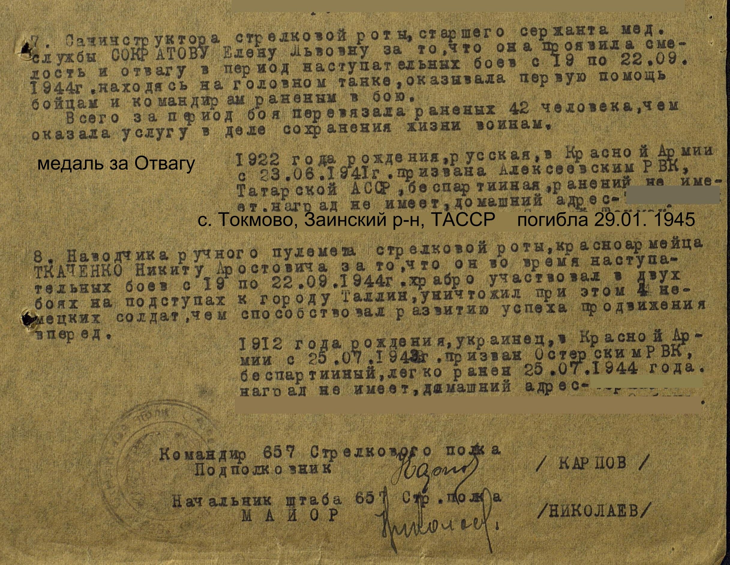 СОКРАТОВА Елена Львовна, 1922, ст. Токмово (Токмач), Заинский р-н. Мобилизована Алексеевским РВК 23 июня 1941. Ст. сержант медицинской службы, санинструктор 657 СП 125 СД 42, 2 УдА ЛенФ и 21 А 1 УкрФ. Награждена медалью "За отвагу": за период с 19 по 22 сент. 1944 оказала первую мед. помощь 42 бойцам и командирам. Погибла 29 янв. 1945, Германия, Гроссшилендорф.