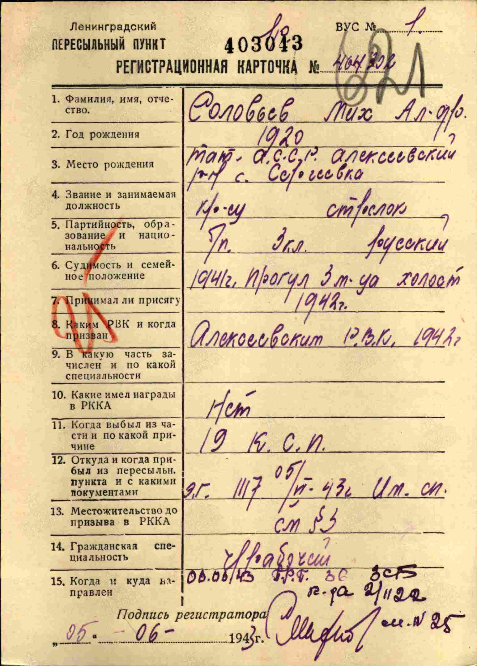 СОЛОВЬЁВ Михаил Александрович, 1920, с. Сергиевское. Мобилизован 1 авг. 1942. Красноармеец, номер арт. орудия 123 отд. СБр 67 А Ленинградского фронта. Ошибочно учтён погибшим 18 янв. 1943 вл время прорыва блокады. Воевал миномётчиком в составе 73 отд морской СБр и 19 СП 90 СП 2 УдА ЛенФ, имел два ранения. В 1944 – мл. сержант, санитар санроты 1238 СП 372 СД 23 А ЛенФ. Погиб 30 июня 1944, п. Сорвала, Выборгский (Виипури) р-н, КФССР (Ленинградская обл.).