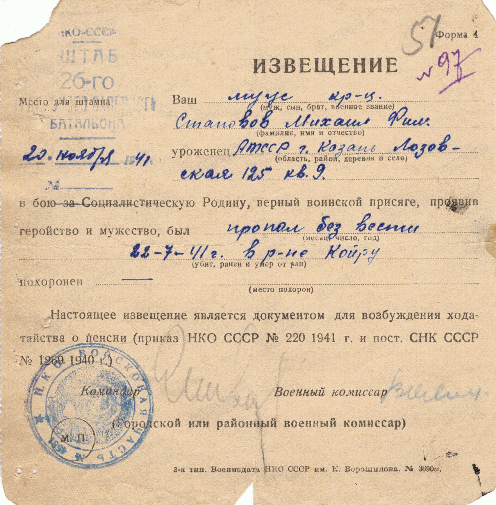 СТАНОВОВ Михаил Филиппович, 1907, д. Берёзовка. Перед войной жил в г. Казань на ул. Лозовая. На фронте с первых дней войны. Красноармеец 26 отд. сапёрного батальона 11 СД. Пропал без вести в р-не Койру, Эстония. Попал в плен. В 1945 был освобождён.