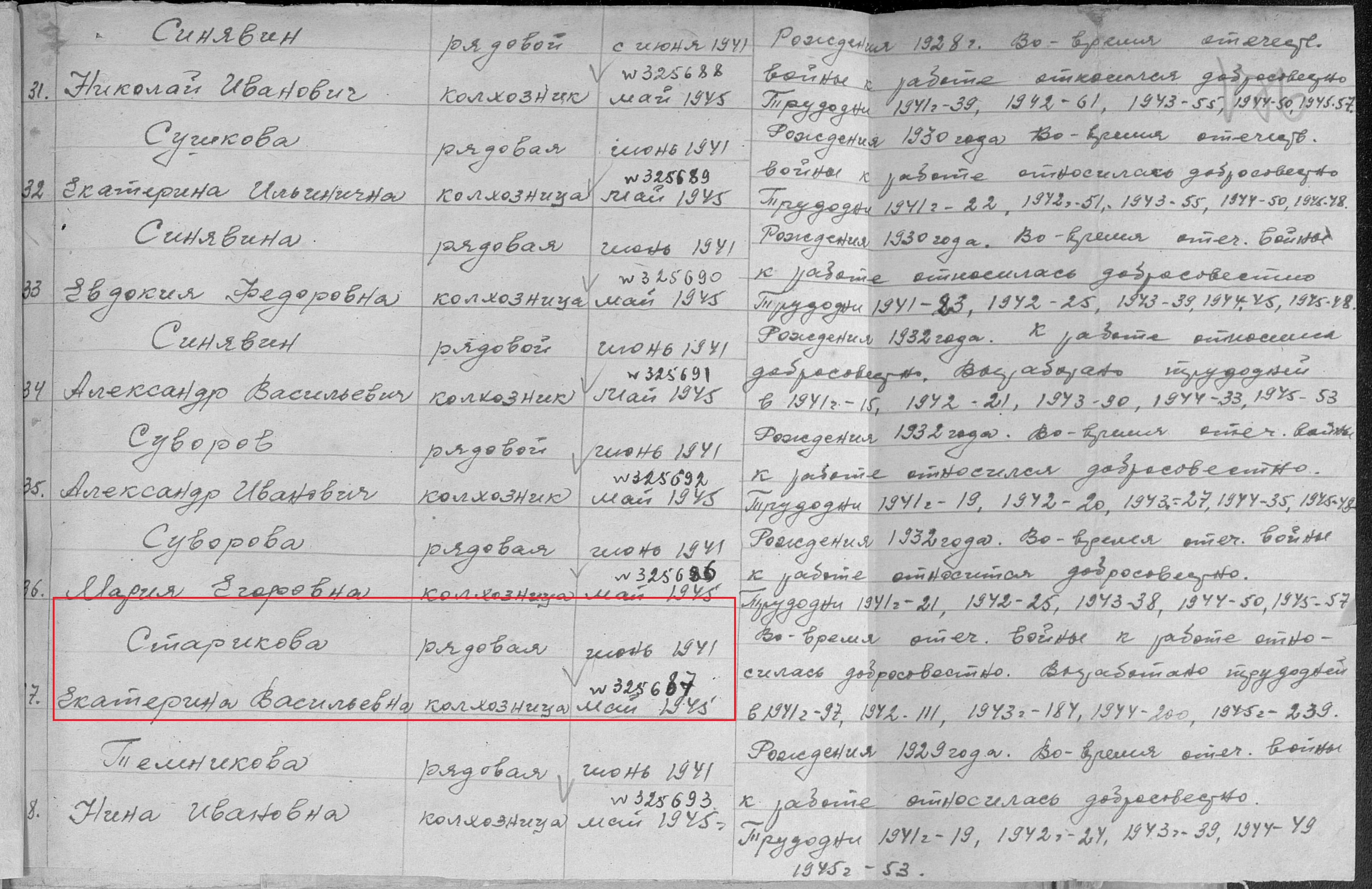 Старикова Екатерина Васильевна родилась в 1920 году в с.Новошешминск Чистопольского кантона ТАССР. В годы Великой Отечественной войны работала в колхозе им. Чкалова рядовой колхозницей. Награждена медалью "За доблестный труд в Великой Отечественной войне 1941–1945 гг." (Акт от 01.1946 г., фонд 3610, опись 2, дело № 470, лист 175, АК № 325687). Умерла в 2000 году, похоронена на сельском кладбище с.Новошешминск.