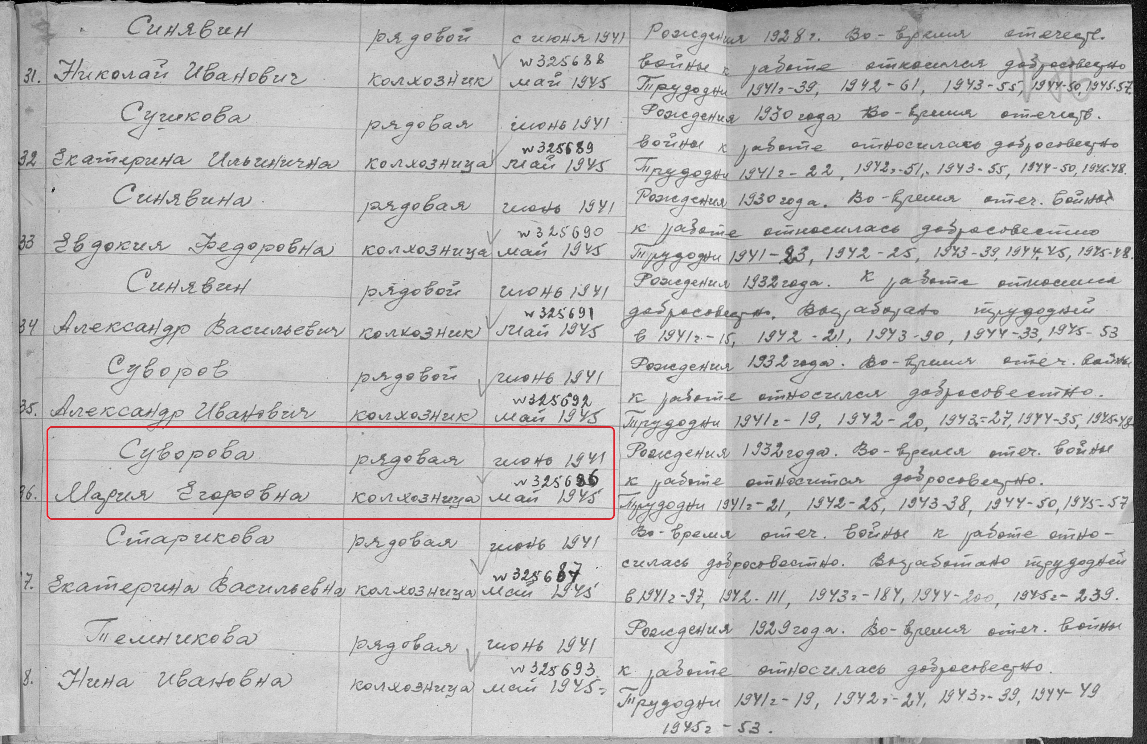 Старикова (Суворова) Мария Егоровна родилась в 1932 году в с.Новошешминск Чистопольского кантона ТАССР. В годы Великой Отечественной войны работала в колхозе им. Чкалова рядовой колхозницей. Награждена медалью "За доблестный труд в Великой Отечественной войне 1941–1945 гг." (Акт от 01.1946 г., фонд 3610, опись 2, дело № 470, лист 175, АК № 325685). Умерла 17 октября 2016 года, похоронена на сельском кладбище с.Новошешминск.