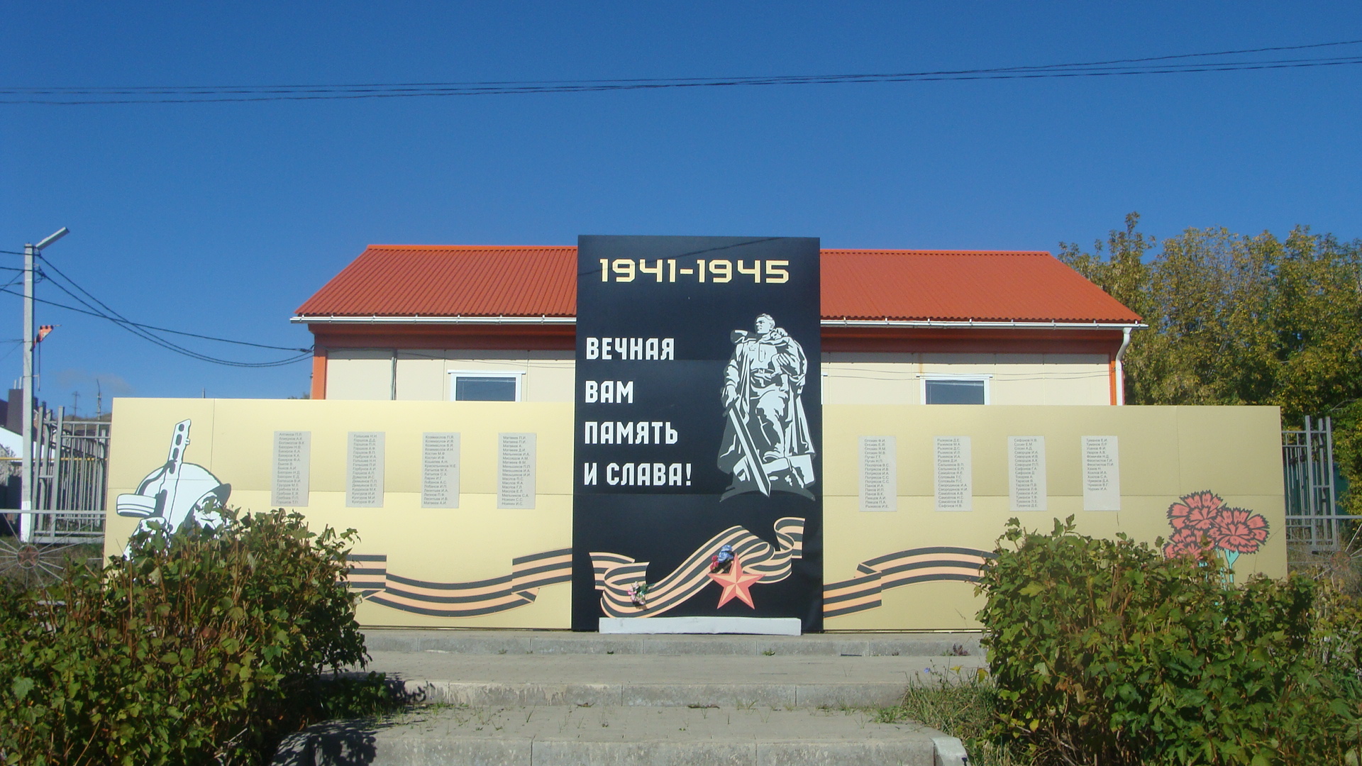 Заливной фундамент. Каркас металлический. Облицовка композитной панелью. В середине надпись: «1941-1945 ВЕЧНАЯ ВАМ ПАМЯТЬ И СЛАВА» (2,5х4,2). Слева и справа на мемориальных таблицах фамилии и имена погибших воинов (10х2,4). Площадка, ступени – брусчатка. Площадь композиции – 12,5м. территория ограждена металлическим забором.