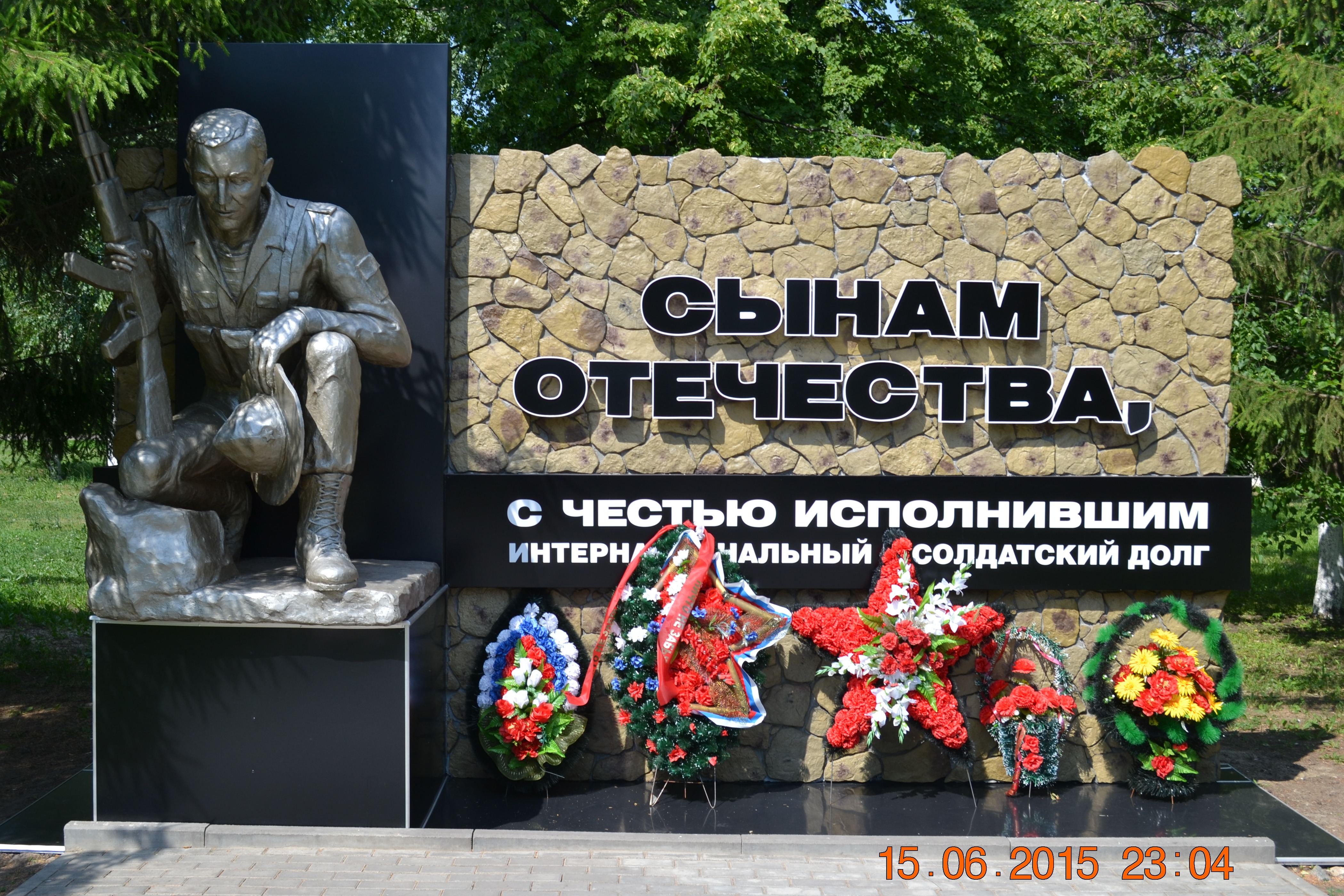 Стела «Участникам локальных войн» открыта 2 мая 2015 г., выс. 2,5 м., ширина 4,5 м. В левой части перед стелой на постаменте – фигура (статуя) коленопреклоненного солдата с автоматом АК и снятым головным убором (панама для жарких районов). На примыкании к стеле надпись «Сынам Отечества, с честью выполнившим интернациональный солдатский долг»