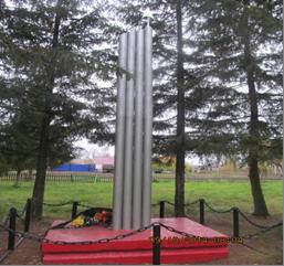 Стела состоит из металлических труб высотой 2,5 м, на постоменте шириной 0,5 м, длиной- 0,5 м., увенчанная пятиконечной звездой,