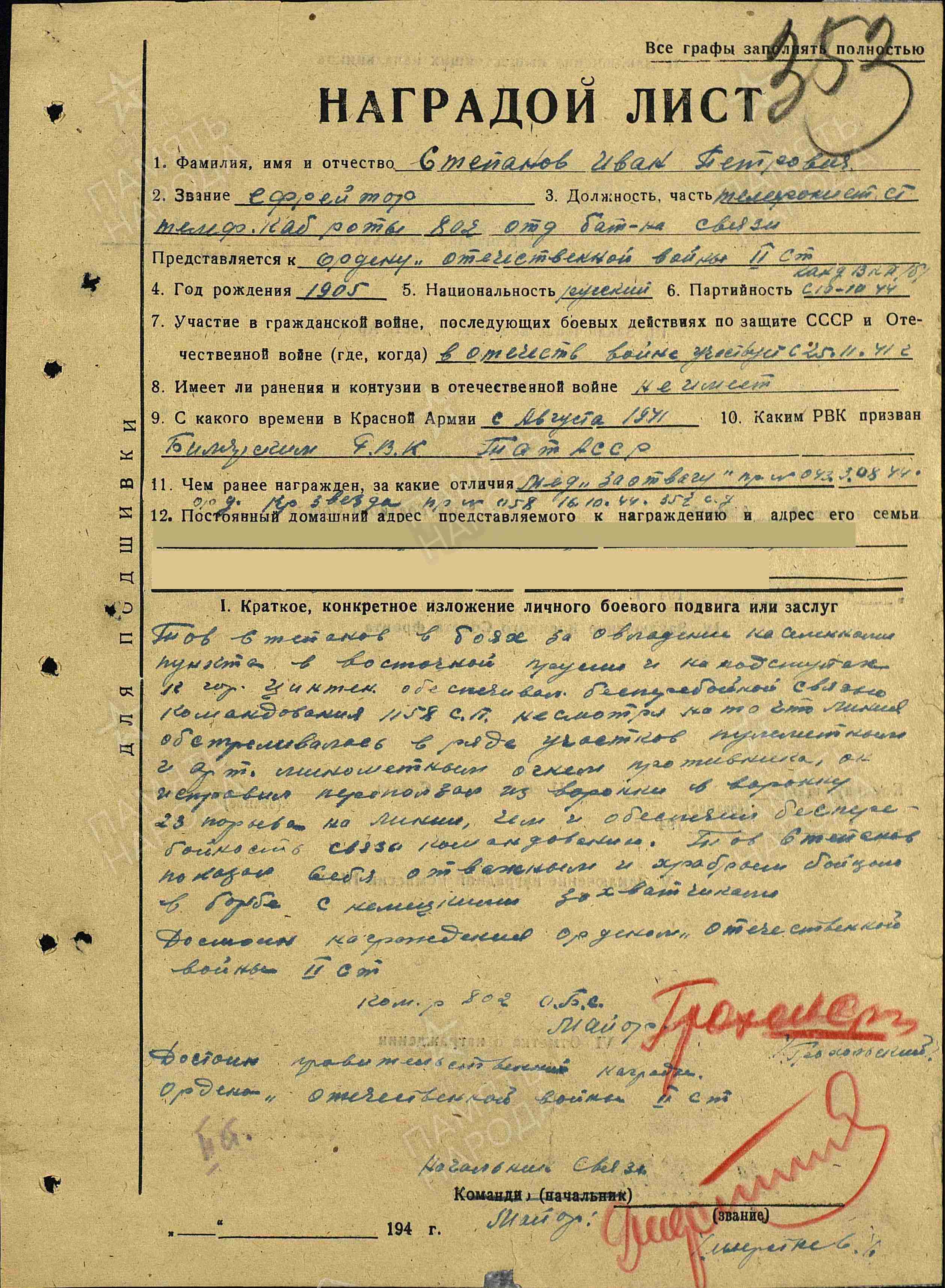 СТЕПАНОВ Иван Петрович, 1905, уроженец Саратовской губ. Жил в с. Билярск. Мобилизован Билярским РВК 26 авг. 1941. С 25 нояб. 1941 воевал на Западном и 3 Белорусском фронте в составе 20 А/ 5 А/ 49 А/ 31 А. Перенёс лёгкое ранение 27 марта 1944. Канд. ВКП(б). Участник обороны Москвы, освобождения Смоленщины, Белоруссии, боёв в Вост. Пруссии. Ефрейтор, телефонист взвода связи 1158 СП, ст. телефонист 218 отд. роты связи/ телефонно-кабельной роты 802 отд. батальона связи 352 СД. Погиб 15 фев. 1945, м. Домерау (замок) г. Цинтен (п. Корнево, Багратионовский р-н), Вост. Пруссия (Калининградская обл.). Награждён медалями "За оборону Москвы", "За отвагу", орденами Красной Звезды (1944), Отечественной войны 2 ст. (посмертно).