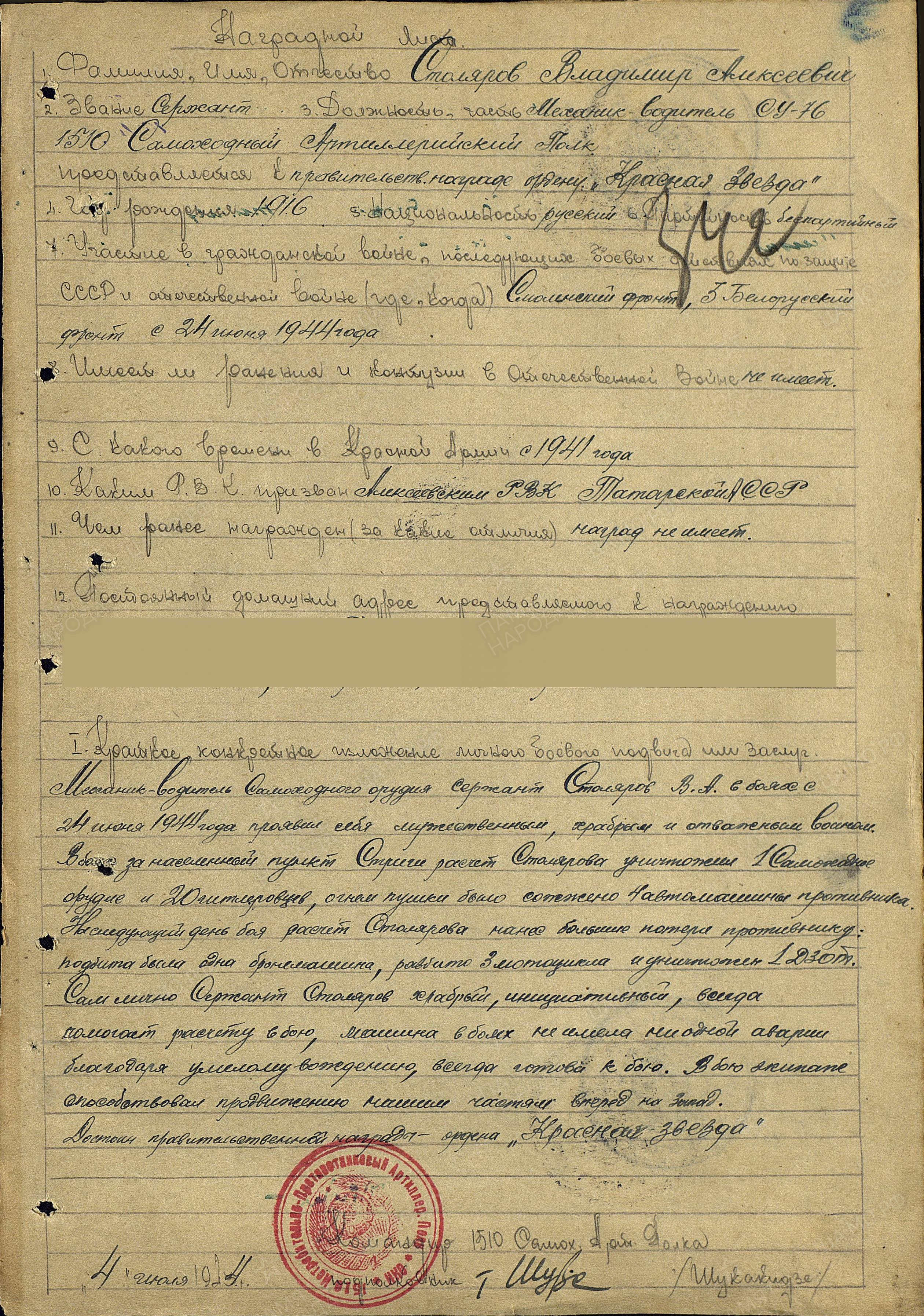 СТОЛЯРОВ Владимир Алексеевич, 1916, с. Алексеевское. Мобилизован Алексеевским РВК в 1941. На фронте с лета 1944. Сержант, механик-водитель 1510 САП 3 гв. МехК 3 БелФ и 1 ПрибФ. В боях за н.п. Стриги (операция «Багратион»), расчёт САУ уничтожил одно самоходное орудия, 20 гитлеровцев, четыре автомашины, подбита одна бронемашина, уничтожен ДЗОТ и три мотоцикла. Награждён орденом Красной Звезды. 19 сент. 1944, в бою за г. Балдоне, Латвия, расчёт уничтожил один танк, одно САУ «Артштурм», три пулемётные точки и до 40 гитлеровцев. Представлен к ордену Отечественной войны 2 ст. Награждён орденом Славы 3 ст.