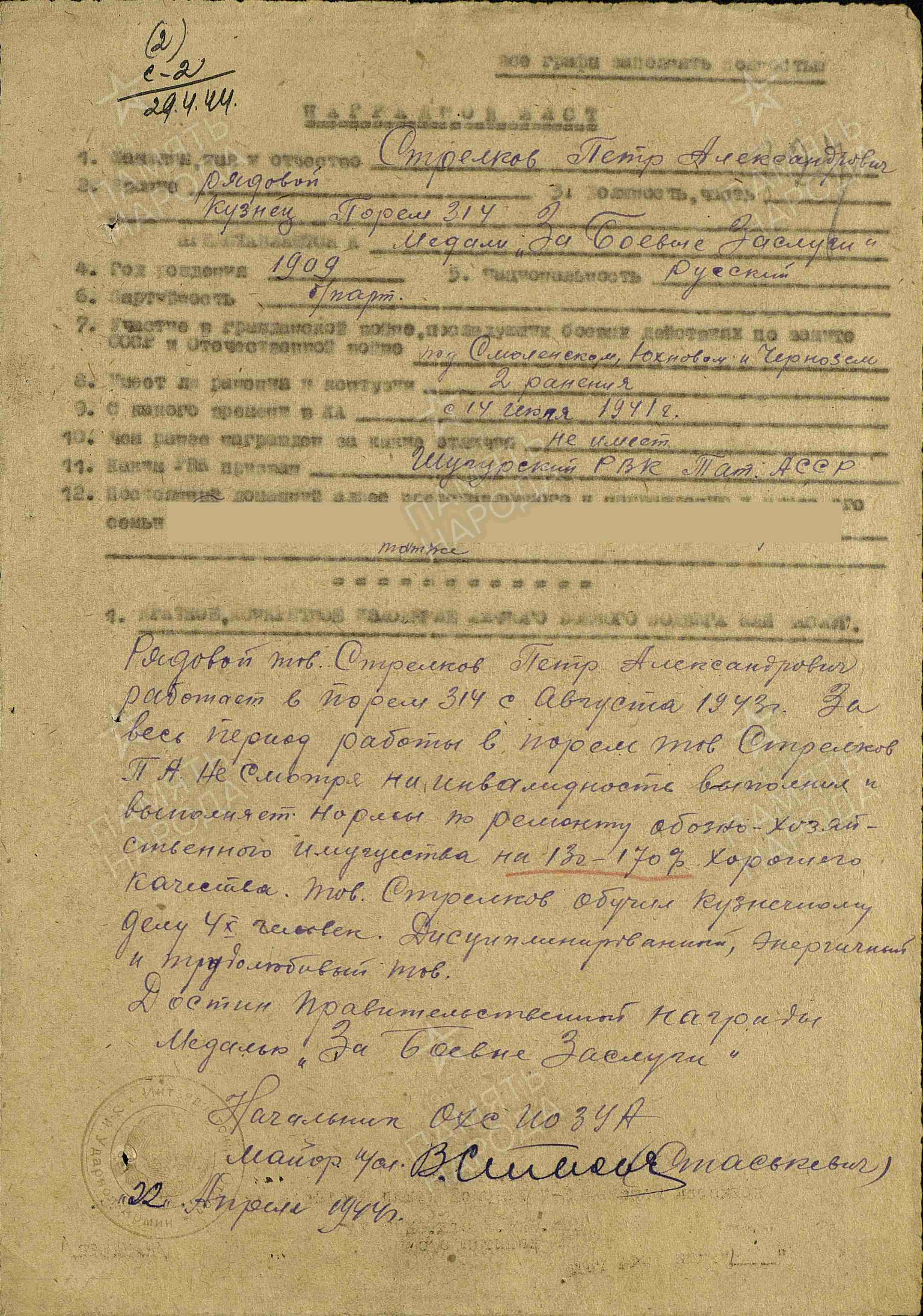 С 08.1942г по 03.1945 г. – кузнец 3-й походной обозно-ремонтной мастерской 314, 2 Прибалтийский фронт.