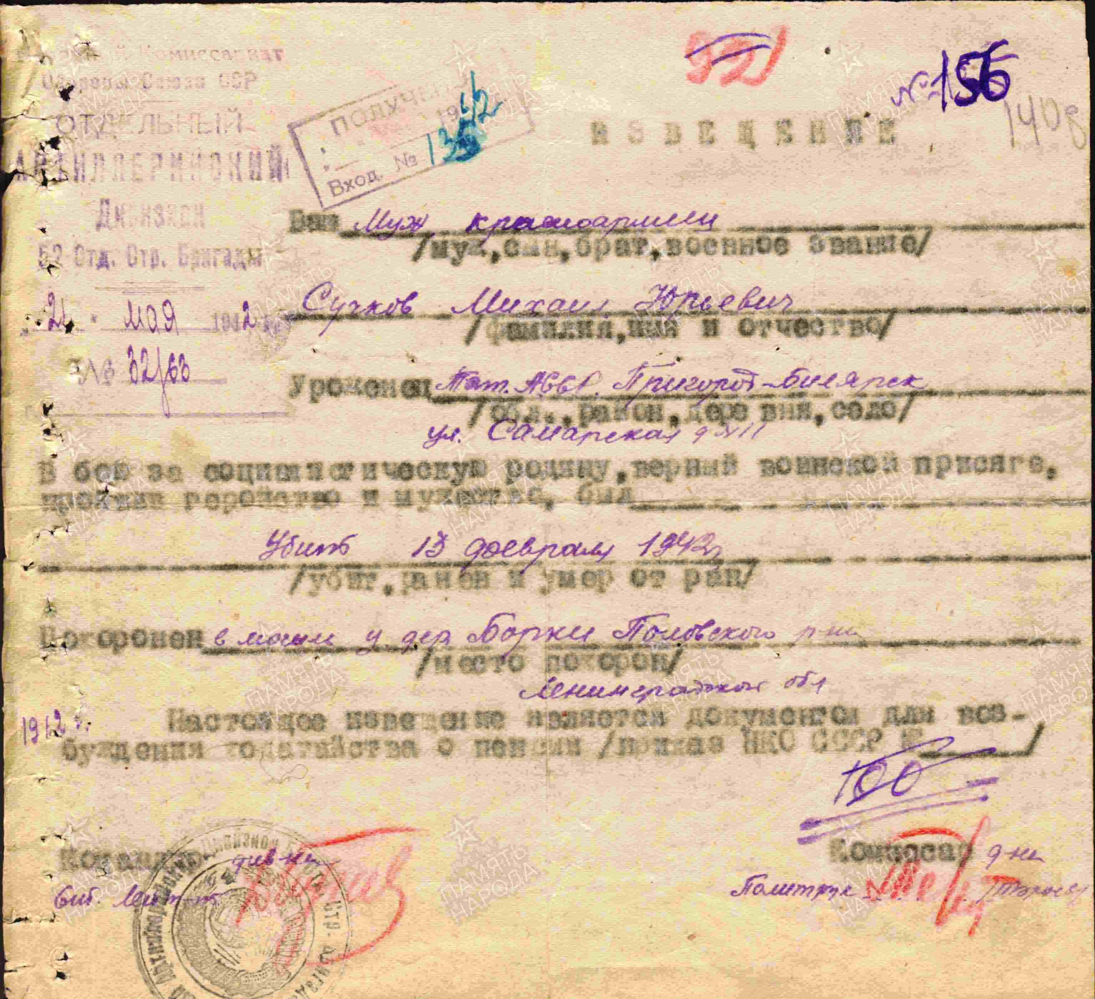 СУЧКОВ Михаил Юрьевич, 1912, с. Билярск. Мобилизован Билярским РВК 2 июля 1941. Участник обороны Москвы. Красноармеец, наводчик отд. арт. дивизиона 52 отд. СБр Московской зоны обороны/ 1 гв. СК Северо-Западного фронта. Погиб 13 фев. 1942, д. Борки, Полавский (Парфинский) р-н, Новгородская обл.