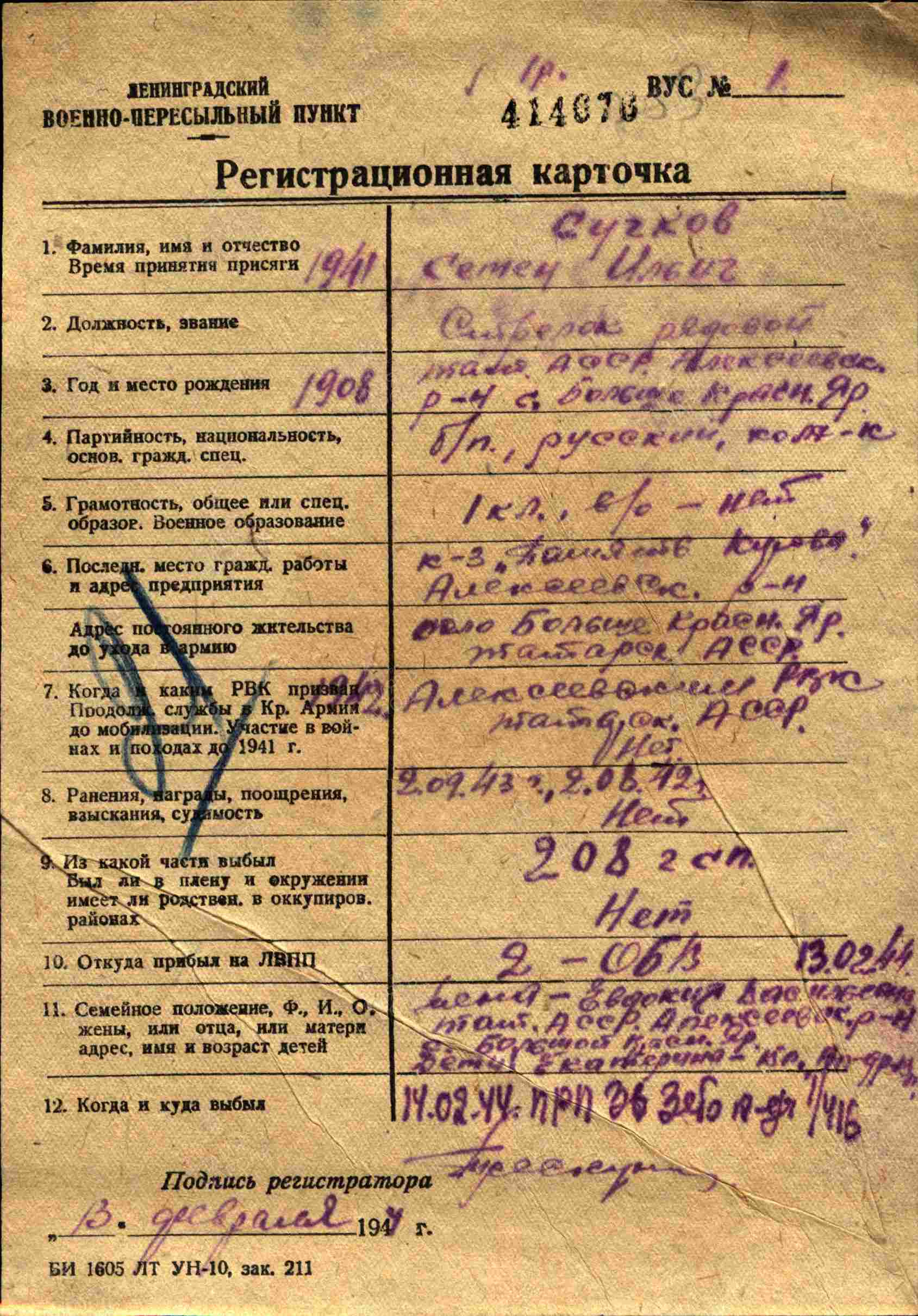 СУЧКОВ Семён Ильич, 1908, с. Большой Красный Яр. Мобилизован 25 сент. 1941 Алексеевским РВК, повторно – 27 марта 1943. Воевал на Ленинградском фронте в составе 67 А. Краноармеец, стрелок 142 отд. морской СБр/ гв. красноармеец, 194 гв. СП 64 гв. СД. Участник прорыва и снятия блокады Ленинграда. Перенёс три ранения: 2 авг. 1942, 6 фев. 1943, 21 янв. 1944. Ошибочно учтён погибшим 26 янв. 1943 у р.п. № 6, Мгинский (Кировский) р-н, Ленинградская обл. Проходил лечение в ЭГ 268, ЭГ 2222, ЭГ 1449, г. Ленинград. В марте 1944 выбыл 36 отд. батальон выздоравливающих. Дальнейшая судьба не установлена.