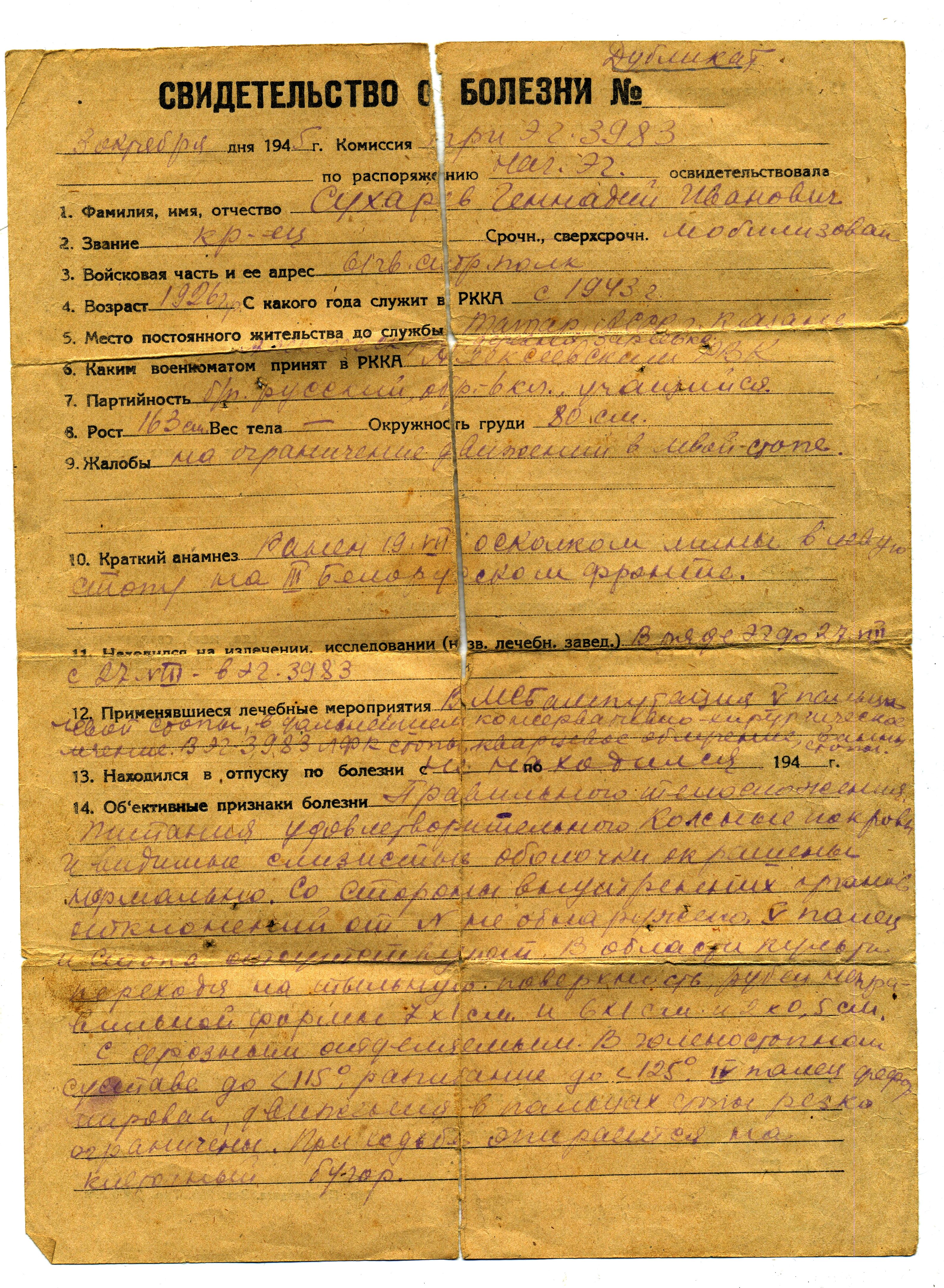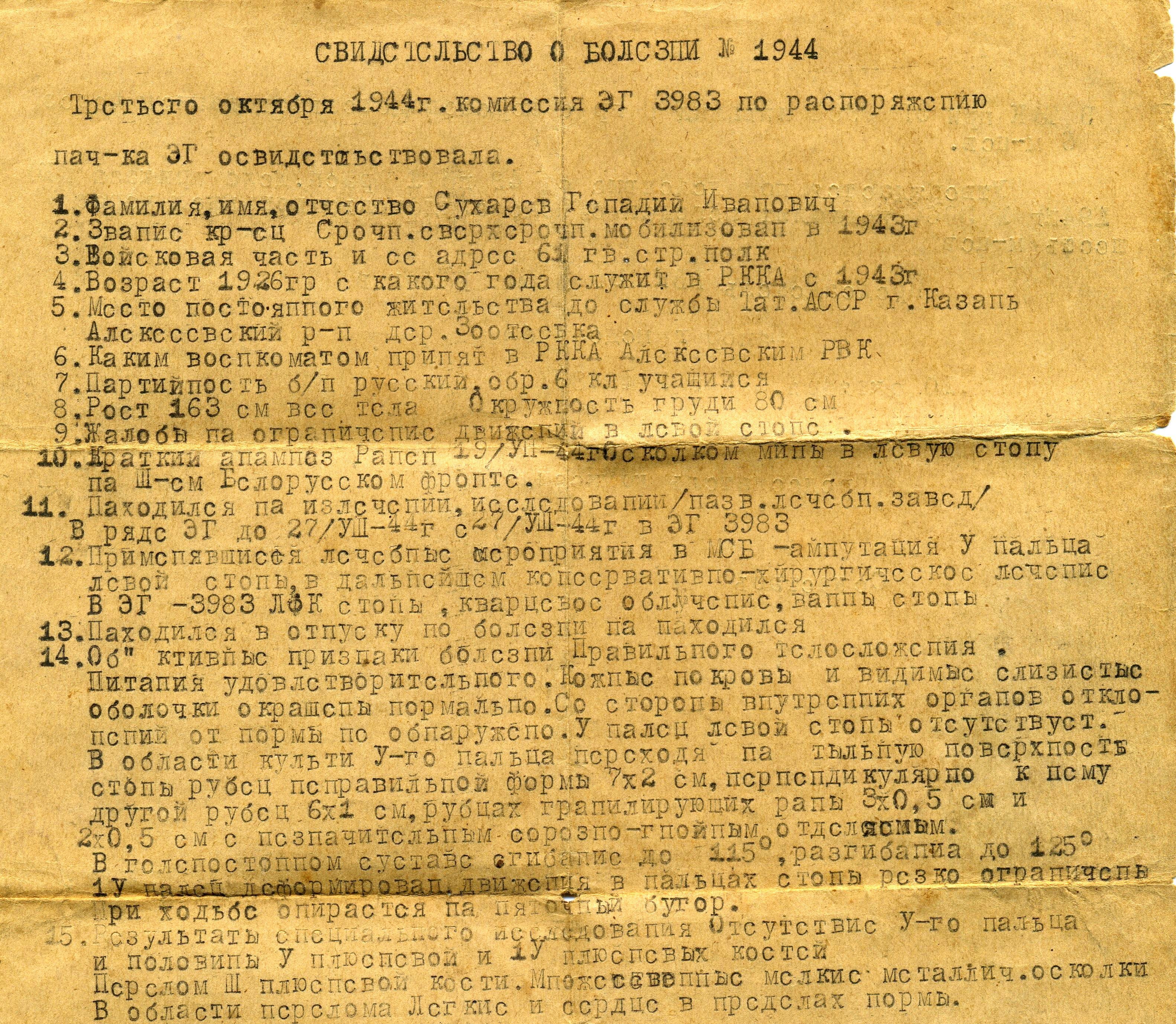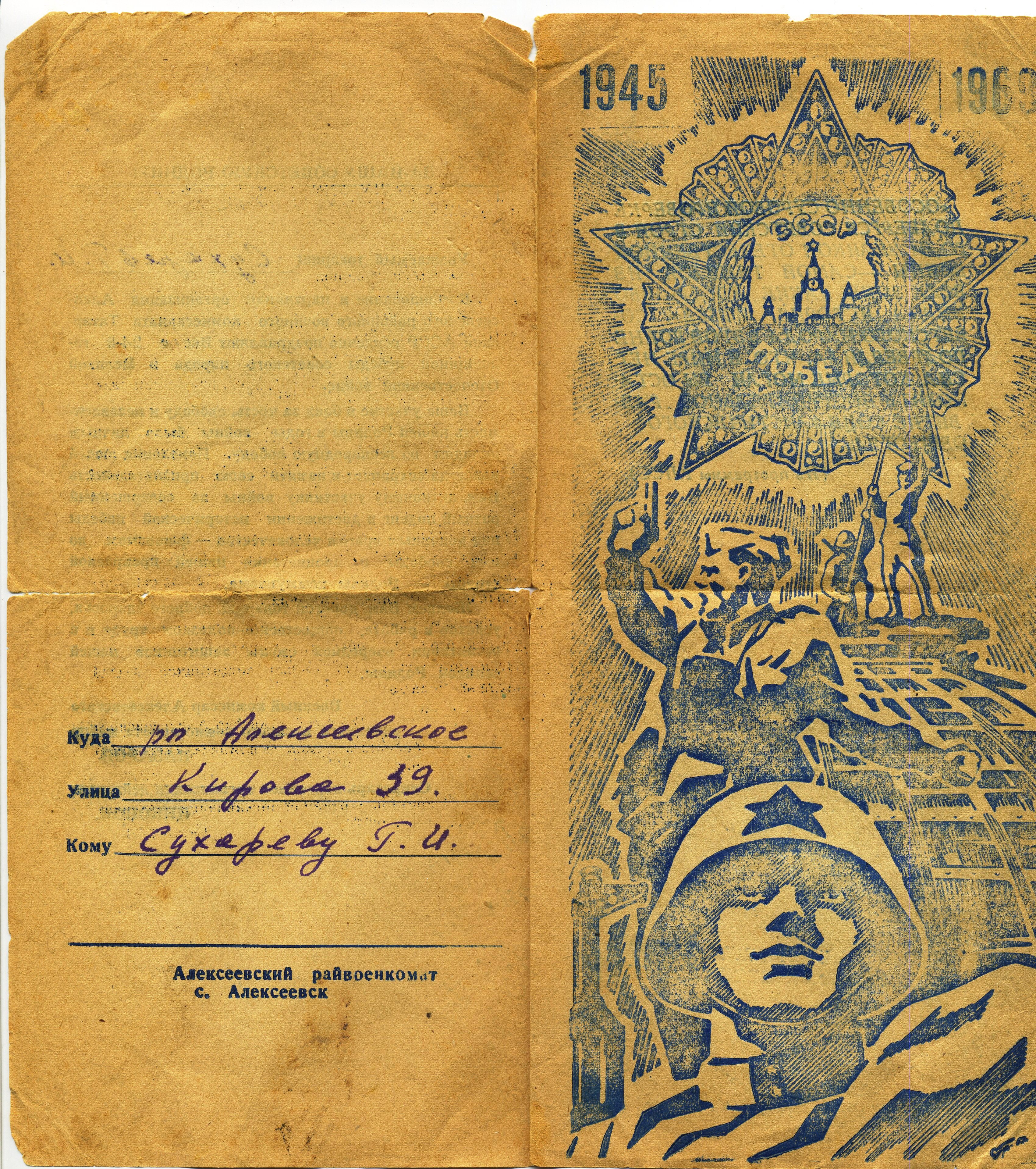 СУХАРЕВ Геннадий Иванович, 1926, д. Зотеевка. Мобилизован Алексеевским РВК в 1943 г. Гв. красноармеец 61 гв. СП 19 гв. СД. На фронте с 1944 г. Воевал в Белоруссии, 3 Бел. фронт. Тяжело ранен 27 августа 1944 г. осколком мины в левую стопу, после лечения признан негодным к стоевой службе, инвалид войны. Награждён медалью "За победу над Германией". Скончался в 1981 г. Похоронен в с. Алексеевское