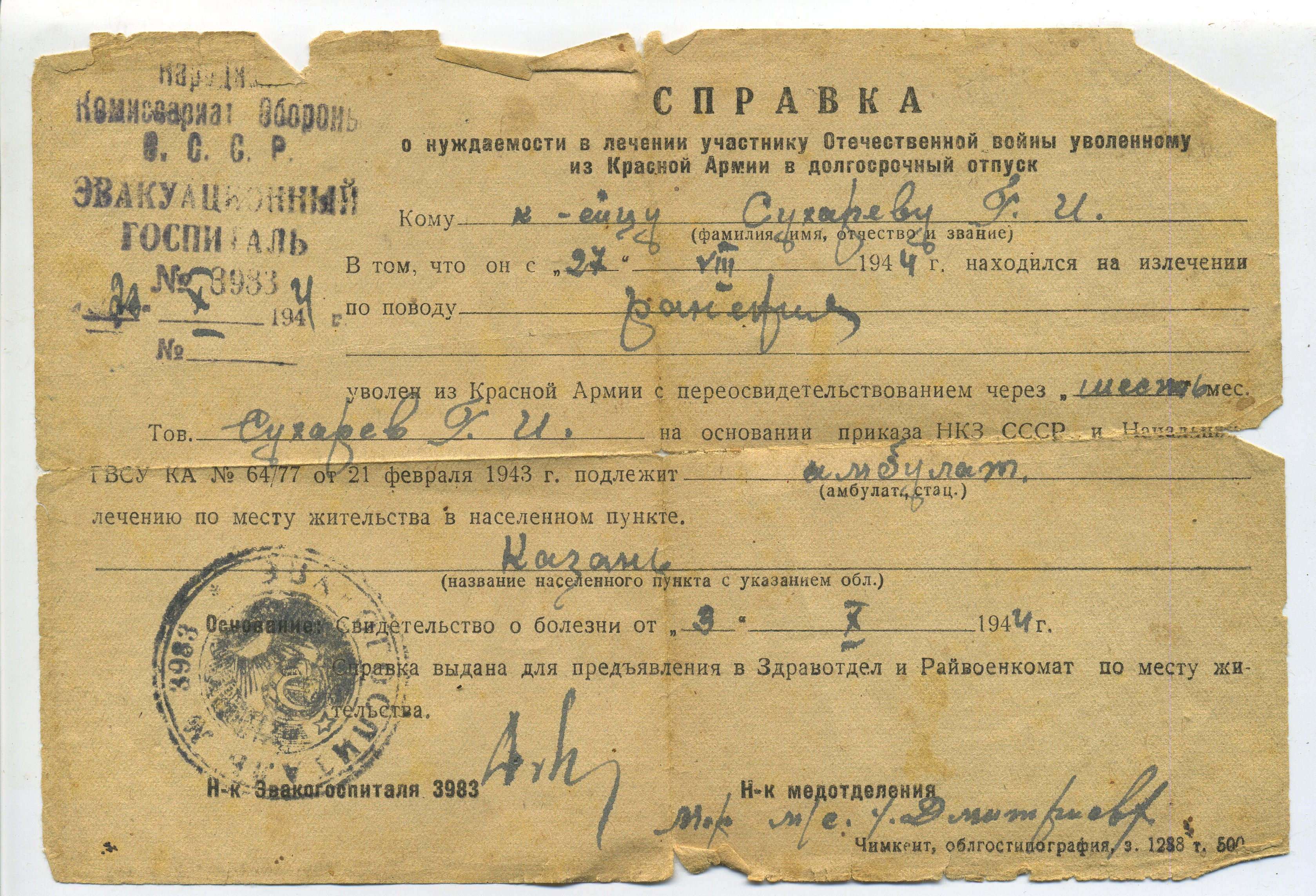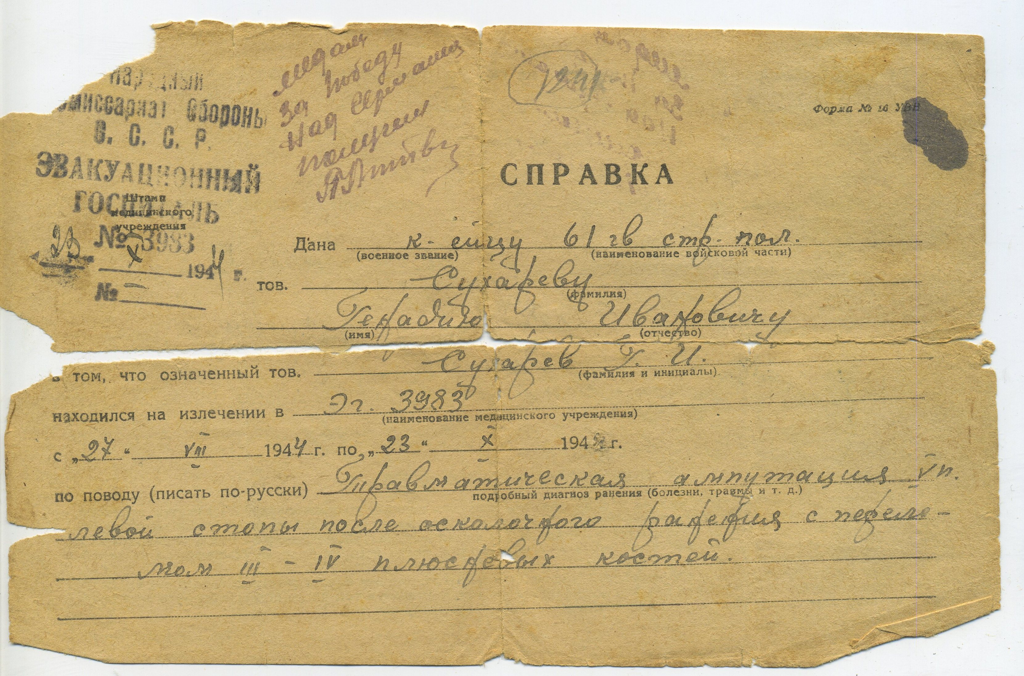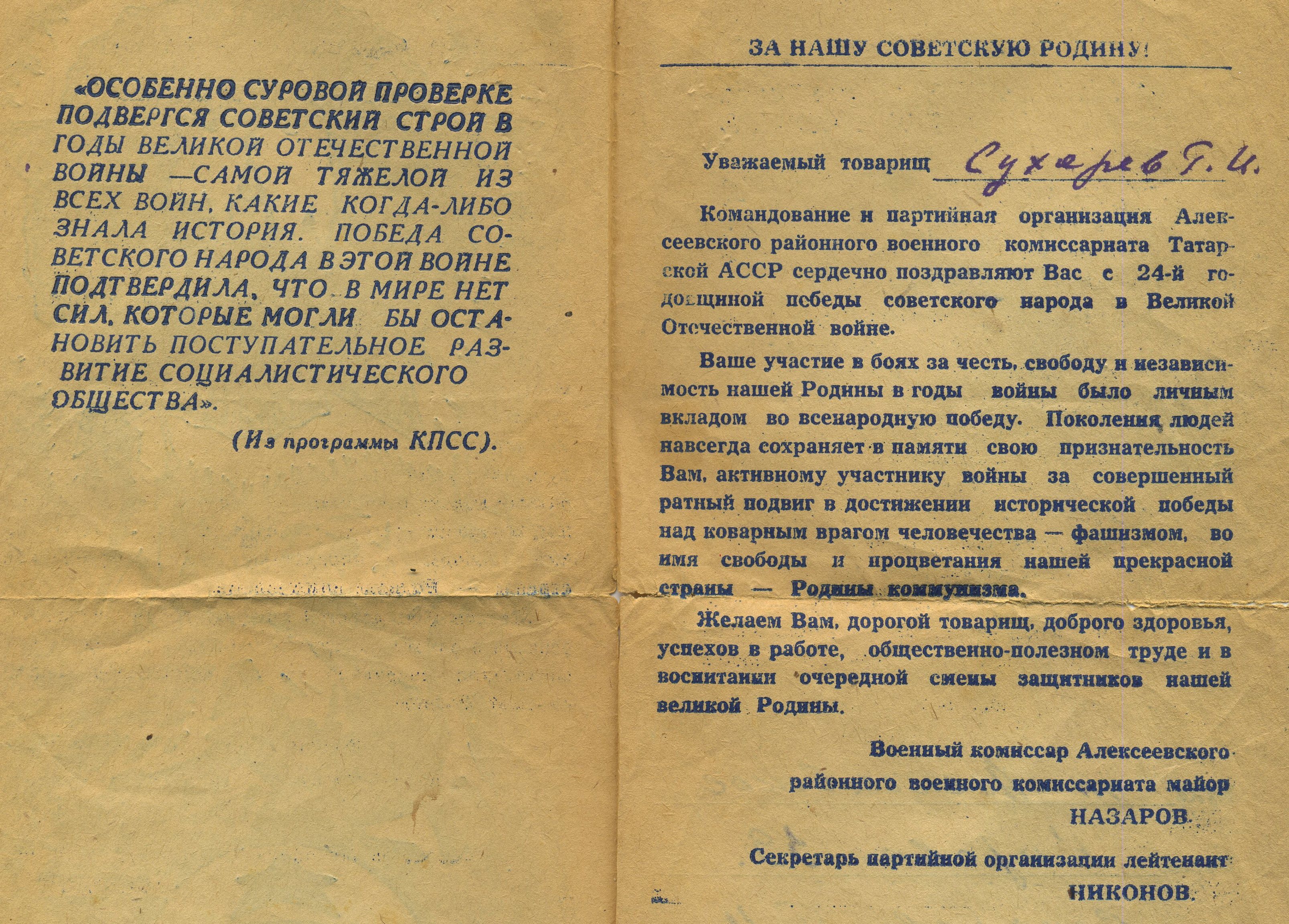 СУХАРЕВ Геннадий Иванович, 1926, д. Зотеевка. Мобилизован Алексеевским РВК в 1943 г. Гв. красноармеец 61 гв. СП 19 гв. СД. На фронте с 1944 г. Воевал в Белоруссии, 3 Бел. фронт. Тяжело ранен 27 августа 1944 г. осколком мины в левую стопу, после лечения признан негодным к стоевой службе, инвалид войны. Награждён медалью "За победу над Германией". Скончался в 1981 г. Похоронен в с. Алексеевское
