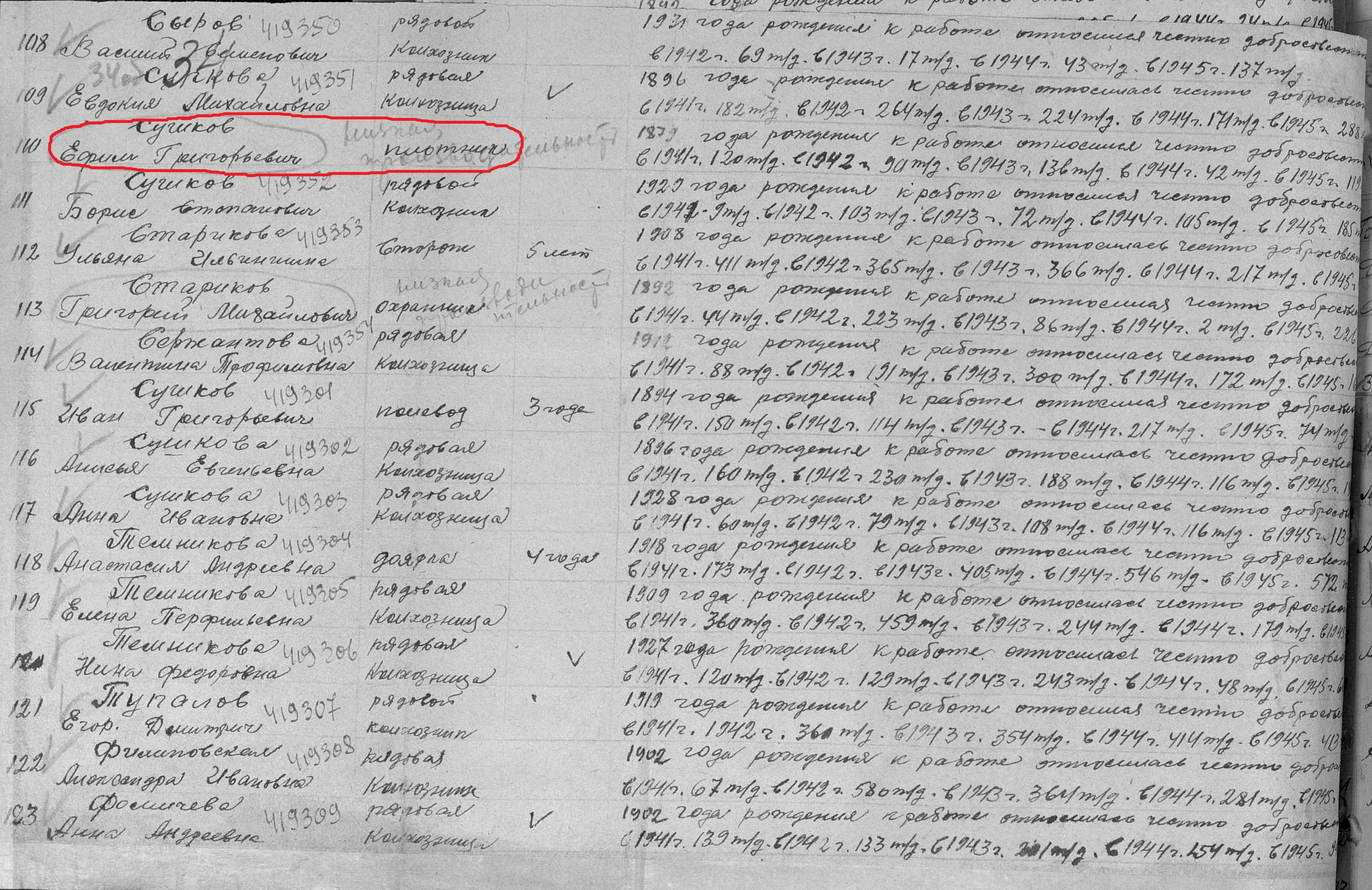 Сушков Ефим Григорьевич родился в 1879 году. Место жительства: с.Ново-Шешминск Ново-Шешминский район ТАССР. В годы Великой Отечественной войны работал в колхозе «Красный Октябрь» плотником. Награжден медалью "За доблестный труд в Великой Отечественной войне 1941–1945 гг." (Акт от 28 апреля 1947 г, фонд 3610, опись 2, дело № 325, лист 34).