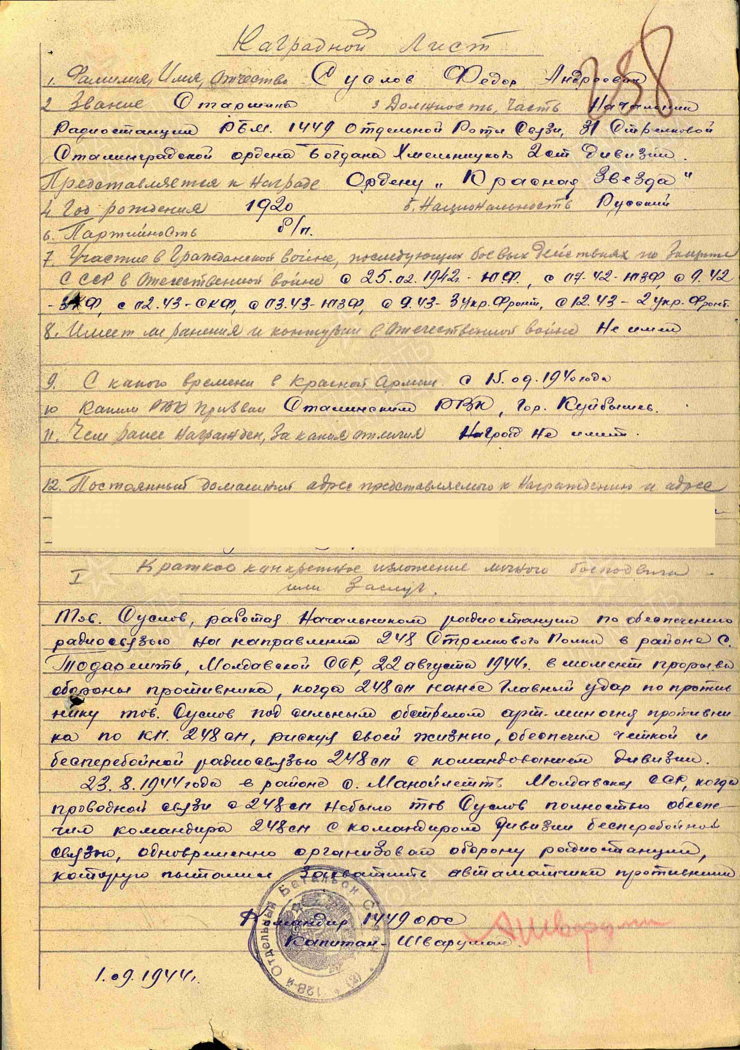 СУСЛОВ Фёдор Андреевич, 1920, с. Ромодан. Призван 15 сент. 1940 Сталинским РВК г. Куйбышев (Самара). С 25 фев. 1942 воевал на Южном, Юго-Западном, Закавказском, Северо-Кавказском, 3, 2 и 1 Украинском фронте в составе 56 А/ 12 А/ 18 А/ 48 А/ 4 гв. А/ 52 А. Участник обороны Кавказа, освобождения Донбасса, Украины, Молдавии, Польши. Старшина, нач. радиостанции РБМ 128 отд. батальона связи/ 1449 отд. роты связи 31 СД. Награждён орденом Красной Звезды.