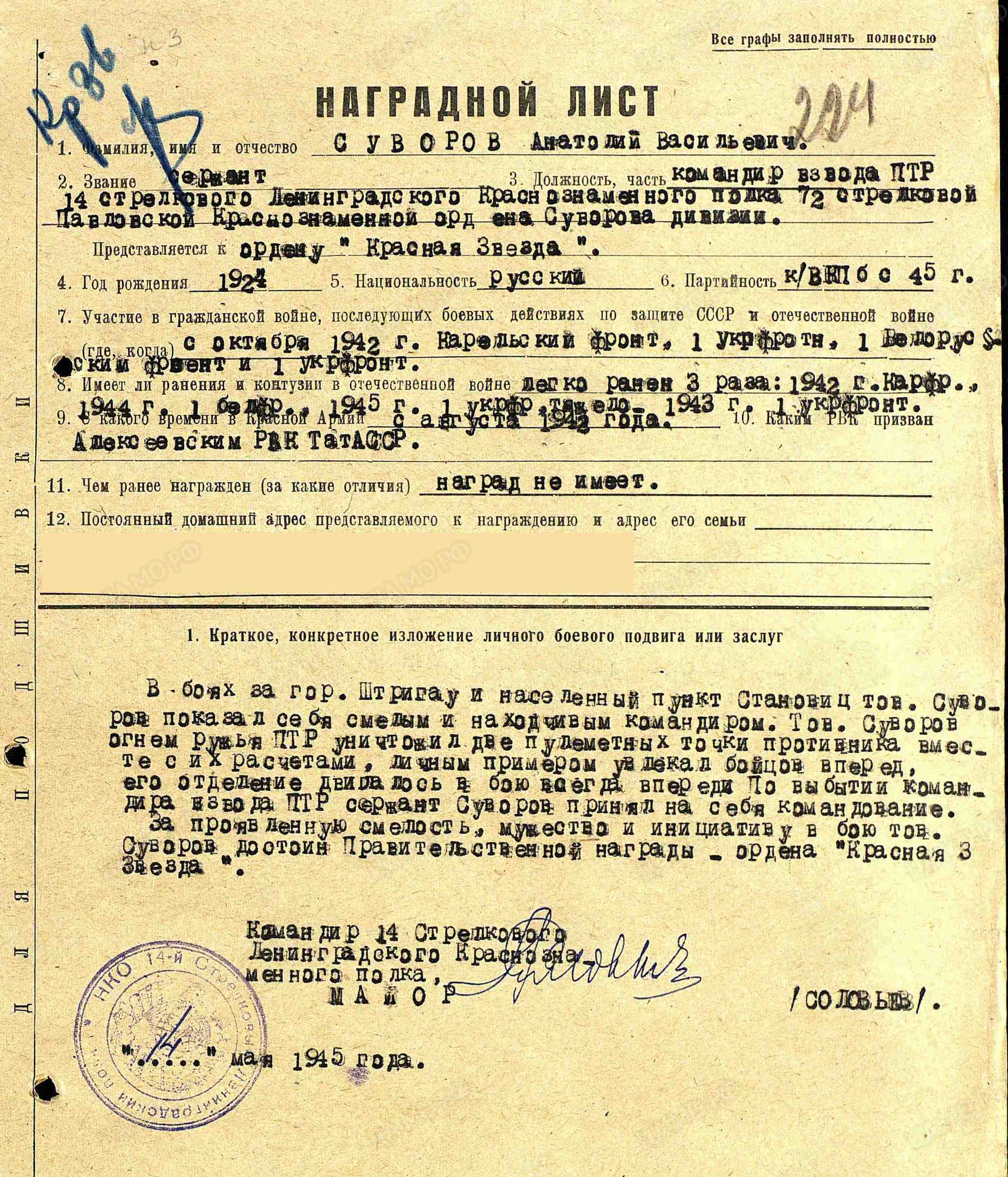 СУВОРОВ Анатолий Васильевич, 1924, с. Левашево. Мобилизован Алексеевским РВК в августе 1943г. В боях был трижды ранен: 13.3.43 под Курском, 16.7.43 под Орлом в ходе битвы на Курской Дуге, 6.2.45 у н.п. Класдорф - ранен тяжело. Сержант, ком. отделения 181 СП 291 СД 1 Украинского фронта. После тяжёлого ранения продолжил воевать в составе 14 СП 72 СД в качестве заместителя командира взвода ПТР. Награждён медалью "За отвагу", орденом Красной Звезды.