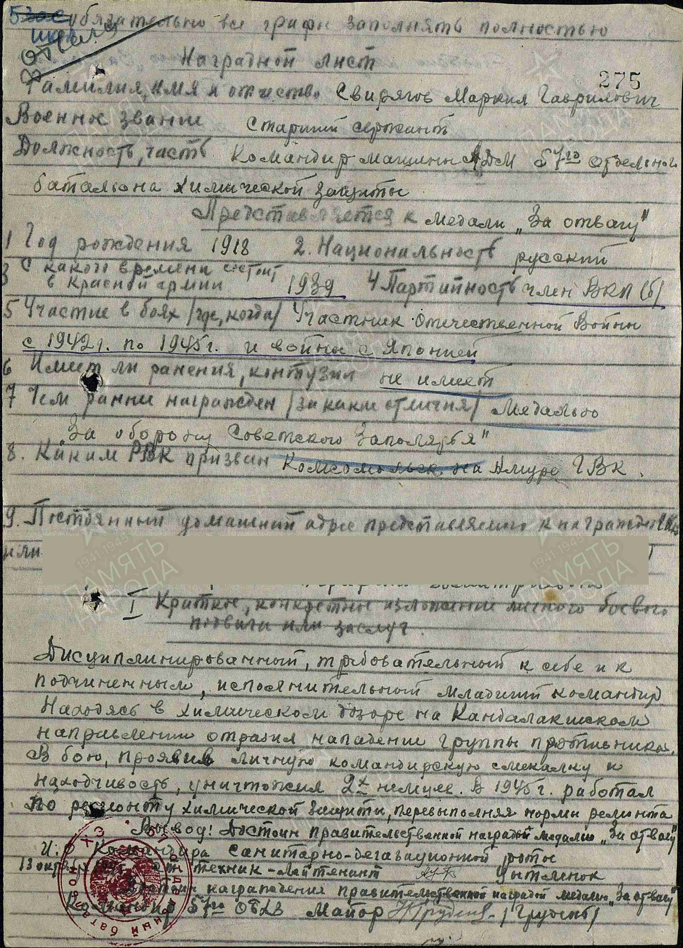 СВИРЯГОВ Маркел Гаврилович, 1918, д. Ямкино. Мобилизован в окт. 1939 Комсомольским ГВК г. Комсомольск-на-Амуре, Хабаровский край. Член ВКП(б). Ст. сержант, ком. отделения дегазации оружия и мат. части санитарно-дегазационной роты 57 отд. батальона хим. защиты Карельского фронта, ком. машины АДМ, 5 А 1 Дальневосточного фронта. Награждён медалями «За отвагу», «За оборону Советского Заполярья», «За победу над Японией».