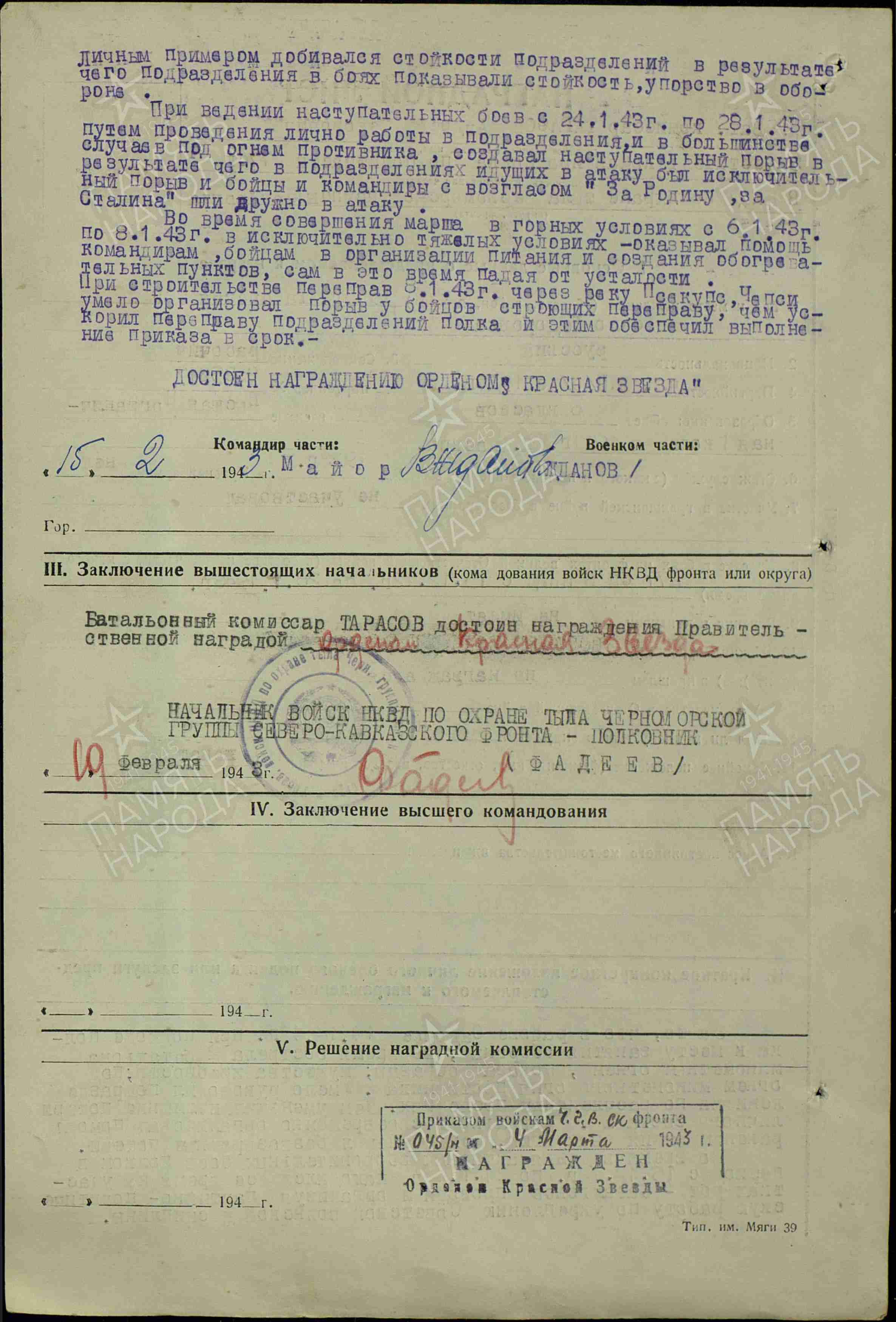 ТАРАСОВ Андрей Фёдорович, 1905, д. Фёдоровка. В армии с 1927. Член ВКП(б). Окончил Военно-политическую школу ОГПУ, Высшую пограничную школу в г. Москва. Батальонный комиссар, майор, зам. ком. полка по полит. части 277 СП войск НКВД по охране тыла Черноморской группы войск Закавказского и Северо-Кавказского фронта, зам. ком. 135 СП 6 СД ВВ НКВД Белорусского военного округа. Вышел в отставку в звании «подполковник». Награждён медалью «За оборону Кавказа», орденами Красной Звезды (1943), Отечественной войны 2 ст. (1944), Красного Знамени (1945), Ленина (1949).
