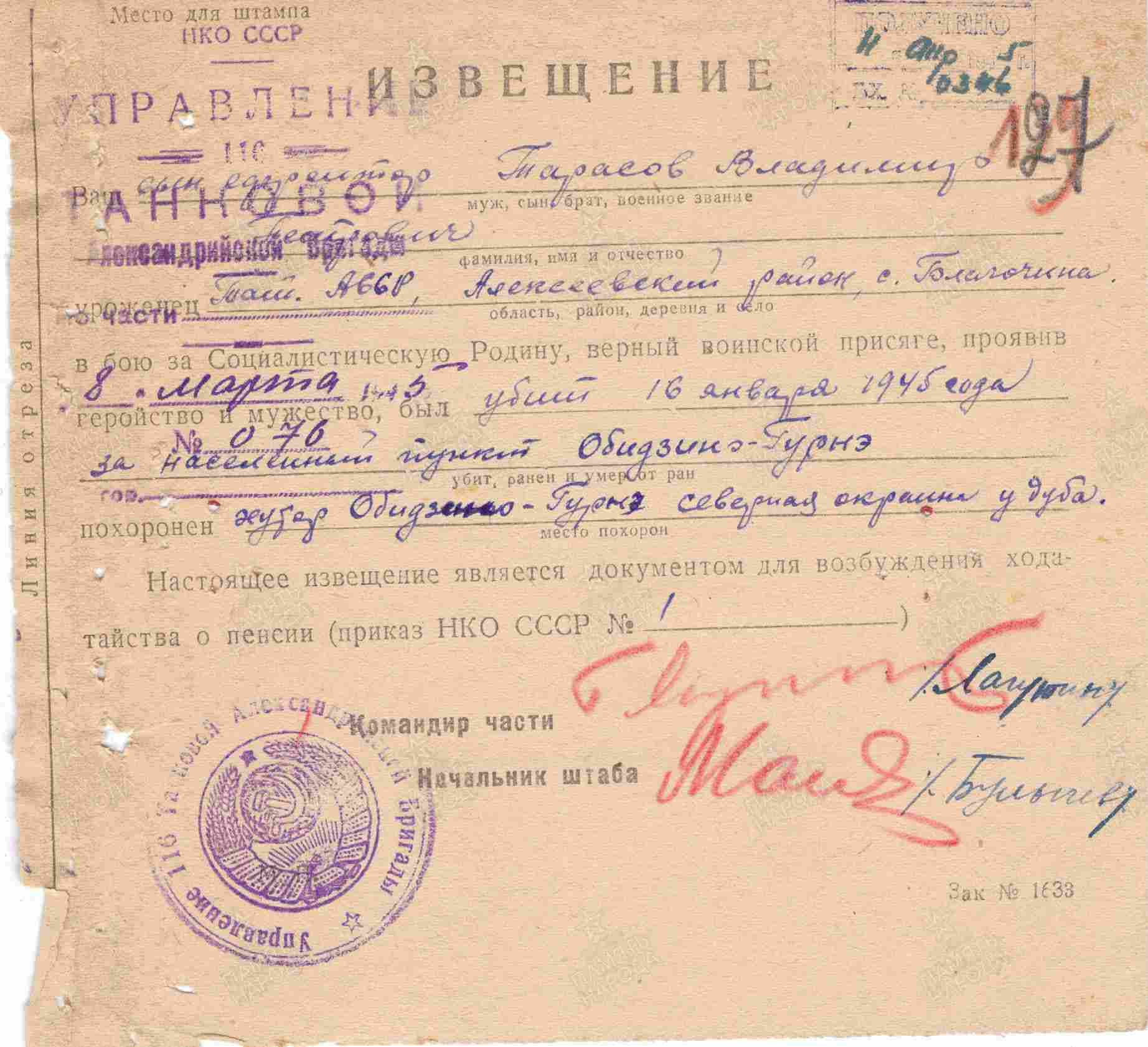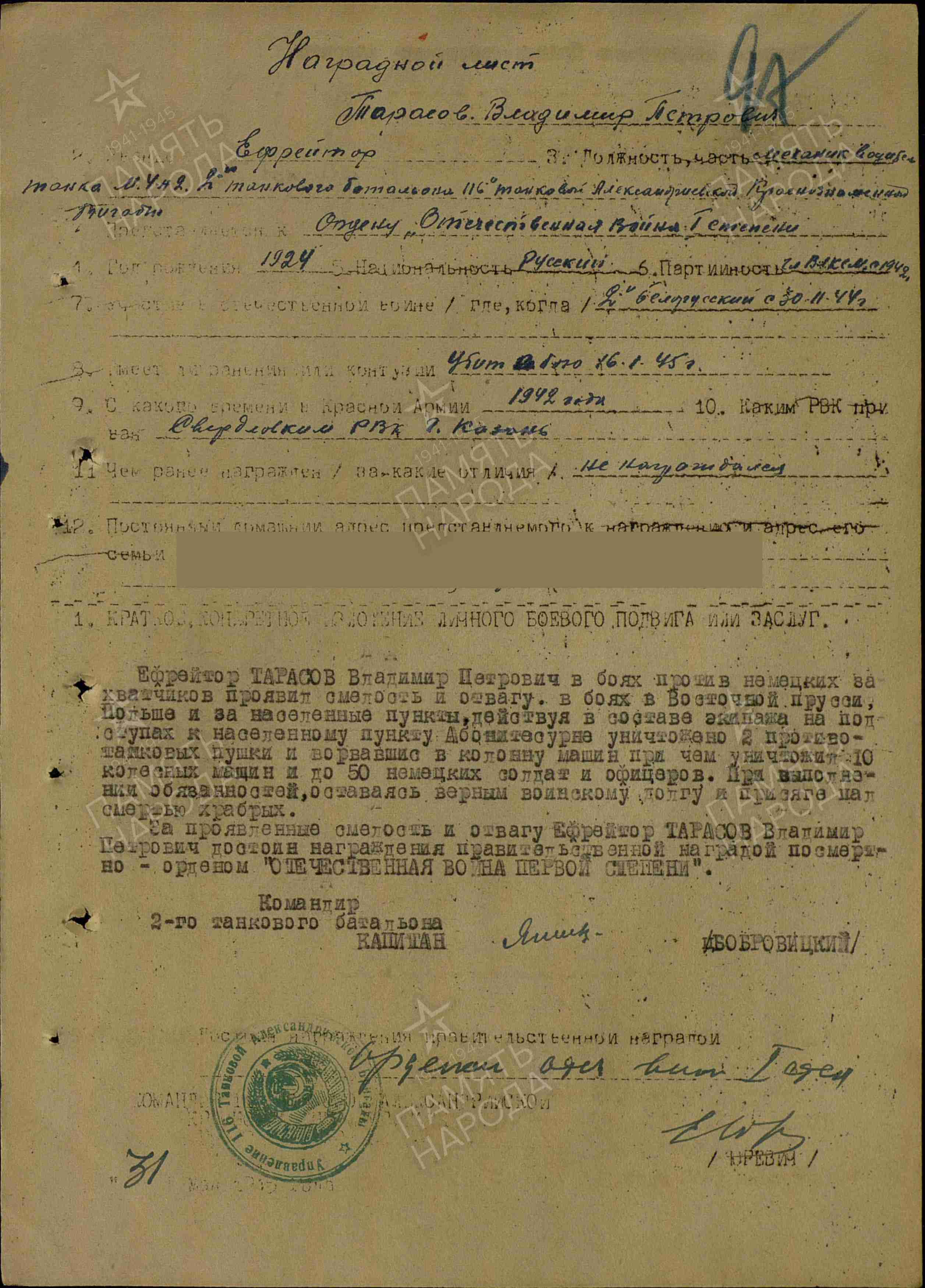 ТАРАСОВ Владимир Петрович, 1924, с. Балахчино. Мобилизован Свердловским РВК г. Казань в авг. 1942. Член ВЛКСМ. На фронте с 30 нояб. 1944. Ефрейтор, механик-водитель танка М4-А2 116 ТБр 8 МехК 2 Белорусского фронта. Принимал участие в боях на территории Вост. Пруссии и Польши. Погиб 16 янв. 1945. Награждён орденом Отечественной войны 1 ст. посмертно.