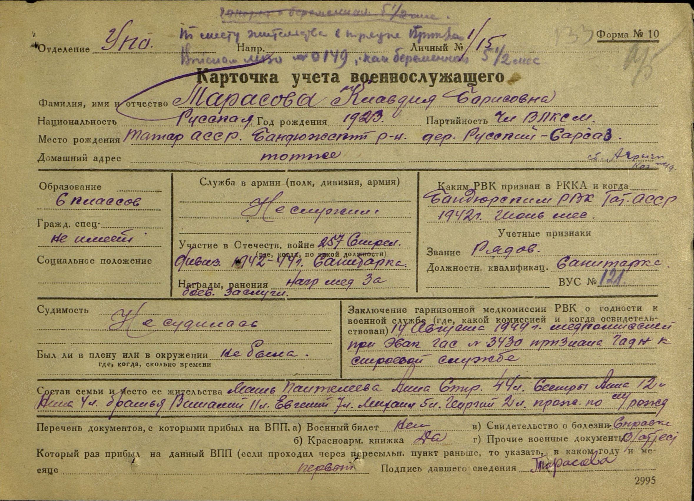В РККА с 07.1942 года. Место призыва: Бондюжский РВК, Татарская АССР, Бондюжский р-н. Красноармеец, санитарка приемосортировочного и эвакуационного отделений отдельной медсанроты 60 отдельной Краснознаменной стрелковой бригады. Западный, Закавказский, Северо-Кавказский фронт.