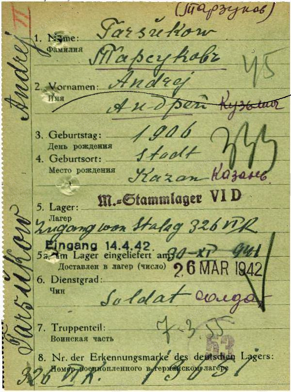 ТАРСУКОВ Андрей Кузьмич, 1906, с. Куркуль. Мобилизован Алексеевским РВК в 1941. Красноармеец 131 СП 71 СД, Сев.-Зап. фронт. 28 июля 1941 в боях у Чудского озера был ранен и попал в плен. Содержался в лагере VI K\D (326), Фореллькруг/Зенне, Северная Рейн-Вестфалия, округ Гютерсло, г. Шлосс Хольте-Штукенброк. Ошибочно учтён умершим 26 янв. 1942. Был освобождён и вернулся на родину, работал в колхозе. Скончался в 1963.