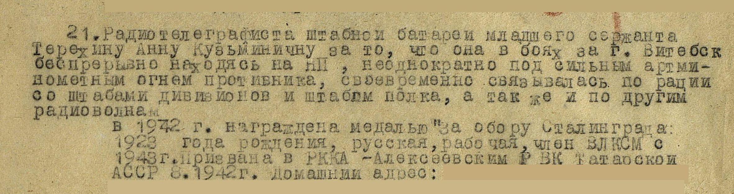ТЕРЁХИНА Анна Кузьминична, 1923, с. Куркуль. Член ВЛКСМ. Мобилизована Алексеевским РВК 6 авг. 1942. Мл. сержант, телеграфист 124 отд. СБр СталФ. Награждена медалью "За оборону Сталинграда". После расформирования бригады служила радистом в 423 АП 158 СД 84 СК 39 А 1 Приб. и 3 БелФ. Награждена медалью "За отвагу". Погибла 26 июля 1944, с. Салеце, похоронена в г. Укмерге ЛитовССР.