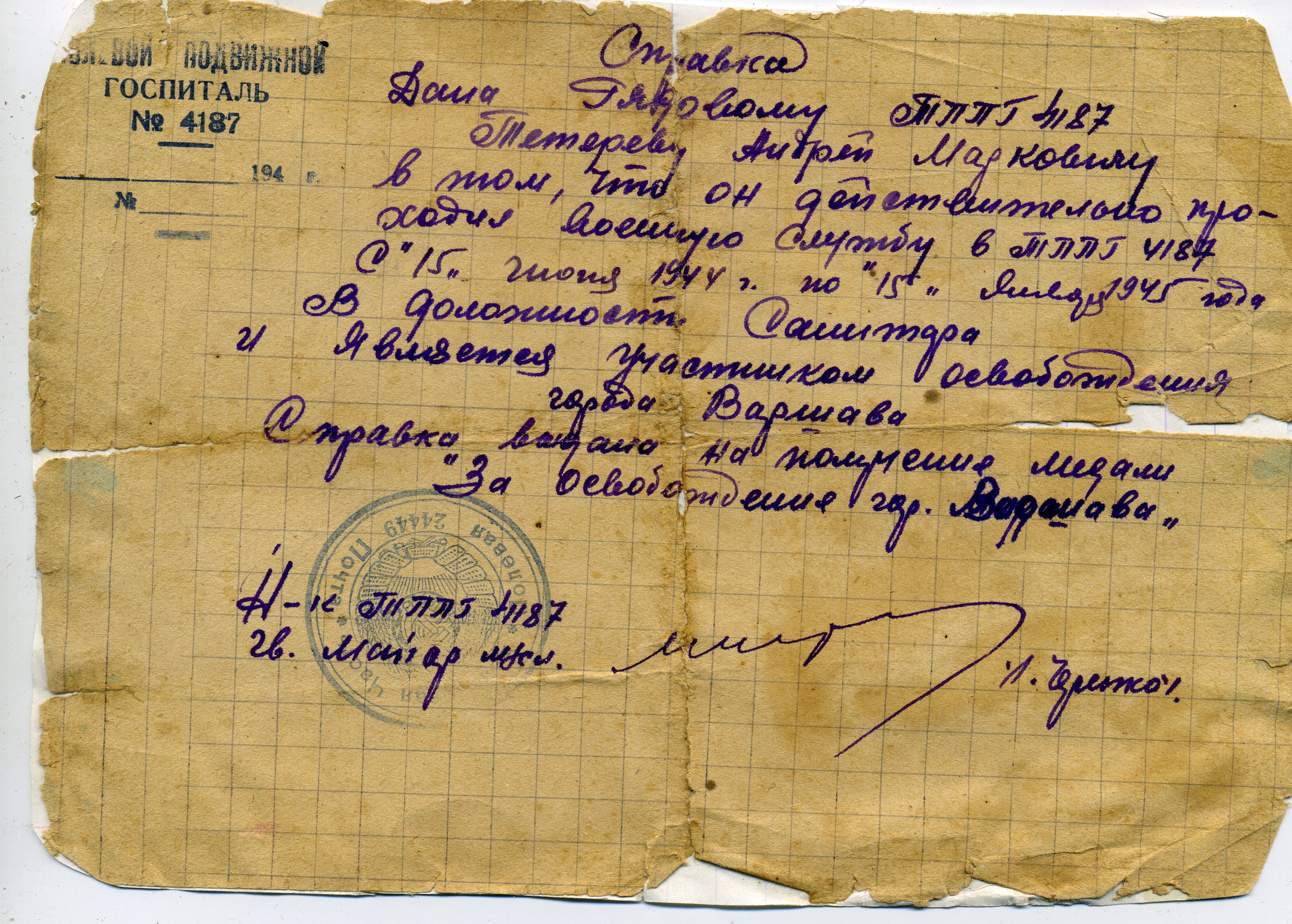 После ранения в 1942 году продолжил службу в полевом подвижном госпитале 4187 санитаром.